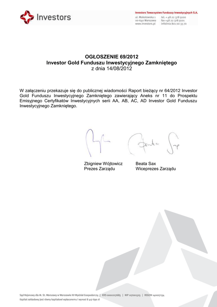 OGŁOSZENIE 69/2012 Investor Gold Funduszu Inwestycyjnego Zamkniętego z dnia 14/08/2012 W załączeniu przekazuje się do publicznej wiadomości Raport bieżący nr 64/2012 Investor Gold Funduszu Inwestycyjnego Zamkniętego zawierający Aneks nr 11 do Prospektu Emisyjnego Certyfikatów Inwestycyjnych serii AA, AB, AC, AD Investor Gold Funduszu Inwestycyjnego Zamkniętego. Zbigniew Wójtowicz Prezes Zarządu Beata Sax Wiceprezes Zarządu INVESTOR GOLD FIZ RB_FI_E 64 2012 korekta KOMISJANADZORUFINANSOWEGO Raport bieżący funduszu inwestycyjnego nr 64 / 2012 (numer kol ejny raportu / rok) Data przekazania: 2012-08-14 Nazwa podmiotu: INVESTOR GOLD FUNDUSZ INWESTYCYJNY ZAMKNIĘTY Temat raportu: Aneks do Prospektu emisyjnego c ertyfikatów inwestyc yjnych serii AA, AB, AC, AD Investor Gol d Funduszu Inwestycyjnego Zamkniętego Podstawa prawna § 42 ust. 1 pkt 37 oie - inne zdarzenia, przewi dzi ane statutem funduszu WIADOMOŚĆ W załączeniu przekazujemy Aneks nr 11 do Prospektu emisyjnego certyfikatów inwestycyjnych serii AA, AB, AC, AD Investor Gold Funduszu Inwestycyjnego Zamkniętego zatwierdzony przez Komisję Nadzoru Finansowego w dniu 13 sierpnia 2012 r. Pli k Opi s Aneks11.2012.08.08_InvGOLD_FIZ.pdf PODPISYOSÓBREPREZENTUJĄCYCHPODMIOT Data Imię i Nazwi sko Stanowisko/Funkcja 2012-08-14 Zbigniew Wój towicz Prezes Zarządu 2012-08-14 Rafał Syska Prokurent Podpis Komisja Nadzoru Finansowego 1 Aneks nr 11 z dnia 8 sierpnia 2012 r. do Prospektu Emisyjnego Certyfikatów Inwestycyjnych serii AA, AB, AC, AD Investor Gold Funduszu Inwestycyjnego Zamkniętego W Prospekcie emisyjnym Certyfikatów Inwestycyjnych serii AA, AB, AC, AD Investor Gold Funduszu Inwestycyjnego Zamkniętego zatwierdzonym przez Komisję Nadzoru Finansowego w dniu 15 marca 2012 r. wprowadza się następujące zmiany: 1) w związku z przekazaniem raportu kwartalnego Funduszu za 2 kwartał 2012 r., w rozdziale 5 w pkt 5.2.2 dodaje się akapity i tabele w brzmieniu: Na podstawie raportu kwartalnego Funduszu za okres od 1 kwietnia 2012 r. do 30 czerwca 2012 r. (dane nieaudytowane) Wybrane informacje finansowe Funduszu w tyś. zł, chyba że wskazano inaczej. Pozycja bilansu 2012/06/30 Aktywa 2011/06/30 152 037 Zobowiązania 263 284 9 547 15 007 142 490 248 277 Kapitał funduszu 78 252 153 780 Dochody zatrzymane 66 215 99 211 Wzrost (spadek) wartości lokat w odniesieniu do ceny nabycia -1 977 -4 714 142 490 248 277 62 076 91 128 2 295,41 2 724,49 Aktywa netto Kapitał funduszu i zakumulowany wynik z operacji Liczba zarejestrowanych certyfikatów inwestycyjnych Wartość aktywów netto na certyfikat inwestycyjny Źródło: raport kwartalny Funduszu (dane nieaudytowane) 2012/06/30 SKŁADNIKI LOKAT Wartość według ceny nabycia w tys. 2011/06/30 Wartość według wyceny na dzień bilansowy w tys. Procentowy udział w aktywach ogółem Wartość według ceny nabycia w tys. 110 501 Akcje 16 955 13 295 8,74 Dłużne papiery wartościowe 97 634 97 821 64,34 582 0,38 - - Instrumenty pochodne * Depozyty ** nie dotyczy - Razem 114 589 111 698 Wartość według wyceny na dzień bilansowy w tys. 105 787 - 73,46 - Procentowy udział w aktywach ogółem 40,18 - 0 0 0,00 52 478 52 478 19,93 162 979 158 265 60,11 Źródło: raport kwartalny Funduszu (dane nieaudytowane) * W związku z ujemną wyceną na dzień 31.03.2012 zaliczane do instrumentów pochodnych transakcje forward zaprezentowane zostały w tabeli uzupełniającej "Instrumenty pochodne" w ujemnej wartości oraz w Bilansie w pozycji: "Zobowiązania", ** Informujemy o zmianie sposobu prezentacji depozytów. Począwszy od 4 kwartału 2011 r. depozyty z terminem zapadalności poniżej 90 dni nie są prezentowane w Tabeli głównej w pozycji: "Depozyty". Zostały natomiast zaprezentowane w Bilansie w pozycji: " Środki pieniężne i ich ekwiwalenty". Rachunek wyniku z operacji Przychody z lokat 1 od 2012/04/01 do 2012/06/30 od 2011/04/01 do 2011/06/30 2 726 1 635 Koszty funduszu 1 299 Koszty funduszu netto 1 299 13 798 Przychody z lokat netto 1 427 -12 163 Zrealizowany i niezrealizowany zysk (strata) -13 422 16 652 Wynik z operacji -11 995 4 489 -193,23 49,26 Wynik z operacji przypadający na certyfikat inwestycyjny w PLN Źródło: raport kwartalny Funduszu (dane nieaudytowane) od 2012/04/01 do 2012/06/30 Rachunek przepływów pieniężnych 13 798 od 2011/04/01 do 2011/06/30 Przepływy środków pieniężnych z działalności operacyjnej -71 379 -1 186 Przepływy środków pieniężnych z działalności finansowej -15 786 -67 762 Skutki zmian kursów wymiany środków pieniężnych i ekwiwalentów środków pieniężnych 1 306 690 Zmiana stanu środków pieniężnych netto (A+/-B) -87 165 -68 948 Środki pieniężne i ekwiwalenty środków pieniężnych na początek okresu sprawozdawczego 121 647 182 874 34 482 113 926 Środki pieniężne i ekwiwalenty środków pieniężnych na koniec okresu sprawozdawczego (E+/-D) Źródło: raport kwartalny Funduszu (dane nieaudytowane) 2) w związku z przekazaniem raportu kwartalnego Funduszu za 2 kwartał 2012 r., w rozdziale 5 w pkt 5.2.3 dodaje się akapity i tabele w brzmieniu: Na podstawie raportu kwartalnego Funduszu za okres od 1 kwietnia 2012 r. do 30 czerwca 2012 r. (dane nieaudytowane) Na dzień 30 czerwca 2012 r. Aktywa Funduszu wynosiły 152.037 tys. zł, na co składały się środki pieniężne i ich ekwiwalenty o wartości 34.482 tys. zł, należności o wartości 5.857 tys. zł, akcje spółek notowanych na rynkach regulowanych o wartości 13.295 tys. zł, dłużne papiery wartościowe o wartości 97.821 zł oraz składniki lokat nienotowane na aktywnym rynku o wartości 582 tys. zł. (obliczenia własne nieaudytowane) Z akcji 13.117 tys. zł ulokowanych było w akcjach spółek surowcowych notowanych na giełdzie TSX w Kanadzie a 178 tys. zł w akcjach spółki surowcowej notowanej na ASX w Sydney, w Australii. Akcje spółek surowcowych notowanych na giełdzie TSX w Kanadzie stanowiły 8,63% aktywów ogółem Funduszu a a