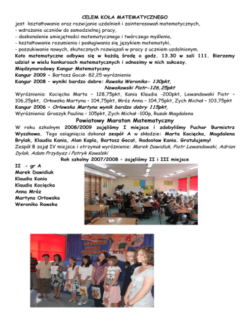CELEM KOŁA MATEMATYCZNEGO jest kształtowanie oraz rozwijanie uzdolnień i zainteresowań matematycznych, - wdrażanie uczniów do samodzielnej pracy, - doskonalenie umiejętności matematycznego i twórczego myślenia, - kształtowanie rozumienia i posługiwania się językiem matematyki, - poszukiwanie nowych, skutecznych rozwiązań w pracy z uczniem uzdolnionym. Koło matematyczne odbywa się w każdą środę o godz. 13.30 w sali 111. Bierzemy udział w wielu konkursach matematycznych i odnosimy w nich sukcesy. Międzynarodowy Kangur Matematyczny Kangur 2009 – Bartosz Gocał- 82,25 wyróżnienie Kangur 2008 – wyniki bardzo dobre: Rawska Weronika- 130pkt, Nowakowski Piotr-126,25pkt Wyróżnienia: Kocięcka Marta – 128,75pkt, Kania Klaudia -200pkt, Lewandowski Piotr – 106,25pkt, Orłowska Martyna – 104,75pkt, Mróz Anna – 104,75pkt, Zych Michał – 103,75pkt Kangur 2006 – Orłowska Martyna wynik bardzo dobry 115pkt, Wyróżnienia: Groszyk Paulina – 105pkt, Zych Michał -100p, Rusak Magdalena Powiatowy Maraton Matematyczny W roku szkolnym 2008/2009 zajęliśmy I miejsce i zdobyliśmy Puchar Burmistrz Wyszkowa. Tego osiągnięcia dokonał zespół A w składzie: Marta Kocięcka, Magdalena Brylak, Klaudia Kania, Alan Kapla, Bartosz Gocał, Radosław Kania. Gratulujemy! Zespół B zajął IV miejsce i otrzymał wyróżnienie: Marek Dawidiuk, Piotr Lewandowski, Adrian Dylak, Adam Przybysz i Patryk Kowalski Rok szkolny 2007/2008 – zajęliśmy II i III miejsce II - gr A Marek Dawidiuk Klaudia Kania Klaudia Kocięcka Anna Mróz Martyna Orłowska Weronika Rawska III – gr B Magdalena Brylak Daniel Brzozowski Piotr Lewandowski Aleksandra Nadaj Piotr Nowakowski Agnieszka Osik Maraton 2006/2007 – zajęliśmy IV i VI miejsce IV miejsce - Gr A op. Jolanta Sarnacka i Anna Markowska Paulina Groszyk Marta Kocięcka Anna Mróz Martyna Orłowska Wiktor Sumliński Katarzyna Wieczorek VI miejsce – Gr B op. Anna Markowska i Agnieszka Pałka Daniel Brzozowski Damian Małkowski Agnieszka Osik Mateusz Rakusiewicz Karol Stryjek Maraton 2005/2006 – zajęliśmy II miejsce Op. Jolanta Sarnacka i Anna Markowska Piotr Drosel Radosław Grajczyk Michał Karp Anna Mróz Marta Orłowska Wiktor Sumliński Multitest - Ogólnopolski konkurs z matematyki Organizatorem jest Centrum Edukacji Szkolnej w Warszawie. W roku szkolnym 2008/2009 udział wzięło 34 uczniów. Wyniki były następujące: Klasa 1 Bartosz Gocał - III miejsce – laureat, nagroda książkowa Aleksander Trol - IV miejsce –laureat, nagroda książkowa Radosław Kania – VI miejsce - laureat Piotr Przybysz – VIII miejsce - laureat Sebastian Sitek – VII miejsce – laureat Justyna Kosiorowska - XV miejsce – wyróżnienie Klasa 2 Klaudia Kania – III miejsce – laureat , nagroda książkowa Weronika Rawska – IV miejsce laureat, nagroda książkowa Sylwia Jończyk – V miejsce, nagroda książkowa Piotr Nowakowski – V miejsce, nagroda książkowa Łukasz Wrzosek – V miejsce, nagroda książkowa Alan Kapla – VIII miejsce, laureat Piotr Lewandowski – X miejsce, laureat Klasa 3 Marta Kocięcka – X miejsce, laureat Natalia Puczyńska – XII miejsce, wyróżnienie Już po raz drugi nasi absolwenci zostali zakwalifikowani do projektu edukacyjnego MAZOWIECKIE TALENTY . Są to: Anna Mróz i Martyna Orłowska (2007/2008) oraz Marta Kocięcka (2008/2009. Projekt jest dotowany przez Urząd Marszałkowski Województwa Mazowieckiego i realizowany przez Mazowieckie Samorządowe Centrum Doskonalenia Nauczycieli Wydział w Ostrołęce. Patronat nad działaniami objęli Marszałek Województwa Mazowieckiego, Mazowiecki Kurator Oświaty, Rektor Uniwersytetu Warszawskiego, Rektor Politechniki Warszawskiej. Projekt MAZOWIECKIE TALENTY to szansa rozwoju dla uczniów, gdyż działania swe koncentruje na: • wyszukiwaniu zdolnych uczniów, organizowaniu dla nich wsparcia merytorycznego i psychologicznego oraz promowaniu ich osiągnięć; • rozwijaniu zdolności kierunkowych uczniów; • zachęcaniu do weryfikacji i zaprezentowania swojej wiedzy i umiejętności w konkursach i olimpiadach. Projekt mazowieckie Talenty jest realizowany od 2008 roku. Obecnie grono młodych ludzi dostrzegających potrzebę rozwijania swoich uzdolnień i zainteresowań liczy 190 osób z całego województwa mazowieckiego. Zajęcia obdywają się w 6-ciu miastach naszego województwa: Ciechanowie, Mińsku Mazowieckim, Ostrołęce, Płocku, Radomiu i Siedlcach. Projekt zakłada: • Różnorodne w formie i treści zajęcia w wymiarze 60 godzin dydaktycznych rocznie (w soboty- 2 razy w miesiącu) • Udział w wycieczkach naukowych. • Spotkania i współpracę z nauczycielami i rodzicami.