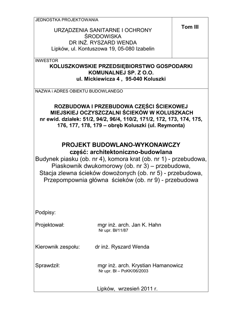JEDNOSTKA PROJEKTOWANIA URZĄDZENIA SANITARNE I OCHRONY ŚRODOWISKA DR INŻ. RYSZARD WENDA Lipków, ul. Kontuszowa 19, 05-080 Izabelin Tom III INWESTOR KOLUSZKOWSKIE PRZEDSIĘBIORSTWO GOSPODARKI KOMUNALNEJ SP. Z O.O. ul. Mickiewicza 4 , 95-040 Koluszki NAZWA i ADRES OBIEKTU BUDOWLANEGO ROZBUDOWA I PRZEBUDOWA CZĘŚCI ŚCIEKOWEJ MIEJSKIEJ OCZYSZCZALNI ŚCIEKÓW W KOLUSZKACH nr ewid. działek: 51/2, 94/2, 96/4, 110/2, 171/2, 172, 173, 174, 175, 176, 177, 178, 179 – obręb Koluszki (ul. Reymonta) PROJEKT BUDOWLANO-WYKONAWCZY część: architektoniczno-budowlana Budynek piasku (ob. nr 4), komora krat (ob. nr 1) - przebudowa, Piaskownik dwukomorowy (ob. nr 3) – przebudowa, Stacja zlewna ścieków dowożonych (ob. nr 5) - przebudowa, Przepompownia główna ścieków (ob. nr 9) - przebudowa Podpisy: Projektował: mgr inż. arch. Jan K. Hahn Nr upr. Bł/11/87 Kierownik zespołu: Sprawdził: dr inż. Ryszard Wenda mgr inż. arch. Krystian Hamanowicz Nr upr. Bł – PoKK/06/2003 Lipków, wrzesień 2011 r. Zawartość opracowania 1. Opis techniczny Budynek piasku (ob. Nr 4) -rzut ścian fundamentowych 1:50 -rzut parteru 1:50 - rzut dachu 1:50 - przekrój A-A,1:50 - elewacje 1:50 rys.1 rys.2 rys.3 rys.4 rys.5 Komora krat (ob. nr 1) – otwór montażowy -rzut przekroje 1:50 rys.1 Stacja zlewna (ob. nr 5 ). – koryto pod sito -rzut, przekroje 1:50 rys.1 Opis techniczny do projektu architektoniczno-budowlanego 1. Budynek piasku ( Obiekt nr 4) 1.Przeznaczenie i program użytkowy. 1.1. Budynek na piasek : - pomieszczenie piasku 1.2. Zestawienie powierzchni: - powierzchnia zabudowy - powierzchnia całkowita - powierzchnia użytkowa - kubatura - 12,10 m 2 2 - 17,10 m 2 - 17,10 m - 12,10 m2 3 - 54,54m 2. Rozwiązania architektoniczno budowlane. 2.2. Projektowany budynek wolnostojący parterowy, niepodpiwniczony w technologii tradycyjnej, przykryty dachem jednospadowym o konstrukcji stalowej. 3. Elementy konstrukcyjne budynku 3.1.Ławy żelbetowe , wylewane z betonu B 20 o wymiarach 0,40x0,40m zbrojone 4∅12 rozdzielczo Ø6 co 30 cm. 3.2.Ściany fundamentowe z bloczków betonowych gr, 25 cm na zaprawie cementowej marki “30”. 3.3.Ściany zewnętrzne nadziemia budynku z bloczków sylikatowych lub pustaków U220 gr 25 cm . 3.4.Ściany konstrukcyjne wewnętrzne- brak 3.5.Nadproża wejściowe, żelbetowe zbrojone dołem 5XØ12 mm co drugi pręt odgięty, górą 2xØ12 mm strzemiona Ø6 co 20 cm przy podporach zgęścić do 10 cm, Beton B20. 3.6.Wieńce żelbetowe wylewane z betonu B 20 25x25 cm zbrojone prętami 4 ∅ 12 ocieplone. 3.7.Dach stalowy, jednospadowy o nachyleniu 9 %: -płatwie stalowe C160 i C120 mocowane do wieńca za pomocą marek stalowych 100x200 mm 3.8. Ściany fundamentowe docieplone styrodurem gr. 7 cm współczynnik U= 0,31 W/m2K. Oszpałdować ściany fundamentowe zaprawą cementową, następnie wykonać izolację w systemie jak np. COMBIFLEX-C2 Schomburg do poziomu 30 cm nad teren a następnie przykleić płyty styroduru z użyciem masy uszczelniającej jak np. COMBIFLEX-C2 Schomburg. powyżej poziomu terenu płyty styroduru montować z użyciem kołków 3 szt/m2 3.9. Ściany zewnętrzne nadziemia budynku- docieplone styropianem (EPS 80-036 i EPS 100-038) gr. 10 cm z oblicowaniem tynkiem cienkowarstwowym sylikatowym w kolorze białym i malowany farbami sylikatowymi wg kolorystyki U= 0,23 W/m2K (k max= 0,55 W/m2K). 4.Wykończenie wewnętrzne i zewnętrzne. 4.1.Stolarka okienna- PCV i drzwiowa – stalowa ocieplona 4.2.Pokrycie dachu – płyty warstwowe gr. 8 cm 4.3.Rynny i rury spustowe z PCV. 4.4.Izolacje: - przeciwwilgociowa pionowa - zaprawa wodoszczelna np. COMBIFLEX-C2 Schomburg - przeciwwilgociowa pozioma - zaprawa wodoszczelna np. AQUAFIN 2K Schomburg - termiczna stropodachu - styropian gr. 8cm 4.5.Tynki - cementowo - wapienne kat. III zatarte na gładko. 4.6.Sufit – płyty warstwowe 4.7.Posadzki - gres 4.8.Ściany malowane farbą emulsyjną w kolorze białym. Gres do wysokości 2,0m w kolorze jasnym. 5.Instalacje 5.1.Ogrzewanie - promiennikowe 5.2.Ciepła woda - brak 5.3.Energia elektryczna – z budynku głównego. 5.4.Woda - z sieci wodociągowej, projektowanym przyłączem. 5.5.Kanalizacja sanitarna - przez przepompownię do reaktora. 5.6.Odprowadzenie wód opadowych - powierzchniowo. 5.7.Urządzenia i instalacje technologiczne wg oddzielnego opracowania. 6.Charakterystyka energetyczna obiektu. 6.1.Zastosowane materiały i projektowane grubości izolacji termicznej spełniają wymagania normatywne wartości współczynnika przenikania ciepła k dla poszczególnych przegród budowlanych. 7.Dane uzupełniające. 7.1.Roboty budowlane prowadzić zgodnie z warunkami technicznymi wykonastwa i odbioru robót budowlano-montażowych”, obowiązującymi normami, sztuką budowlaną, przez osoby uprawnione, zachowując przepisy BHP.Stosować materiały posiadające aktualne aprobaty techniczne. 7.2.W wypadku wystąpienia na poziomie posadowienia nasypów niebudowlanych należy dokonać wymiany gruntu, zagęszczając grunt nasypowy za pomocą zgęszczarki Id=45. Prawidłowość wykonania zagęszczenia musi być odebrana przez osobę posiadającą uprawnienia geologiczne. 7.3.Projekt wykonano zgodnie z obowiązującymi przepisami i decyzją o warunkach zabudowy i zagospodarownia terenu. 2. Komora krat (ob. nr 1) 2. Rozwiązania architektoniczno budowlane. CZĘŚĆ ISTNIEJACA - REMONT 2.1. W części istniejącej budynku wykonać następujące prace budowlane: 2.1.1. Prace rozbiórkowe: - rozebranie istniejącego pokrycia dachu z papy (2x) wraz z ociepleniem – pow. 115,00 m2 - demontaż rynien i rur spustowych – rynna 11,70 m, rura spust 4,20 m - demontaż obróbek blacharskich - dł. 11,70 m - demontaż istniejących drzwi zewnętrznych 100x200 cm – szt.1 - demontaż płyty panwiowej dachu 600x150 cm – 1 szt. - demontaż kątownika w kanałach 40x40 mm – dł 59,88 mb - demontaż płyt pomostowych kanały TROKOTEX – 24,20 m2 - demontaż barierki stalowej – dł. 7,5 m