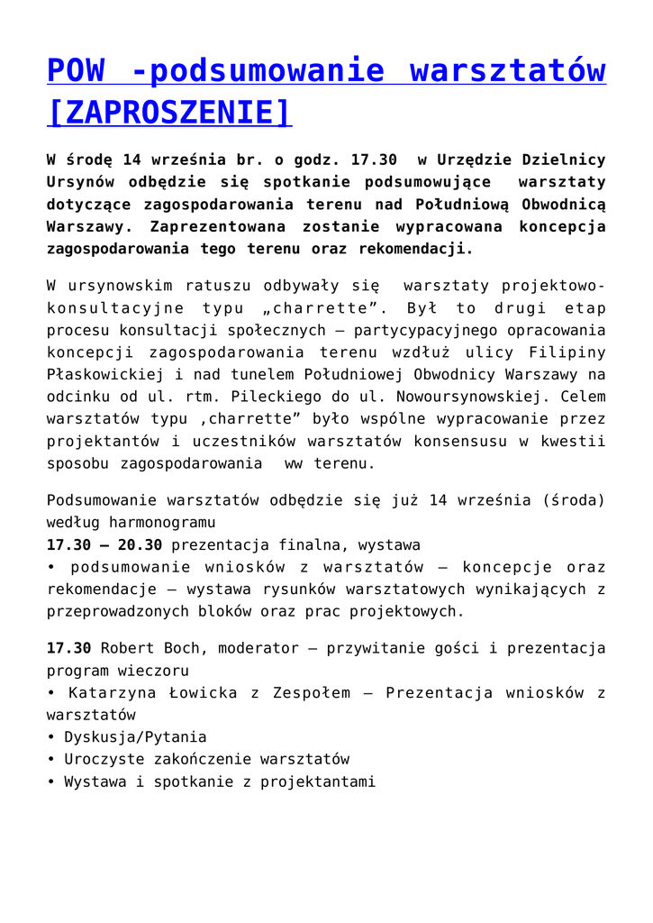 POW -podsumowanie warsztatów [ZAPROSZENIE] W środę 14 września br. o godz. 17.30 w Urzędzie Ursynów odbędzie się spotkanie podsumowujące dotyczące zagospodarowania terenu nad Południową Warszawy. Zaprezentowana zostanie wypracowana zagospodarowania tego terenu oraz rekomendacji. Dzielnicy warsztaty Obwodnicą koncepcja W ursynowskim ratuszu odbywały się warsztaty projektowokonsultacyjne typu „charrette”. Był to drugi etap procesu konsultacji społecznych – partycypacyjnego opracowania koncepcji zagospodarowania terenu wzdłuż ulicy Filipiny Płaskowickiej i nad tunelem Południowej Obwodnicy Warszawy na odcinku od ul. rtm. Pileckiego do ul. Nowoursynowskiej. Celem warsztatów typu ‚charrette” było wspólne wypracowanie przez projektantów i uczestników warsztatów konsensusu w kwestii sposobu zagospodarowania ww terenu. Podsumowanie warsztatów odbędzie się już 14 września (środa) według harmonogramu 17.30 – 20.30 prezentacja finalna, wystawa • podsumowanie wniosków z warsztatów – koncepcje oraz rekomendacje – wystawa rysunków warsztatowych wynikających z przeprowadzonych bloków oraz prac projektowych. 17.30 Robert Boch, moderator – przywitanie gości i prezentacja program wieczoru • Katarzyna Łowicka z Zespołem – Prezentacja wniosków z warsztatów • Dyskusja/Pytania • Uroczyste zakończenie warsztatów • Wystawa i spotkanie z projektantami