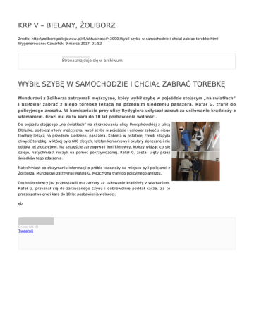 KRP V – BIELANY, ŻOLIBORZ Źródło: http://zoliborz.policja.waw.pl/r5/aktualnosci/43090,Wybil-szybe-w-samochodzie-i-chcial-zabrac-torebke.html Wygenerowano: Czwartek, 9 marca 2017, 01:52 Strona znajduje się w archiwum. WYBIŁ SZYBĘ W SAMOCHODZIE I CHCIAŁ ZABRAĆ TOREBKĘ Mundurowi z Żoliborza zatrzymali mężczyznę, który wybił szybę w pojeździe stojącym „na światłach” i usiłował zabrać z niego torebkę leżącą na przednim siedzeniu pasażera. Rafał G. trafił do policyjnego aresztu. W komisariacie przy ulicy Rydygiera usłyszał zarzut za usiłowanie kradzieży z włamaniem. Grozi mu za to kara do 10 lat pozbawienia wolności. Do pojazdu stojącego „na światłach” na skrzyżowaniu ulicy Powązkowskiej z ulicą Elbląską, podbiegł młody mężczyzna, wybił szybę w pojeździe i usiłował zabrać z niego torebkę leżącą na przednim siedzeniu pasażera. Kobieta w ostatniej chwili zdążyła chwycić torebkę, w której było 600 złotych, telefon komórkowy i okulary słoneczne i nie oddała jej złodziejowi. Na szczęście zareagowali inni kierowcy, którzy widząc co się dzieje, natychmiast ruszyli na pomoc pokrzywdzonej. Rafał G. został ujęty przez świadków tego zdarzenia. Natychmiast po otrzymaniu informacji o próbie kradzieży na miejscu byli policjanci z Żoliborza. Mundurowi zatrzymali Rafała G. Mężczyzna trafił do policyjnego aresztu. Dochodzeniowcy już przedstawili mu zarzuty za usiłowanie kradzieży z włamaniem. Rafał G. przyznał się do zarzucanego czynu i dobrowolnie poddał karze. Za to przestępstwo grozi kara do 10 lat pozbawienia wolności. eb Ocena: 0/5 (0) Tweetnij