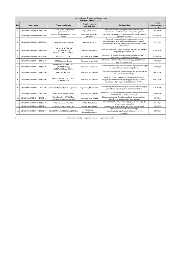 Lista podpisanych umów o dofinansowanie Działanie 8.2 PO IG - I/2012 Lp. Numer umowy 1. UDA-POIG.08.01.00-02-152/12-00 Nazwa beneficjenta Siedziba (miasto, województwo) SAFETY Spółka z ograniczoną odpowiedzialnością Centrum badawczo-naukowe Artur Jackowski Bydgoszcz, Kujawskopomorskie Krępice, Dolnośląskie Tytuł projektu Stworzenie automatycznego narzędzia zapewniającego kompleksowe i interdyscyplinarne zarządzanie ryzykiem Stworzenie internetowego systemu nauki matematyki i rozwoju procesów myślenia. Stworzenie systemu informatycznego obsługi serwisu samochodowego, repozytorium części i usług serwisowych z elektronicznym obiegiem informacji z właścicielami pojazdów serwisowanych. Kwota dofinansowania w PLN 489 860,00 2. UDA-POIG.08.01.00-04-110/12-00 3. UDA-POIG.08.01.00-10-128/12-00 Kodegenix Jakub Chłapiński Koluszki, Łódzkie 4. UDA-POIG.08.01.00-12-118/12-00 TMB TECH SPÓŁKA Z OGRANICZONĄ ODPOWIEDZIALNOŚCIĄ Kraków, Małopolskie 5. UDA-POIG.08.01.00-14-101/12-00 DELIVER Sp. z o.o. Warszawa, Mazowieckie 6. UDA-POIG.08.01.00-14-140/12-00 FXIT Krzysztof Kozera Warszawa, Mazowieckie 7. UDA-POIG.08.01.00-14-142/12-00 EMAMONA.PL SPÓŁKA Z OGRANICZONĄ ODPOWIEDZIALNOŚCIĄ Warszawa, Mazowieckie Stworzenie internetowej platformy automatycznych pożyczek, opłat za rachunki i sprawdzenia wiarygodności. 490 000,00 8. UDA-POIG.08.01.00-14-153/12-00 INFOSEB Sp. z o.o. Warszawa, Mazowieckie Utworzenie internetowego systemu zarządzania procesami BHP oraz systememu e-learningu. 486 787,00 9. UDA-POIG.08.01.00-14-194/12-00 POINT-OF-CARE GRAŻYNA POLKOWSKA Warszawa, Mazowieckie MEDTRIP.PL - serwis promujący Polskę jako cel turystyki medycznej i wszechstronnie wspomagający procesy związane z organizacją pobytu zagranicznych pacjentów w Polsce. 444 150,00 10. UDA-POIG.08.01.00-14-211/12-00 EMOTION MEDIA Pamela Magierowska Legionowo, Mazowieckie Stworzenie platformy internetowej dla rodziców, umożliwiającej prowadzenie prywatnej strony internetowej dziecka 526 160,00 11. UDA-POIG.08.01.00-14-252/12-00 MindOnLine Andrzej Dłubak Warszawa, Mazowieckie 12. UDA-POIG.08.01.00-14-280/12-00 Nieruchomości MSW Spółka z ograniczoną odpowiedzialnością Warszawa, Mazowieckie 13. UDA-POIG.08.01.00-24-122/12-00 4improve, Anna Mrozińska Bielsko-Biała, Śląskie 14. UDA-POIG.08.01.00-30-118/12-00 JOWIN JOANNA WINIECKA Poznań, Wielkopolskie KREDYTUM.PL SPÓŁKA AKCYJNA Kołobrzeg, Zachodniopomorskie 15. UDA-POIG.08.01.00-32-108/12-00 iEnroll.pl - innowacyjny system służący do rekrutacji pracowników i diagnozujący ich kwalifikacje. DELIVER: system inteligentnego kojarzenia Zleceniodawcy ze Zleceniobiorcą w czasie rzeczywistym Stworzenie platformy internetowej wspierającej podejmowanie decyzji inwestycyjnych SCORE IT - e-usługa umożliwiająca mobilne ankietowanie i badanie opinii klientów za pomocą kodów QR. Zintegrowany system obsługi i zarządzania nieruchomościami Interaktywna Administracja Nieruchomości Stworzenie internetowego innowacyjnego serwisu e-usług do aktywnej nauki matematyki Automatyczne internetowe porady i kursy psychologiczne Stworzenie serwisu Kredytomarket.pl umozliwiajacego e-pośrednictwo finansowe nowej generacji. Lista będzie na bieżąco uzupełniana w miarę podpisywanych umów 490 000,00 395 756,67 459 620,00 490 000,00 471 800,00 396 080,00 489 930,00 487 418,77 560 000,00 488 897,50