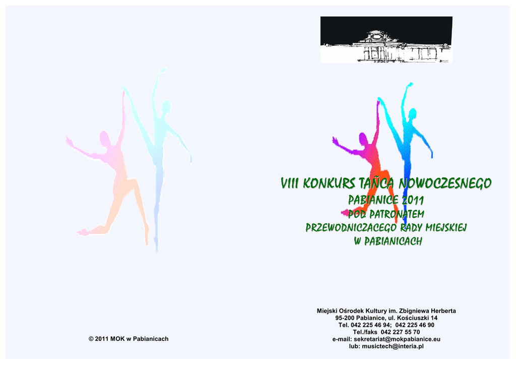 VIII KONKURS TAÑCA NOWOCZESNEGO PABIANICE 2011 POD PATRONATEM PRZEWODNICZACEGO RADY MIEJSKIEJ W PABIANICACH © 2011 MOK w Pabianicach Miejski Ośrodek Kultury im. Zbigniewa Herberta 95-200 Pabianice, ul. Kościuszki 14 Tel. 042 225 46 94; 042 225 46 90 Tel./faks 042 227 55 70 e-mail: [email protected] lub: [email protected] - Uczestnik Konkursu moŜe być członkiem tylko jednego prezentującego się zespołu. Wiek najstarszego uczestnika kwalifikuje dany zespół do odpowiedniej kategorii wiekowej. ORGANIZATOR Miejski Ośrodek Kultury im. Zbigniewa Herberta w Pabianicach CELE IMPREZY - Konfrontacja dorobku artystycznego zespołów tanecznych - Popularyzacja róŜnorodnych form tanecznych i ich walorów wychowawczych - Integracja osób i grup tanecznych tworzących i upowszechniających kulturę taneczną w środowisku jako alternatywna forma spędzania wolnego czasu. - Wymiana pomysłów i doświadczeń oraz inspiracja do poszukiwań nowych form tanecznych - Rozwijanie wraŜliwości estetycznej młodzieŜy poprzez bezpośredni kontakt z tańcem. TERMIN I PRZEBIEG IMPREZY VIII Konkurs Tańca Nowoczesnego Pabianice 2011 odbędzie się w Miejskim Ośrodku Kultury im. Zbigniewa Herberta w Pabianicach 16.04.2011r. tj. SOBOTA od godz. 9:00 – próba sceny od godz. 11:00 – prezentacje programów konkursowych przerwa i obrady Jury ogłoszenie wyników WARUNKI I ZASADY UCZESTNICTWA - W konkursie mogą uczestniczyć zespoły taneczne róŜnych form (inscenizacja taneczna, widowisko taneczne, miniatura itd.) - Zespoły mogą zaprezentować jeden lub dwa układy taneczne o łącznym czasie 10 min. - Organizator przewiduje podział na kategorie konkursowe - do 12 lat - 13 – 15 lat - powyŜej 15 lat - Zespoły zobowiązane są do przygotowania nagrań dobrej jakości (płyta CD, płytka MD) na jednym nośniku! Warunkiem uczestnictwa w Konkursie jest: - przesłanie czytelnie wypełnionej (PISMO DRUKOWANE) karty uczestnictwa na adres MOK w Pabianicach w terminie do 05.04.2011r. - oraz dołączenie kopii dowodu wpłaty opłaty akredytacyjnej - Opłata akredytacyjna: - zespoły do 10 osób – 100 zł - zespoły powyŜej 10 osób - 10,00 zł od kaŜdego członka zespołu - Wpłaty naleŜy dokonać na konto Miejskiego Ośrodka Kultury im. Zbigniewa Herberta w Pabianicach ING Bank Śląski S.A. nr: 03 1050 1461 1000 0023 4598 3478 UWAGA – uregulowanie opłaty akredytacyjnej jest moŜliwe w dniu konkursu najpóźniej na godzinę przed prezentacją konkursową KRYTERIA OCENY - Organizator powoła profesjonalne JURY, które dokona oceny biorąc pod uwagę następujące kryteria: - technikę wykonania i dobór repertuaru - opracowanie choreograficzne - ogólny wyraz artystyczny - harmonię ruchu, stopień trudności - JURY przyzna: - GRAND PRIX - niezaleŜnie od kategorii – nagrodę Przewodniczącego Rady Miejskiej w Pabianicach - nagrody i wyróŜnienia (w kaŜdej kategorii wiekowej) UWAGI KOŃCOWE - Organizator zapewnia sprzęt nagłaśniający i oświetleniowy. - Organizator nie pokrywa kosztów podróŜy uczestników konkursu - Uczestnicy Konkursu mogą oglądać prezentacje na widowni. - Scena „pudełkowa” o wymiarach 7m x 6m