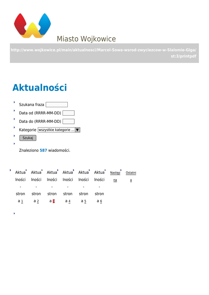 Miasto Wojkowice http://www.wojkowice.pl/main/aktualnosci/Marcel-Sowa-wsrod-zwyciezcow-w-Slalomie-Giga/ st:3/printpdf Aktualności Szukana fraza Data od (RRRR-MM-DD) Data do (RRRR-MM-DD) Kategorie wszystkie kategorie ... ▼ Szukaj Znaleziono 587 wiadomości. Aktua Aktua Aktua Aktua Aktua Aktua Następ Ostatni lności lności lności lności lności lności na a - - - - - - stron stron stron stron stron stron a1 a2 a3 a4 a5 a6 2017-01-31 Koncert Jerzego Połomskiego w Miejskim Ośrodku Kultury w Wojkowicach kategoria: Wojkowice „Cała sala śpiewa z nami...” - to ponadczasowy przebój piosenkarza, artysty estradowego i aktora, Jerzego Połomskiego, który od lat porywa publiczność do wspólnego śpiewania oraz biesiadowania , a wkrótce zawita również do Miejskiego Ośrodka Kultury w Wojkowicach. Na koncert artysty zapraszamy serdecznie 4 marca o godz. 17.00. Bilety w cenie 25 zł będą do nabycia w kasie MOK-u. 2017-01-31 Spotkanie ze znaną teatralną i serialową aktorką – Marzeną Kipiel-Sztuką! kategoria: Wojkowice Już wkrótce Miejski Ośrodek Kultury w Wojkowicach zaprasza na wieczór z gwiazdą, aktorką, która zawdzięcza swoją popularność roli Halinki Kiepskiej w serialu Świat według Kiepskich, Marzeną Kipiel-Sztuką. Spotkanie odbędzie się w niedzielę 12 lutego o godz. 17:00 w MOK-u, a bilety na to wydarzenie w cenie 10 zł będą do nabycia w kasie Miejskiego Ośrodka Kultury w Wojkowicach. 2017-01-31 kategoria: Wspólne kolędowanie już za nami Wojkowice W niedziele, 29 stycznia 2017 roku, w Sali widowiskowej Wojkowickiego Miejskiego Ośrodka Kultury zabrzmiały nie tylko najpiękniejsze polskie kolędy ale i cała masa mniej lub bardziej znanych pastorałek. 2017-01-31 „Magiczne Święta” na zakończenie Ferii Zimowych kategoria: Wojkowice Ostatni dzień ferii zimowych dzieci biorące udział w akcji ferie w mieście, spędziły w przytulnych wnętrzach Kina Nowość w Będzinie. Wśród zapachu popcornu, zatopieni w kinowych fotelach uczestnicy seansu mogli przenieść się wprost do magicznej Doliny Rycerzy. Niesamowite wrażenia oraz salwy śmiechu wywołał wśród widzów film pt. „Magiczne Święta. 2017-01-30 kategoria: Rekrutacja uczestników do projektu Wojkowice Miejski Ośrodek Pomocy Społecznej w Wojkowicach zaprasza do udziału w projekcie systemowym „Inwestycja w człowieka środkiem do osiągnięcia efektów społecznych” współfinansowanego przez Unię Europejską w ramach Regionalnego Programu Operacyjnego Województwa Śląskiego na lata 2014-2020. 2017-01-27 Konsultacje społeczne w sprawie eksploatacji instalacji, w których następuje spalanie paliw kategoria: Wojkowice Konsultacje społeczne projektu uchwały Sejmiku Województwa Śląskiego w sprawie wprowadzenia na obszarze województwa śląskiego ograniczeń w zakresie eksploatacji instalacji, w których następuje spalanie paliw. 2017-01-26 kategoria: Apel do hodowców drobiu Wojkowice Zapraszamy do zapoznania się z treścią apelu, który wystosował do hodowców drobiu Minister Rolnictwa Rozwoju i Wsi oraz Główny Lekarz Weterynarii. 2017-01-25 Wspólne kolędowanie w Wojkowicach kategoria: Wojkowice Już w najbliższą niedziele, 29 stycznia 2017 roku, w Sali widowiskowej Wojkowickiego Miejskiego Ośrodka Kultury znów zabrzmią najpiękniejsze polskie kolędy. 2017-01-25 kategoria: Wojkowiccy Seniorzy w akcji! Wojkowice Grupa teatralna „Agrafka” działająca przy Miejskim Ośrodku Kultury nie raz zaskakiwała nas swoimi pomysłami i kreatywnością, udowodniła również, że z pasją można zawojować „świat” wygrywając przegląd teatralny w Oświęcimiu. W minioną sobotę, 21 stycznia podziwialiśmy w Miejskim Ośrodku Kultury w Wojkowicach wyśmienity występ grupy seniorów pod kierunkiem instruktora warsztatów teatralnych – Piotra Charczuka. 2017-01-18 Wyniki wyborów do Wojkowickiej Rady Seniorek i Seniorów kategoria: Wojkowice W załączeniu wyniki wyborów do Wojkowickiej Rady Seniorek i Seniorow Aktua Aktua Aktua Aktua Aktua Aktua Następ Ostatni lności lności lności lności lności lności na a - - - - - - stron stron stron stron stron stron a1 a2 a3 a4 a5 a6