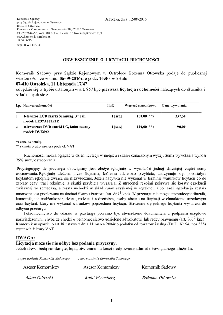 Komornik Sądowy przy Sądzie Rejonowym w Ostrołęce Bożenna Otłowska Kancelaria Komornicza ul. Goworowska 2B, 07-410 Ostrołęka tel. (29)7644753, kom. 884 801 601 e-mail: [email protected] www.komornik.ostroleka.pl Kms 36/15 Ostrołęka, dnia 12-08-2016 sygn. II W 1128/14 OBWIESZCZENIE O LICYTACJI RUCHOMOŚCI Komornik Sądowy przy Sądzie Rejonowym w Ostrołęce Bożenna Otłowska podaje do publicznej wiadomości, że w dniu 06-09-2016r. o godz. 10:00 w lokalu: 07-410 Ostrołęka, 11 Listopada 17/47 odbędzie się w trybie ustalonym w art. 867 kpc pierwsza licytacja ruchomości należących do dłużnika i składających się z: _______________________________________________________________________________________________________________________ Lp. Nazwa ruchomości Ilość Wartość szacunkowa Cena wywołania _________________________________________________________________________________________________________________________ 1. 2. telewizor LCD marki Samsung, 37 cali model: LE37A551P2R odtwarzacz DVD marki LG, kolor czarny model: DVX692 1 [szt.] 450,00 **) 337,50 1 [szt.] 120,00 **) 90,00 _______________________________________________________________________________________________________________________ *) cena za sztukę **) kwota brutto zawiera podatek VAT Ruchomości można oglądać w dzień licytacji w miejscu i czasie oznaczonym wyżej. Suma wywołania wynosi 75% sumy oszacowania. Przystępujący do przetargu obowiązany jest złożyć rękojmię w wysokości jednej dziesiątej części sumy oszacowania. Rękojmię złożoną przez licytanta, któremu udzielono przybicia, zatrzymuje się; pozostałym licytantom rękojmię zwraca się niezwłocznie. Jeżeli nabywca nie wykonał w terminie warunków licytacji co do zapłaty ceny, traci rękojmię, a skutki przybicia wygasają. Z utraconej rękojmi pokrywa się koszty egzekucji związanej ze sprzedażą, a reszta wchodzi w skład sumy uzyskanej w egzekucji albo jeżeli egzekucja została umorzona jest przelewana na dochód Skarbu Państwa (art. 8671 kpc). W przetargu nie mogą uczestniczyć: dłużnik, komornik, ich małżonkowie, dzieci, rodzice i rodzeństwo, osoby obecne na licytacji w charakterze urzędowym oraz licytant, który nie wykonał warunków poprzedniej licytacji. Stawienie się jednego licytanta wystarcza do odbycia przetargu. Pełnomocnictwo do udziału w przetargu powinno być stwierdzone dokumentem z podpisem urzędowo poświadczonym, chyba że chodzi o pełnomocnictwo udzielone adwokatowi lub radcy prawnemu (art. 8672 kpc) Komornik w oparciu o art.18 ustawy z dnia 11 marca 2004r o podatku od towarów i usług (Dz.U. Nr 54, poz.535) wystawia faktury VAT. UWAGA: Licytacja może się nie odbyć bez podania przyczyny. Jeżeli drzwi będą zamknięte, będą otwierane na koszt i odpowiedzialność obowiązanego dłużnika. z upoważnienia Komornika Sądowego Asesor Komorniczy Adam Otłowski z upoważnienia Komornika Sądowego Asesor Komorniczy Rafał Wytenberg 1 Komornik Sądowy Bożenna Otłowska