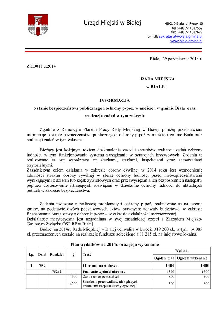 Urząd Miejski w Białej 48-210 Biała, ul Rynek 10 tel.:+48 77 4387552 fax: +48 77 4387679 e-mail: [email protected] www.biala.gmina.pl Biała, 29 październik 2014 r. ZK.0011.2.2014 RADA MIEJSKA w BIAŁEJ INFORMACJA o stanie bezpieczeństwa publicznego i ochrony p-poż. w mieście i w gminie Biała oraz realizacja zadań w tym zakresie Zgodnie z Ramowym Planem Pracy Rady Miejskiej w Białej, poniżej przedstawiam informację o stanie bezpieczeństwa publicznego i ochrony p-poż w mieście i gminie Biała oraz realizacji zadań w tym zakresie. Bieżący jest kolejnym rokiem doskonalenia zasad i sposobów realizacji zadań ochrony ludności w tym funkcjonowania systemu zarządzania w sytuacjach kryzysowych. Zadania te realizowane są we współpracy ze służbami, strażami, inspekcjami oraz samorządami terytorialnymi. Zasadniczym celem działania w zakresie obrony cywilnej w 2014 roku jest wzmocnienie zdolności struktur obrony cywilnej w sferze ochrony ludności przed niebezpieczeństwami wynikającymi z działań lub klęsk żywiołowych oraz przezwyciężania ich bezpośrednich następstw poprzez dostosowanie istniejących rozwiązań w dziedzinie ochrony ludności do aktualnych potrzeb w zakresie bezpieczeństwa. Zadania związane z realizacją problematyki ochrony p-poż, realizowane są na terenie gminy, na podstawie dwóch podstawowych aktów prawnych: uchwały budżetowej w zakresie finansowania oraz ustawy o ochronie p-poż – w zakresie działalności merytorycznej. Działalność merytoryczna jest uzgadniana w swej zasadniczej części z Zarządem MiejskoGminnym Związku OSP RP w Białej. Budżet na 2014r., Rada Miejskiej w Białej uchwaliła w kwocie 319 200.zł., w tym 14 985 zł. przeznaczonych zostało na realizację funduszu sołeckiego a 11 215 zł. na inicjatywę lokalną. Plan wydatków na 2014r. oraz jego wykonanie Lp. 1 Dział Rozdział § 752 Treść Obrona narodowa 75212 4300 4700 Pozostałe wydatki obronne Zakup usług pozostałych Szkolenia pracowników niebędących członkami korpusu służby cywilnej Wydatki Ogółem plan Ogółem wykonanie 1300 1300 1300 800 1300 800 500 500 2 Bezpieczeństwo publiczne i ochrona przeciwpożarowa 754 4430 Ochotnicze straże pożarne Różne wydatki na rzecz osób fizycznych Nagrody o charakterze szczególnym niezaliczone do wynagrodzeń Wynagrodzenia osobowe pracowników Dodatkowe wynagrodzenie roczne Składki na ubezpieczenia społeczne Składki na Fundusz Pracy Wynagrodzenia bezosobowe Zakup materiałów i wyposażenia Zakup energii Zakup usług remontowych Zakup usług zdrowotnych Zakup usług pozostałych Opłaty z tytułu usług telekomunikacyjnych telefonii komórkowej Opłaty z tytułu usług telekomunikacyjnych telefonii stacjonarnej Różne opłaty i składki 6050 Wydatki inwestycyjne jednostek budżetowych 75412 3030 3040 4010 4040 4110 4120 4170 4210 4260 4270 4280 4300 4360 4370 319.200 173.460 319.200 18 000 5000 2 000 960 3 000 0 7000 2000 38000 53400 71000 30 000 1500 10000 0 0 480 0 10700 50400 27000 13600 0 5850 300 200 1000 720 15000 3250 67000 65300 W powyższych środkach finansowych ujęte zostały zadania realizowane zgodnie z zadaniami określonymi przez poszczególne sołectwa w ramach funduszu sołeckiego na łączną kwotę 14.985 zł. (w tym wydatki bieżące 8.200 zł., majątkowe 6.785 zł.) oraz inicjatywy lokalnej w kwocie 11.215 zł. (wydatki majątkowe) W trakcie roku nastąpiło zwiększenie budżetu po stronie inwestycji o kwotę 47.000 zł. na zakup oraz karosację samochodu pożarniczego dla OSP Biała - zrealizowane 28.500 zł. (zakupiono samochód) Jednostki należące do Krajowego Systemu Ratowniczo - Gaśniczego tj. Biała i Chrzelice, otrzymały dotację na swoja działalność, która jest proporcjonalna do ilości wyjazdów, w ramach tej dotacji w/w jednostki indywidualnie zakupują i remontują posiadany sprzęt. W 2014r. Biała otrzymała 9 050zł., natomiast Chrzelice 6 300 zł. Kupując sprzęt w Oddziale Wojewódzkim ZOSP RP jednostki z naszej gminy również uzyskują wsparcie jakim jest dotacja Wojewódzkiego Funduszu Ochrony Środowiska i Gosp. Wodnej. Z roku na rok potrzeby jednostek OSP rosną, rozwija się baza zarówno posiadanego sprzętu jak i zaplecza w postaci remiz, które z upływem czasu stają się wizytówką gminy w każdej miejscowości. Świetlice mieszczące się w remizach to praktycznie jedyne miejsca gdzie miejscowa ludność a w szczególności młodzież może się spotkać i spędzić wolny czas, a to z kolei związane jest z coraz większymi kosztami energii. Fundusz sołecki bardzo korzystnie wpłynął na poprawę wizerunku obiektów OSP. Ważniejsze zadania zrealizowane w 2014r.: Pilarka ratownicza STIHL dla OSP Łącznik: 4 320 zł., w tym dotacja: 1000 zł, fundusz sołecki: 3 000 zł., budżet: 320 zł. Aparaty powietrzne dla OSP Biała: 8 000 zł., w tym KSRG: 4 000 zł., budżet: 4 000 zł. Motopompa szlamowa dla OSP Chrzelice: 4 849,20 zł., w tym: KSRG: 2 700 zł., budżet: 2149,20 zł. Radiotelefon samochodowy MOTOROLA dla OSP Józefów: 1 798,20, w tym dotacja: 800 zł, budżet: 998,20 zł. Buty specjalne, kominiarki, rękawice dla jednostek OSP: 22 596,84 zł., w tym dotacja: 9 240 zł., budżet: 13 356,84 zł. Ubrania specjalne oraz koszarowe dla jednostek OSP: 8 200 zł. Przeglądy okresowe budynków OSP: 2 400 zł. - Syrena alarmowa dla sołectwa Solec: 2 430,00 zł. Dopłata do remontu remizy OSP Olbrachcice: 6 000 zł. Wykonanie posadzki w garażu OSP Grabina: budżet: 5 000 zł. Materiały budowlane – rozbudowa OSP Łącznik: 5 000 zł. (fundusz) W trakcie realizacji z udziałem środków z funduszu sołeckiego: ocieplenie budynku remizy OSP Olbrachcice oraz Prężyna wraz z wymianą bramy garażowej ( brama: 7 860 zł.) Dalsze prace przy rozbudowie remizy OSP Łącznik (zakończenie 2015r.) Ponadto w ramach środków z inicjatywy lokalnej, funduszu sołeckiego, wkładu własnego i budżetu OSP: Wymiana pokrycia dachowego remizy