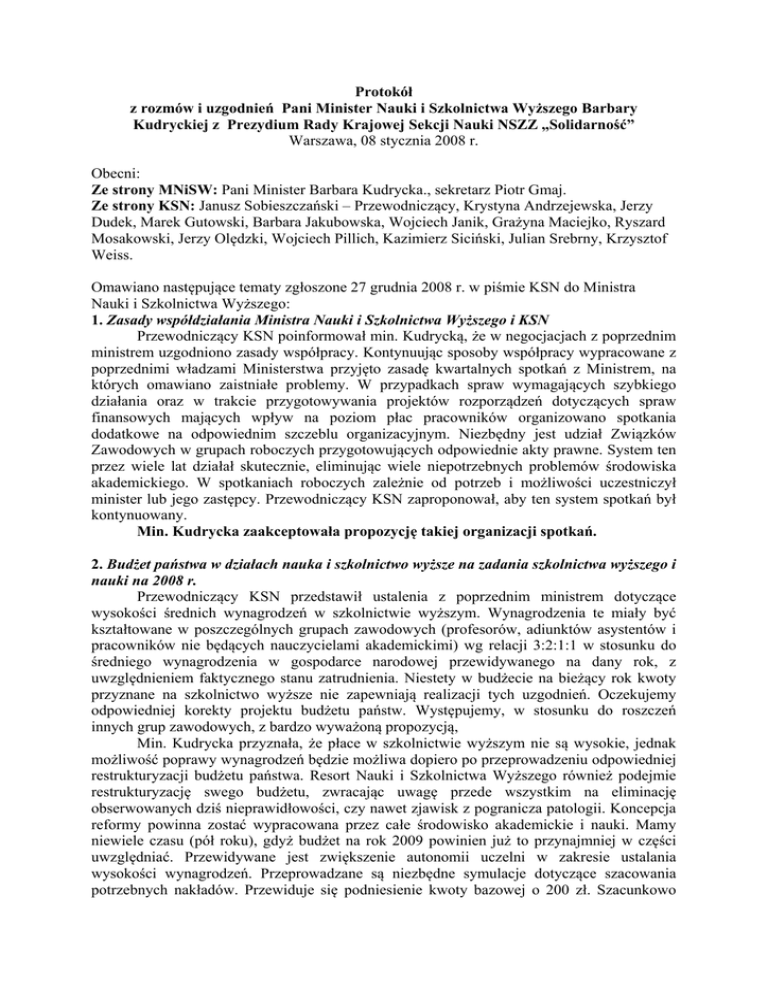 Protokół z rozmów i uzgodnień Pani Minister Nauki i Szkolnictwa Wyższego Barbary Kudryckiej z Prezydium Rady Krajowej Sekcji Nauki NSZZ „Solidarność” Warszawa, 08 stycznia 2008 r. Obecni: Ze strony MNiSW: Pani Minister Barbara Kudrycka., sekretarz Piotr Gmaj. Ze strony KSN: Janusz Sobieszczański – Przewodniczący, Krystyna Andrzejewska, Jerzy Dudek, Marek Gutowski, Barbara Jakubowska, Wojciech Janik, Grażyna Maciejko, Ryszard Mosakowski, Jerzy Olędzki, Wojciech Pillich, Kazimierz Siciński, Julian Srebrny, Krzysztof Weiss. Omawiano następujące tematy zgłoszone 27 grudnia 2008 r. w piśmie KSN do Ministra Nauki i Szkolnictwa Wyższego: 1. Zasady współdziałania Ministra Nauki i Szkolnictwa Wyższego i KSN Przewodniczący KSN poinformował min. Kudrycką, że w negocjacjach z poprzednim ministrem uzgodniono zasady współpracy. Kontynuując sposoby współpracy wypracowane z poprzednimi władzami Ministerstwa przyjęto zasadę kwartalnych spotkań z Ministrem, na których omawiano zaistniałe problemy. W przypadkach spraw wymagających szybkiego działania oraz w trakcie przygotowywania projektów rozporządzeń dotyczących spraw finansowych mających wpływ na poziom płac pracowników organizowano spotkania dodatkowe na odpowiednim szczeblu organizacyjnym. Niezbędny jest udział Związków Zawodowych w grupach roboczych przygotowujących odpowiednie akty prawne. System ten przez wiele lat działał skutecznie, eliminując wiele niepotrzebnych problemów środowiska akademickiego. W spotkaniach roboczych zależnie od potrzeb i możliwości uczestniczył minister lub jego zastępcy. Przewodniczący KSN zaproponował, aby ten system spotkań był kontynuowany. Min. Kudrycka zaakceptowała propozycję takiej organizacji spotkań. 2. Budżet państwa w działach nauka i szkolnictwo wyższe na zadania szkolnictwa wyższego i nauki na 2008 r. Przewodniczący KSN przedstawił ustalenia z poprzednim ministrem dotyczące wysokości średnich wynagrodzeń w szkolnictwie wyższym. Wynagrodzenia te miały być kształtowane w poszczególnych grupach zawodowych (profesorów, adiunktów asystentów i pracowników nie będących nauczycielami akademickimi) wg relacji 3:2:1:1 w stosunku do średniego wynagrodzenia w gospodarce narodowej przewidywanego na dany rok, z uwzględnieniem faktycznego stanu zatrudnienia. Niestety w budżecie na bieżący rok kwoty przyznane na szkolnictwo wyższe nie zapewniają realizacji tych uzgodnień. Oczekujemy odpowiedniej korekty projektu budżetu państw. Występujemy, w stosunku do roszczeń innych grup zawodowych, z bardzo wyważoną propozycją, Min. Kudrycka przyznała, że płace w szkolnictwie wyższym nie są wysokie, jednak możliwość poprawy wynagrodzeń będzie możliwa dopiero po przeprowadzeniu odpowiedniej restrukturyzacji budżetu państwa. Resort Nauki i Szkolnictwa Wyższego również podejmie restrukturyzację swego budżetu, zwracając uwagę przede wszystkim na eliminację obserwowanych dziś nieprawidłowości, czy nawet zjawisk z pogranicza patologii. Koncepcja reformy powinna zostać wypracowana przez całe środowisko akademickie i nauki. Mamy niewiele czasu (pół roku), gdyż budżet na rok 2009 powinien już to przynajmniej w części uwzględniać. Przewidywane jest zwiększenie autonomii uczelni w zakresie ustalania wysokości wynagrodzeń. Przeprowadzane są niezbędne symulacje dotyczące szacowania potrzebnych nakładów. Przewiduje się podniesienie kwoty bazowej o 200 zł. Szacunkowo 2 określono konieczność podniesienia nakładów na szkolnictwo wyższe na około 650 mln zł. Rząd „na dziś” nie przewiduje wzrostu finansowania szkolnictwa wyższego. Resort nauki i szkolnictwa wyższego jest jednym z trzech, którym nie obniżono nakładów. Trzeba to traktować jako sukces. Min. Kudrycka liczy na pomoc KSN przy opracowaniu systemu uzdrawiającego naukę i szkolnictwo wyższe w Polsce. Stwierdziła, że środowisko naukowe powinno dostrzegać zalety restrukturyzacji i wyraźniej włączać się w procesy towarzyszące (łączenie się mniejszych jednostek, prywatyzacja, niekiedy likwidacja). Zadeklarowała chęć podwyższenia nakładów na naukę w celu podwyższenia jakości badań ale również dla podwyższenia zarobków pracowników naukowych. W dyskusji przedstawiciele KSN podnosili, że środki finansowe z budżetu państwa na oczekiwany poziom wynagrodzeń pracowników wyższych uczelni państwowych są gwarantowany przez ustawę: „Nie chcemy nic nowego. Chcemy, aby zostało zrealizowane to, do czego zobowiązała się poprzednia ekipa”. W danych statystycznych, którymi operuje Ministerstwo, występują nieścisłości polegające na tym, że w wysokość płac pracowników uczelni wliczane są kwoty pochodzące z innych źródeł niż dotacja dydaktyczna budżetu państwa - uzyskiwane za dodatkową pracę. Powstaje obraz zafałszowany, bo rzeczywiste płace pochodzące z dotacji budżetowych są znacznie niższe. Rząd szacując środki na wynagrodzenia rozminął się także z intencją ustawodawcy gdyż nie uwzględnił niedoszacowania kwoty bazowej. Zwrócono również uwagę na fakt, że obecnie pensum zostało zwiększone bez rekompensaty finansowej dla pracowników uczelni. Scharakteryzowano sytuację pracowników szkół wyższych i nauki oraz wynikające z niej konsekwencje. Postulowano aby Pani Minister zapoznała Radę Ministrów z racjami uzasadniającymi zwiększenie środków na wynagrodzenia w szkolnictwie wyższym w budżecie państwa na 2008 rok. Min. Kudrycka podejmie starania, by kwoty wynikające z ustawy były zagwarantowane. Stwierdziła też, że w UE jest tendencja do stałego wzrostu nakładów na naukę i szkolnictwo wyższe i Polska będzie musiała włączyć się w te działania. Przedstawiciele KSN przytoczyli dane wskazujące, że nakłady na naukę w Polsce systematycznie maleją. Szczególnie maleją nakłady na badania w dziedzinie techniki. W ostatnim projekc