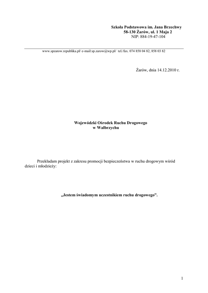 Szkoła Podstawowa im. Jana Brzechwy 58-130 Żarów, ul. 1 Maja 2 NIP: 884-19-47-104 www.spzarow.republika.pl/ e-mail:[email protected]/ tel./fax. 074 858 04 82, 858 03 82 Żarów, dnia 14.12.2010 r. Wojewódzki Ośrodek Ruchu Drogowego w Wałbrzychu Przekładam projekt z zakresu promocji bezpieczeństwa w ruchu drogowym wśród dzieci i młodzieży: „Jestem świadomym uczestnikiem ruchu drogowego”. 1 Tytuł projektu: „ Jestem świadomym uczestnikiem ruchu drogowego” I. Miejsce/termin realizacji projektu: Gmina Żarów 1. 03.2011r. – 31.05.2011r. - realizacja zagadnień 01.06.2011r. – podsumowanie projektu i wręczenie nagród Szkoła jest największą podstawówką w gminie i jedyną w mieście. Uczy się w niej 574 uczniów, 70 dzieci z obowiązkowym przygotowaniem przedszkolnym oraz 31 dzieci 5 – cio letnich, w tym ponad 164 dowożonych jest autobusami z okolicznych wsi lub dojeżdża rowem. Szkoła zlokalizowana jest w centrum miasta, w 4 budynkach, z których 3 są oddalone od budynku głównego o ok. 200 m. Oba tereny dzieli główna ulica miasta. W związku z powyższym uczniowie muszą przechodzić przez ulicę na niektóre zajęcia lub do świetlicy szkolnej. II.Grupa docelowa: 1.Dzieci klas „0” – III szkoły podstawowej ( 6-10 lat), które w drodze do szkoły poruszają się pieszo. Dzieci z klas IV – VI, w tym dojeżdżające do szkoły autobusami i rowerami. III. Liczba uczestników: 574 uczniów szkoły i dzieci z oddziałów przedszkolnych oraz ich rodzice. IV. Opis przedsięwzięcia: A. Opis działań 1. Zadania dla zespołów realizujących projekt L.P. Zadanie 1. 2. Spotkanie organizacyjne – podział Miasta Żarów na obszary, w których przydzielone zostaną poszczególnym zespołom zadania do wykonania. a) Przeprowadzenie wywiadów z przedstawicielami Urzędu Miejskiego, Policji, mieszkańcami, sołtysami wsi itd. na temat „ Bezpieczne i Miejsce Szkoła Podstawowa im. Jana Brzechwy w Żarowie Miasto Żarów Wsie : Bożanów, Kalno, Osoby Odpowiedzialne Nauczyciel techniki, nauczyciele przyrody, Samorząd Uczniowski Wychowawcy klas IV –VI, przedstawiciele uczniów 2 niebezpieczne miejsca w moim miejscu zamieszkania i na drodze do szkoły” oraz możliwości poprawy stanu bezpieczeństwa. 3. b) Przekazanie wniosków i uwag dotyczących poprawy stanu bezpieczeństwa w miejscach niebezpiecznych policji i przedstawicielom Urzędu Miejskiego. Zorganizowanie zajęć z zakresu wychowania komunikacyjnego: a)uczniowie klas IV – VI: zajęcia w pracowni komputerowej i Szkolnej Pracowni Multimedialnej z wykorzystaniem elementów programu interaktywnego „ Poznaj świat techniki” oraz tablicy interaktywnej, Wierzbna , Łażany, Przyłęgów, Mikoszowa Szkoła Podstawowa im. Jana Brzechwy w Żarowie Szkolne Miasteczko Ruchu Drogowego, skrzyżowania i ulice miasta b)uczniowie klas I-III: zajęcia edukacyjno-profilaktyczne „Bezpieczne dziecko” d) uczniowie klas I-III: zajęcia koła motoryzacyjnego. Zorganizowanie i przeprowadzenie akcji: Nauczyciel techniki, wychowawcy świetlicy Nauczyciele edukacji wczesnoszkolnej i kształcenia zintegrowanego wychowawcy klas 0-III c) uczniowie klas 0 –III: podstawowe przepisy poruszania się po drodze – wycieczki przedmiotowe, 4. z wymienionych miejscowości wychowawca świetlicy Teren miasta Żarów a)mierzenia natężenia ruchu drogowego w różnych godzinach i miejscach, Nauczyciele klas IV – VI przy współpracy z policją Wychowawcy klas I – III przy współpracy z policją b) „Jabłko czy cytryna”, skierowanej do dorosłych kierowców pojazdów. 5. Zorganizowanie Konkursu Wiedzy o Ruchu Drogowym dla kl. IV – VI „Znam przepisy drogowe” Szkoła Podstawowa im. Jana Brzechwy w Żarowie nauczyciel techniki 6. Przeprowadzenie konkursu plastycznego, pod hasłem : „ Zapięte pasy chronią życie pasażerów” Wykonanie różnymi technikami Szkoła Podstawowa im. Jana Brzechwy w Żarowie Wychowawcy klas 0-III Szkoła Podstawowa Wychowawcy 7. 3 8. makiet (planów) miasta , z uwzględnieniem bezpiecznych miejsc na jego teranie. im. Jana Brzechwy w Żarowie Niebezpieczne miejsca na drodze do szkoły : „ Żarów w obiektywie” – zorganizowanie galerii zdjęć. Teren miasta Żarów świetlicy, nauczyciel techniki, nauczyciele edukacji wczesnoszkolnej i kształcenia zintegrowanego Pedagog szkolny, Samorząd Uczniowski 2. Zorganizowanie Dnia Otwartego szkoły z udziałem rodziców „Potyczki Rodzinne – Bezpieczna Super Rodzinka” – gry, zabawy i konkursy z zakresem bezpieczeństwa do wspólnego wykonania przez dzieci i rodziców: 1) tor rowerowy dla dzieci i ich rodziców, uwzględniający przepisy ruchu drogowego w Miasteczku Ruchu Drogowego, 2) konkurs plastyczny dla uczniów i rodziców: „ Bądź bezpieczny na drodze”. 3. Podsumowanie projektu 1) Prezentacja efektów projektu : ► galeria zdjęć „ Żarów w obiektywie:, ► wystawa wyróżnionych i nagrodzonych prac plastycznych, ► prezentacja makiet, planów, ► nagrodzenie uczestników konkursów, ► opracowanie i wydanie biuletynu podsumowującego projekt – wydanie specjalne gazetki „Szkole wieści”. ► prezentacja multimedialna z realizacji projektu. B. Harmonogram działań: 1 marca rozpoczęcie realizacji projektu – apel spotkanie organizacyjne, przydział zadań zaproszenie rodziców do udziału w projekcie przeprowadzenie wywiadów dotyczących niebezpiecznych miejsc akcja mierzenia natężania ruchu drogowego wykonanie makiet/planów miasta I tydzień 4 II tydzień realizacji projektu Konkurs Wiedzy o Ruchu Drogowym Konkurs plastyczny w klasach „0” – III Akcja – „Żarów w obiektywie” III tydzień realizacji projektu Akcja „ Jabłko czy cytryna: 1 czerwca- podsumowanie projektu, wręczenie nagród Organizacja Dnia Otwartego – „Potyczki rodzinne – Bezpieczna Super Rodzinka” Podsumowanie projektu Przeprowadzenie zajęć z wychowania komunikacyjnego – zgodnie z planem lekcji , w ciągu 
