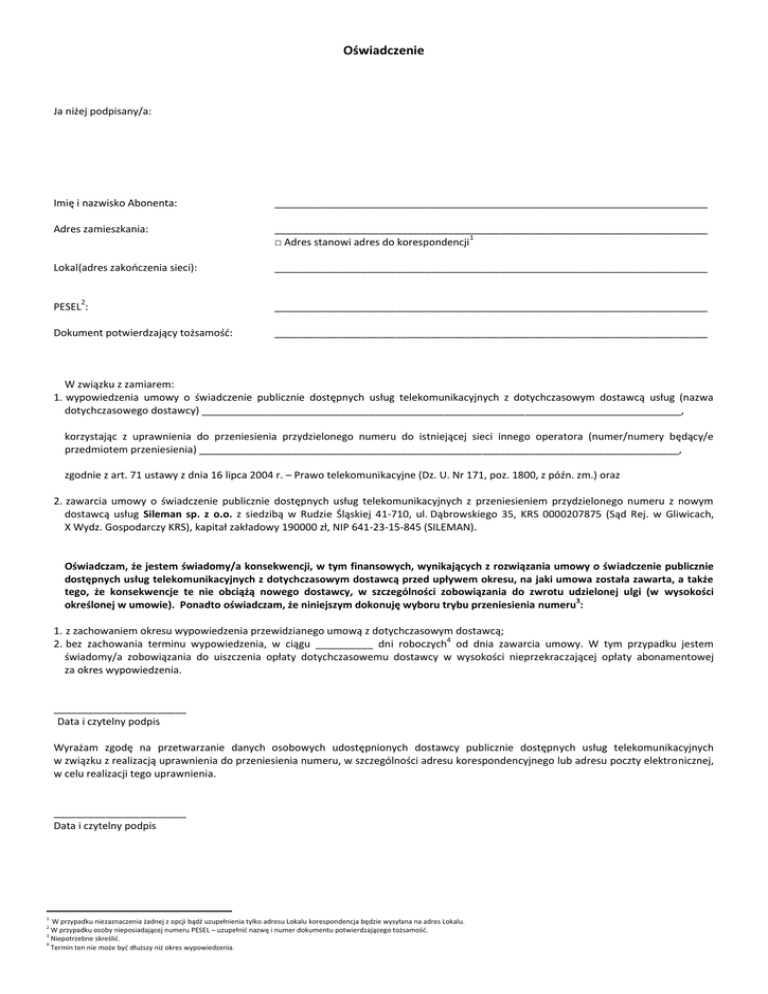 Oświadczenie Ja niżej podpisany/a: Imię i nazwisko Abonenta: ___________________________________________________________________________ Adres zamieszkania: ___________________________________________________________________________ 1 □ Adres stanowi adres do korespondencji Lokal(adres zakończenia sieci): ___________________________________________________________________________ 2 PESEL : ___________________________________________________________________________ Dokument potwierdzający tożsamość: ___________________________________________________________________________ W związku z zamiarem: 1. wypowiedzenia umowy o świadczenie publicznie dostępnych usług telekomunikacyjnych z dotychczasowym dostawcą usług (nazwa dotychczasowego dostawcy) ___________________________________________________________________________________, korzystając z uprawnienia do przeniesienia przydzielonego numeru do istniejącej sieci innego operatora (numer/numery będący/e przedmiotem przeniesienia) ___________________________________________________________________________________, zgodnie z art. 71 ustawy z dnia 16 lipca 2004 r. – Prawo telekomunikacyjne (Dz. U. Nr 171, poz. 1800, z późn. zm.) oraz 2. zawarcia umowy o świadczenie publicznie dostępnych usług telekomunikacyjnych z przeniesieniem przydzielonego numeru z nowym dostawcą usług Sileman sp. z o.o. z siedzibą w Rudzie Śląskiej 41-710, ul. Dąbrowskiego 35, KRS 0000207875 (Sąd Rej. w Gliwicach, X Wydz. Gospodarczy KRS), kapitał zakładowy 190000 zł, NIP 641-23-15-845 (SILEMAN). Oświadczam, że jestem świadomy/a konsekwencji, w tym finansowych, wynikających z rozwiązania umowy o świadczenie publicznie dostępnych usług telekomunikacyjnych z dotychczasowym dostawcą przed upływem okresu, na jaki umowa została zawarta, a także tego, że konsekwencje te nie obciążą nowego dostawcy, w szczególności zobowiązania do zwrotu udzielonej ulgi (w wysokości 3 określonej w umowie). Ponadto oświadczam, że niniejszym dokonuję wyboru trybu przeniesienia numeru : 1. z zachowaniem okresu wypowiedzenia przewidzianego umową z dotychczasowym dostawcą; 4 2. bez zachowania terminu wypowiedzenia, w ciągu __________ dni roboczych od dnia zawarcia umowy. W tym przypadku jestem świadomy/a zobowiązania do uiszczenia opłaty dotychczasowemu dostawcy w wysokości nieprzekraczającej opłaty abonamentowej za okres wypowiedzenia. _______________________ Data i czytelny podpis Wyrażam zgodę na przetwarzanie danych osobowych udostępnionych dostawcy publicznie dostępnych usług telekomunikacyjnych w związku z realizacją uprawnienia do przeniesienia numeru, w szczególności adresu korespondencyjnego lub adresu poczty elektronicznej, w celu realizacji tego uprawnienia. _______________________ Data i czytelny podpis 1 W przypadku niezaznaczenia żadnej z opcji bądź uzupełnienia tylko adresu Lokalu korespondencja będzie wysyłana na adres Lokalu. W przypadku osoby nieposiadającej numeru PESEL – uzupełnić nazwę i numer dokumentu potwierdzającego tożsamość. Niepotrzebne skreślić. 4 Termin ten nie może być dłuższy niż okres wypowiedzenia. 2 3