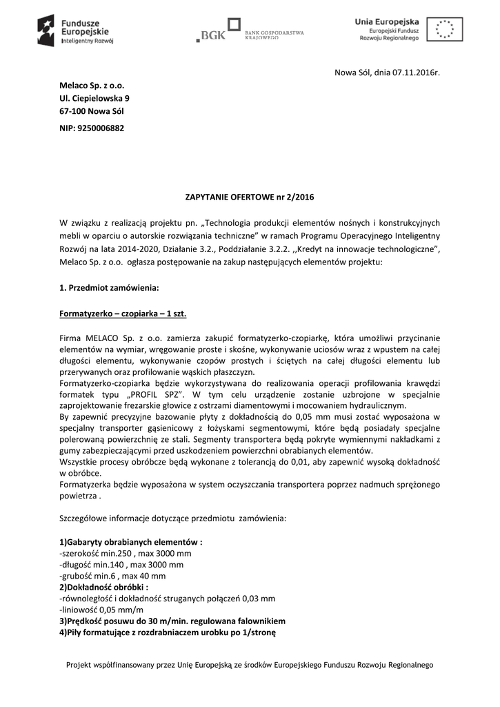 Nowa Sól, dnia 07.11.2016r. Melaco Sp. z o.o. Ul. Ciepielowska 9 67-100 Nowa Sól NIP: 9250006882 ZAPYTANIE OFERTOWE nr 2/2016 W związku z realizacją projektu pn. „Technologia produkcji elementów nośnych i konstrukcyjnych mebli w oparciu o autorskie rozwiązania techniczne” w ramach Programu Operacyjnego Inteligentny Rozwój na lata 2014-2020, Działanie 3.2., Poddziałanie 3.2.2. ,,Kredyt na innowacje technologiczne”, Melaco Sp. z o.o. ogłasza postępowanie na zakup następujących elementów projektu: 1. Przedmiot zamówienia: Formatyzerko – czopiarka – 1 szt. Firma MELACO Sp. z o.o. zamierza zakupić formatyzerko-czopiarkę, która umożliwi przycinanie elementów na wymiar, wręgowanie proste i skośne, wykonywanie uciosów wraz z wpustem na całej długości elementu, wykonywanie czopów prostych i ściętych na całej długości elementu lub przerywanych oraz profilowanie wąskich płaszczyzn. Formatyzerko-czopiarka będzie wykorzystywana do realizowania operacji profilowania krawędzi formatek typu „PROFIL SPZ”. W tym celu urządzenie zostanie uzbrojone w specjalnie zaprojektowanie frezarskie głowice z ostrzami diamentowymi i mocowaniem hydraulicznym. By zapewnić precyzyjne bazowanie płyty z dokładnością do 0,05 mm musi zostać wyposażona w specjalny transporter gąsienicowy z łożyskami segmentowymi, które będą posiadały specjalne polerowaną powierzchnię ze stali. Segmenty transportera będą pokryte wymiennymi nakładkami z gumy zabezpieczającymi przed uszkodzeniem powierzchni obrabianych elementów. Wszystkie procesy obróbcze będą wykonane z tolerancją do 0,01, aby zapewnić wysoką dokładność w obróbce. Formatyzerka będzie wyposażona w system oczyszczania transportera poprzez nadmuch sprężonego powietrza . Szczegółowe informacje dotyczące przedmiotu zamówienia: 1)Gabaryty obrabianych elementów : -szerokość min.250 , max 3000 mm -długość min.140 , max 3000 mm -grubość min.6 , max 40 mm 2)Dokładność obróbki : -równoległość i dokładność struganych połączeń 0,03 mm -liniowość 0,05 mm/m 3)Prędkość posuwu do 30 m/min. regulowana falownikiem 4)Piły formatujące z rozdrabniaczem urobku po 1/stronę Projekt współfinansowany przez Unię Europejską ze środków Europejskiego Funduszu Rozwoju Regionalnego 5)Frezerskie wrzeciona obróbcze po 4/stronę , moc minimalna 4,5 KW , mocowanie narzędzi skrawających hydro , obroty wrzecion regulowane falownikiem -po 3 wrzeciona na stronę muszą posiadać regulowany pneumatycznie doskok 6)Transporter łańcuchowy : -z nakładkami gumowymi -ogniwa transportera z łożyskami zapewniającymi wymaganą dokładność obróbki -w transporterze mają się znajdować zabieraki wysuwane manualnie Parametry planowanej do zakupu Formatyzerko – czopiarki – 1 szt. muszą być równoważne lub lepsze od parametrów wskazanych powyżej. Wspólny słownik zamówień (CPV): 42642100-9 Obrabiarki do obróbki drewna 2. Planowany termin realizacji zamówienia: do 20.12.2017r. 3. Warunki udziału w postępowaniu: Do postępowania zostaną dopuszczeni oferenci spełniający następujące warunki: Posiadanie uprawnień do wykonywania określonej działalności lub czynności, jeżeli przepisy prawa nakładają obowiązek ich posiadania. Posiadanie wiedzy i doświadczenia należytego wykonania zamówienia Dysponowanie odpowiednim potencjałem technicznym oraz osobami zdolnymi do wykonania zamówienia. Znajdowanie się w sytuacji ekonomicznej i finansowej umożliwiającej wykonanie zamówienia. Brak powiązań osobowych lub kapitałowych z zamawiającym. Przedłożenie specyfikacji przedmiotu zamówienia przygotowanej przez oferenta. Zapewnienie dostawy i ubezpieczenia do miejsca rozładunku w Nowej Soli, ul. Ciepielowska 9, montażu, uruchomienia i szkolenia personelu. Zamawiający w celu potwierdzenia spełnienia w/w warunków wymaga przedłożenia następujących dokumentów: 1) Złożenie oferty zawierającej: Nazwę i adres Wykonawcy Datę wystawienia oferty Dane pozwalające ocenić ofertę i przyznać punkty w ramach kryteriów Termin ważności oferty Cenę netto i brutto 2) Złożenie na ofercie oświadczeń o następującej treści: Projekt współfinansowany przez Unię Europejską ze środków Europejskiego Funduszu Rozwoju Regionalnego Wykonawca oświadcza, że zna i akceptuje warunki realizacji zamówienia określone w zapytaniu ofertowym oraz nie wnosi żadnych zastrzeżeń i uwag w tym zakresie. Wykonawca oświadcza, że posiada uprawnienia do wykonywania określonej działalności lub czynności, jeżeli przepisy prawa nakładają obowiązek ich posiadania. Wykonawca, oświadcza że posiada niezbędną wiedzę i doświadczenie umożliwiające prawidłową realizację zamówienia. Wykonawca oświadcza, że dysponuje odpowiednim potencjałem technicznym oraz osobami zdolnymi do wykonania zamówienia. Wykonawca oświadcza, że znajduje się w sytuacji ekonomicznej i finansowej zapewniającej wykonanie zamówienia we wskazanym terminie. Wykonawca oświadcza, że nie jest powiązany osobowo lub kapitałowo z Zamawiającym. Przez powiązania osobowe lub kapitałowe rozumie się wzajemne powiązania pomiędzy Zamawiającym lub osobami upoważnionymi do zaciągania zobowiązań w imieniu Zamawiającego lub osobami wykonującymi w imieniu Zamawiającego czynności związanych z przygotowaniem i przeprowadzeniem procedury wyboru Wykonawcy a Wykonawcą, polegające w szczególności na: a) uczestniczeniu w spółce jako wspólnik spółki cywilnej lub spółki osobowej; b) posiadaniu co najmniej 10% udziałów lub akcji; c) pełnieniu funkcji członka organu nadzorczego lub zarządzającego, prokurenta, pełnomocnika; d) pozostawaniu w związku małżeńskim, w stosunku pokrewieństwa lub powinowactwa w linii prostej, w stosunku pokrewieństwa lub powinowactwa w linii bocznej do drugiego stopnia lub pozostawania w stosunku przysposobienia, opieki lub kurateli; e) pozostawaniu z wy