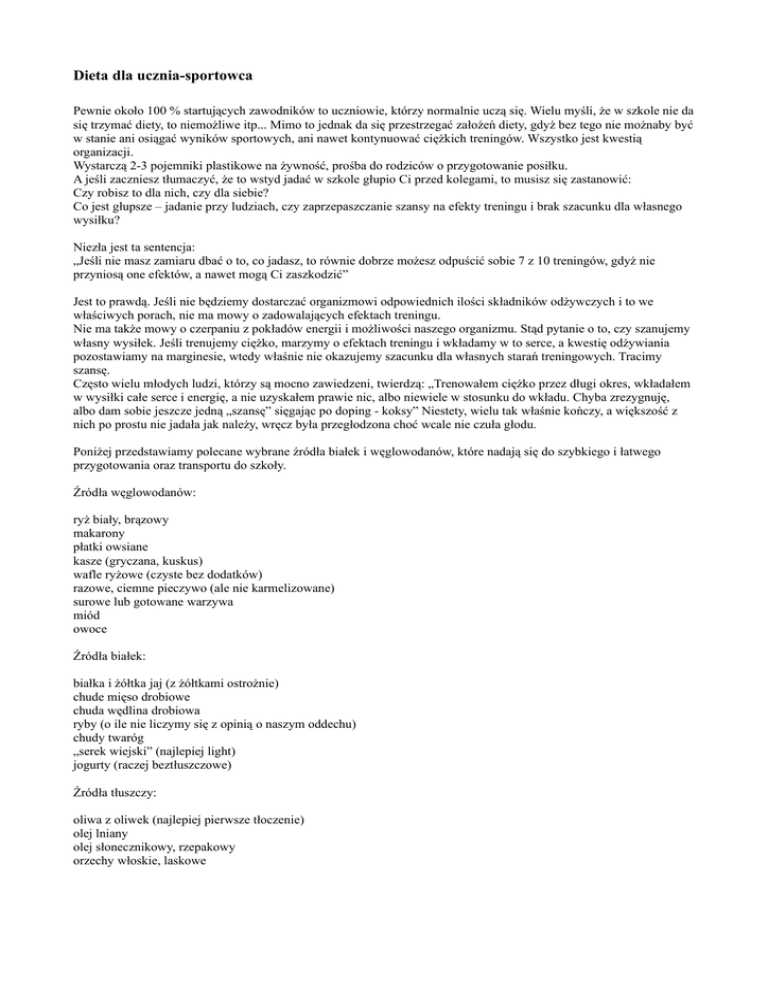 Dieta dla ucznia-sportowca Pewnie około 100 % startujących zawodników to uczniowie, którzy normalnie uczą się. Wielu myśli, że w szkole nie da się trzymać diety, to niemożliwe itp... Mimo to jednak da się przestrzegać założeń diety, gdyż bez tego nie możnaby być w stanie ani osiągać wyników sportowych, ani nawet kontynuować ciężkich treningów. Wszystko jest kwestią organizacji. Wystarczą 2-3 pojemniki plastikowe na żywność, prośba do rodziców o przygotowanie posiłku. A jeśli zaczniesz tłumaczyć, że to wstyd jadać w szkole głupio Ci przed kolegami, to musisz się zastanowić: Czy robisz to dla nich, czy dla siebie? Co jest głupsze – jadanie przy ludziach, czy zaprzepaszczanie szansy na efekty treningu i brak szacunku dla własnego wysiłku? Niezła jest ta sentencja: „Jeśli nie masz zamiaru dbać o to, co jadasz, to równie dobrze możesz odpuścić sobie 7 z 10 treningów, gdyż nie przyniosą one efektów, a nawet mogą Ci zaszkodzić” Jest to prawdą. Jeśli nie będziemy dostarczać organizmowi odpowiednich ilości składników odżywczych i to we właściwych porach, nie ma mowy o zadowalających efektach treningu. Nie ma także mowy o czerpaniu z pokładów energii i możliwości naszego organizmu. Stąd pytanie o to, czy szanujemy własny wysiłek. Jeśli trenujemy ciężko, marzymy o efektach treningu i wkładamy w to serce, a kwestię odżywiania pozostawiamy na marginesie, wtedy właśnie nie okazujemy szacunku dla własnych starań treningowych. Tracimy szansę. Często wielu młodych ludzi, którzy są mocno zawiedzeni, twierdzą: „Trenowałem ciężko przez długi okres, wkładałem w wysiłki całe serce i energię, a nie uzyskałem prawie nic, albo niewiele w stosunku do wkładu. Chyba zrezygnuję, albo dam sobie jeszcze jedną „szansę” sięgając po doping - koksy” Niestety, wielu tak właśnie kończy, a większość z nich po prostu nie jadała jak należy, wręcz była przegłodzona choć wcale nie czuła głodu. Poniżej przedstawiamy polecane wybrane źródła białek i węglowodanów, które nadają się do szybkiego i łatwego przygotowania oraz transportu do szkoły. Źródła węglowodanów: ryż biały, brązowy makarony płatki owsiane kasze (gryczana, kuskus) wafle ryżowe (czyste bez dodatków) razowe, ciemne pieczywo (ale nie karmelizowane) surowe lub gotowane warzywa miód owoce Źródła białek: białka i żółtka jaj (z żółtkami ostrożnie) chude mięso drobiowe chuda wędlina drobiowa ryby (o ile nie liczymy się z opinią o naszym oddechu) chudy twaróg „serek wiejski” (najlepiej light) jogurty (raczej beztłuszczowe) Źródła tłuszczy: oliwa z oliwek (najlepiej pierwsze tłoczenie) olej lniany olej słonecznikowy, rzepakowy orzechy włoskie, laskowe