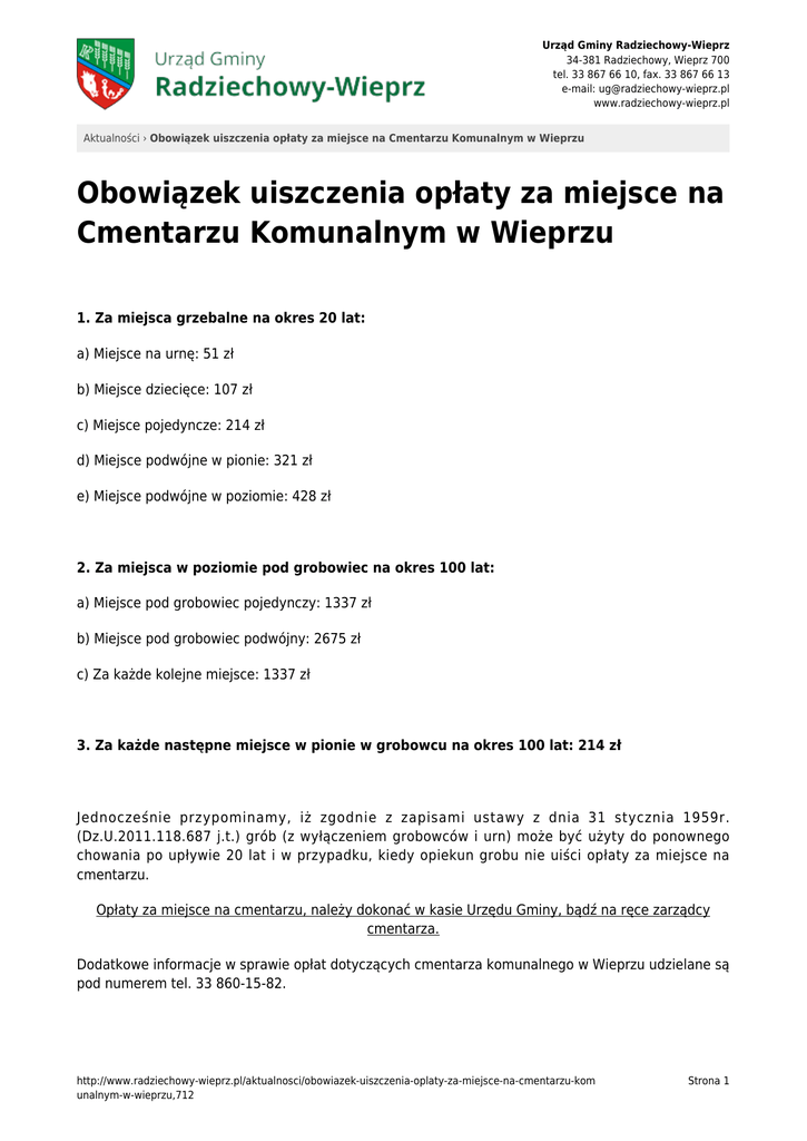 Urząd Gminy Radziechowy-Wieprz 34-381 Radziechowy, Wieprz 700 tel. 33 867 66 10, fax. 33 867 66 13 e-mail: [email protected] www.radziechowy-wieprz.pl Aktualności › Obowiązek uiszczenia opłaty za miejsce na Cmentarzu Komunalnym w Wieprzu Obowiązek uiszczenia opłaty za miejsce na Cmentarzu Komunalnym w Wieprzu 1. Za miejsca grzebalne na okres 20 lat: a) Miejsce na urnę: 51 zł b) Miejsce dziecięce: 107 zł c) Miejsce pojedyncze: 214 zł d) Miejsce podwójne w pionie: 321 zł e) Miejsce podwójne w poziomie: 428 zł 2. Za miejsca w poziomie pod grobowiec na okres 100 lat: a) Miejsce pod grobowiec pojedynczy: 1337 zł b) Miejsce pod grobowiec podwójny: 2675 zł c) Za każde kolejne miejsce: 1337 zł 3. Za każde następne miejsce w pionie w grobowcu na okres 100 lat: 214 zł Jednocześnie przypominamy, iż zgodnie z zapisami ustawy z dnia 31 stycznia 1959r. (Dz.U.2011.118.687 j.t.) grób (z wyłączeniem grobowców i urn) może być użyty do ponownego chowania po upływie 20 lat i w przypadku, kiedy opiekun grobu nie uiści opłaty za miejsce na cmentarzu. Opłaty za miejsce na cmentarzu, należy dokonać w kasie Urzędu Gminy, bądź na ręce zarządcy cmentarza. Dodatkowe informacje w sprawie opłat dotyczących cmentarza komunalnego w Wieprzu udzielane są pod numerem tel. 33 860-15-82. http://www.radziechowy-wieprz.pl/aktualnosci/obowiazek-uiszczenia-oplaty-za-miejsce-na-cmentarzu-kom unalnym-w-wieprzu,712 Strona 1