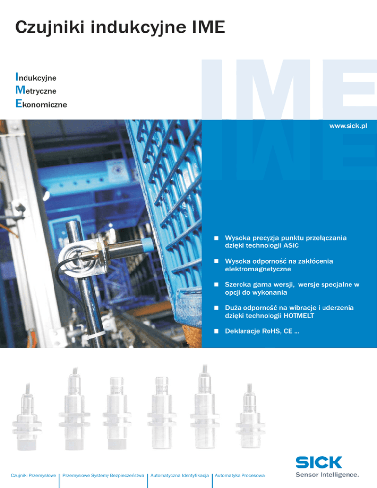 Czujniki indukcyjne IME Indukcyjne Metryczne Ekonomiczne www.sick.pl Wysoka precyzja punktu przełączania dzięki technologii ASIC Wysoka odporność na zakłócenia elektromagnetyczne Szeroka gama wersji, wersje specjalne w opcji do wykonania Duża odporność na wibracje i uderzenia dzięki technologii HOTMELT Deklaracje RoHS, CE ... Czujniki Przemysłowe Przemysłowe Systemy Bezpieczeństwa Automatyczna Identyfikacja Automatyka Procesowa Indukcyjne czujniki zbliżeniowe IME Wysoka jakość oraz niska cena czujnika indukcyjnego jest możliwa dzięki innowacyjnemu wykonaniu jego elektroniki w technologii ASIC. Nowa seria czujników IME gwarantuje lepsze parametry techniczne oraz niższą cenę w porównaniu z klasycznie wykonanymi czujnikami indukcyjnymi. Zaletą układu typu ASIC jest to, że można nim zastąpić cały zestaw układów ogólnego przeznaczenia realizujących tę samą funkcję. Dzięki temu układy ASIC a przez to urządzenia (czujniki) w których pracują są: ? ? Bardziej niezawodne Poprzez zastosowanie pojedynczego chipu obniżają się koszty projektowania, produkcji i montażu układów elektronicznych stąd niższa cena sprzedaży ? Czujniki charakteryzują się dokładniejszym punktem przełączania Czujniki indukcyjne serii IME są bardziej odporne na zakłócenia elektromagnetyczne ? ? Są bardziej odporne na zakłócenia elektromagnetyczne Czujnik ma możliwość końcowego dostrajania zasięgu, po tym kiedy czujnik jest już wykonany, co nie jest możliwe w przypadku standardowych czujników Dodatkowo modułowa budowa IME zapewnia szybszą, wydajniejszą budowę czujników niż ich standardowych odpowiedników, co skraca czas realizacji zamówień oraz projektowanie wersji specjalnych - model czujnika przeprojektowany pod zapotrzebowanie odbiorcy. Wypełnienie żywicą w nowej technologii HOTMELT zapewnia dużą odporność na wibracje i uderzenia. Czujniki indukcyjne serii IME – ustalanie punktu przełączania po finalnym złożeniu czujnika. IME08 41 29 46 33 50 35 52 43 29 49 33 53 35 z przewodem 25 Zabudowany z konektorem 25 IME30 IME18 IME12 56 24 29 25 41 23 33 22 46 50 52 24 29 25 43 49 23 33 53 22 35 56 Indukcyjne czujniki zbliżeniowe IME z przewodem 21 Niezabudowany 35 z konektorem 21 Indukcyjne czujniki zbliżeniowe IME Klucz oznaczeń IME I M E 12 02B P O Z C 0 K S 01 Typ czujnika, obudowa Wersja specjalna Indukcyjny Cylindryczna gwintowana Ecoline S 01 IME K Kształt obudowy, średnica lub wymiar charakterystyczny krawędzi od czoła detekcji Krótki S 08 08 12 12 18 18 30 30 Standardowy Długość kabla Zasięg pracy/rodzaj zabudowy 1B5 1.5 mm, zabudowany 2.5 mm, niezabudowany 2N5 2 mm, zabudowany 02B 4 mm, zabudowany 04B 4 mm, niezabudowany 04N 5 mm, zabudowany 05B 8 mm, zabudowany 08B 8 mm, niezabudowany 08N 12 mm, niezabudowany 12N 15 mm, zabudowany 15B 15 mm, niezabudowany 15N 20 mm, niezabudowany 20N 0 Konektor 1 1m 2 2m 3 3m 5 5m 6 10 m 7 0,1 m 8 0,2 m D Długość kabla na żądanie Materiał kabla i konektory Interfejs elektryczny W Kabel PVC U Kabel PUR T Konektor, M8 x 1 C Konektor, M12 x 1 P Kabel z konektorem M8 x 1 Q Kabel z konektorem M12 x 1 R Kabel z konektorem M8 x 1, z nakrętką Materiał obudowy N DC (3/4-przew.) NPN P DC (3/4-przew.) PNP Czujnik w wersji specjalnej i jego numer Długość korpusu Wyjście NC O NO S V Stal nierdzewna Z Mosiądz pokryty niklem Instalacja czujniów cylindrycznych Uwagi dotyczące instalacji czujników cylindrycznych w metalu z zabudowanym i niezabudowanym czołem d d 2d d d d d ≥3 Sn ≥3 Sn 2S Z czołem zabudowanym n Z czołem niezabudowanym Indukcyjne czujniki zbliżeniowe IME Deklaracje RoHS i CE Deklaracja CE zgodna z dyrektywami i standardami RL 2004/108/EG, EN 60947- 5-2, EN 60947- 5-2/A2 Deklaracja RoHS (Restriction of Hazardous Substances) zgodna z dyrektywą EU 2002/95 Oferta specjalna czujników indukcyjnych IME Nr kat Średnica gwintu [mm] Zasięg/czoło Polaryzacja Funkcja wyjścia Złącze/przewód Częstotliwość przełączania [Hz] Długość korpusu [mm] 1 040 838 8 1,5 mm zabudowane PNP NO M8x1 500 50 1 040 839 8 1,5 mm zabudowane PNP NO Przewód 2 m 500 43 1 040 840 8 1,5 mm zabudowane PNP NO Przewód 2 m 500 52 1 040 853 8 2,5 mm niezabudowane PNP NO M8x1 500 41 1 040 885 8 4 mm niezabudowane PNP NO M8x1 500 41 1 040 731 12 2 mm zabudowane PNP NO M12x1 500 46 1 040 732 12 2 mm zabudowane PNP NO M12x1 500 65 1 040 733 12 2 mm zabudowane PNP NO Przewód 2 m 500 49 1 040 747 12 4 mm niezabudowane PNP NO M12x1 500 46 1 040 757 12 4 mm niezabudowane NPN NO Przewód 2 m 500 68 1 040 933 18 5 mm zabudowane PNP NO M12x1 300 50 1 040 934 18 5 mm zabudowane PNP NO M12x1 300 69 1 040 935 18 5 mm zabudowane PNP NO Przewód 2 m 300 53 1 040 949 18 8 mm niezabudowane PNP NO M12x1 300 50 1 040 981 18 12 mm niezabudowane PNP NO M12x1 300 50 1 040 998 30 10 mm zabudowane PNP NO M12x1 100 71 1 040 999 30 10 mm zabudowane PNP NO Przewód 2 m 100 56 1 041 000 30 10 mm zabudowane PNP NO Przewód 2 m 100 75 1 041 013 30 15 mm niezabudowane PNP NO M12x1 100 52 1 041 045 30 20 mm niezabudowane PNP NO M12x1 100 52 Cena netto w PLN*) *) do uzgodnienia Dział Sprzedaży i Doradztwa Technicznego: Małopolskie, Świętokrzyskie, Podkarpackie: Zbigniew Słociński, tel. 601 699 329, [email protected] Wielkopolskie: Paweł Szczuka, tel. 603 391 001, [email protected] Zachodniopomorskie, Lubuskie: Tomasz Babacz, tel. 697 288 211, [email protected] Podlaskie, Lubelskie, Mazowieckie (północno-wschodnie): Artur Wyganowski, tel. 695 288 299, [email protected] Łódzkie, Mazowieckie (południowo-zachodnie): Robert Dudziec, tel. 601 378 532, [email protected] Pomorskie, Kujawsko-Pomorskie, Warmińskie: Piotr Gabryś, tel. 605 563 030, [email protected] Dolnośląskie, Opolskie: Janusz Forkiewicz, tel. 601 356 512, [email protected] Śląskie: Wojciech Wylężek, tel. 601 493 409, [email protected] Informacje o produktach: Dominik Lesiński, tel. (22) 877 58 04, [email protected] Paweł Wiącek, tel. (22)