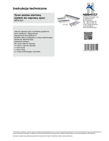 Instrukcja techniczna Tyrex zestaw startowy system do naprawy opon 9879-921 Normfest Polska Sp. z o.o. ul. Wichrowa 4/10 60-449 Poznań Tel.: +48 61 8 439 140 Fax: +48 61 8 439 142 e-mail: [email protected] www.normfest.pl www.normfest-shop.pl ciało do naprawy opon w kształcie grzybka do opon radialnych i diagonalnych dopuszczone dla prędkości V obróbka tylko w połączeniu z masą wulkanizującą (Artikel-Nr. 9879-94-250) zawartość zestawu:: 20 x 3mm ciało do naprway 15 x 6mm ciało do naprawy 1 x 3mm fryza 1 x 6mm fryza 5 x masa wulkanizyjąca 15g tubka Informacji tych udzielamy w dobrej wierze na podstawie przeprowadzonych przez nas prób i doświadczeń praktycznych. Nie możemy jednak przejąć odpowiedzialności za wynik w konkretnym przypadku, ze względu na dużą liczbę zastosowań oraz leżące poza zasięgiem naszego wpływu warunki przechowywania i przetwarzania. Zalecamy w każdym przypadku przeprowadzenie własnych prób i testów. Modyfikacje i dalsze zmiany zastrzeżone.