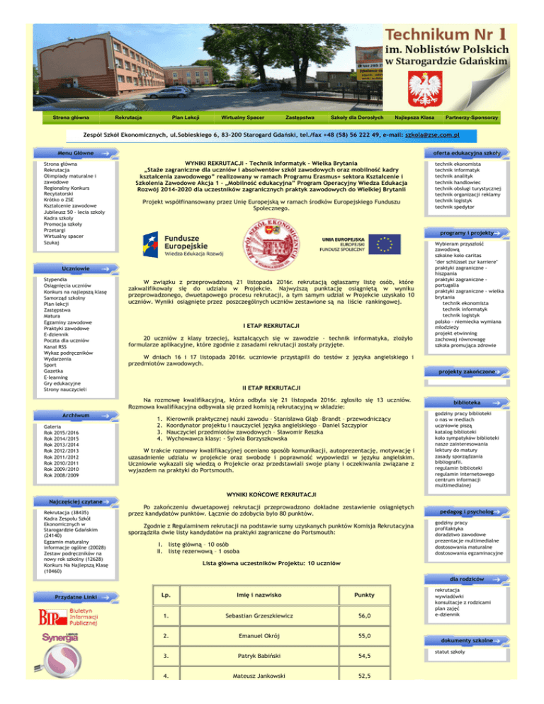 Strona główna Rekrutacja Plan Lekcji Wirtualny Spacer Zastępstwa Szkoły dla Dorosłych Najlepsza Klasa Partnerzy-Sponsorzy Zespół Szkół Ekonomicznych, ul.Sobieskiego 6, 83-200 Starogard Gdański, tel./fax +48 (58) 56 222 49, e-mail: [email protected] Menu Główne Strona główna Rekrutacja Olimpiady maturalne i zawodowe Regionalny Konkurs Recytatorski Krótko o ZSE Kształcenie zawodowe Jubileusz 50 - lecia szkoły Kadra szkoły Promocja szkoły Przetargi Wirtualny spacer Szukaj oferta edukacyjna szkoły WYNIKI REKRUTACJI - Technik Informatyk – Wielka Brytania „Staże zagraniczne dla uczniów i absolwentów szkół zawodowych oraz mobilność kadry kształcenia zawodowego” realizowany w ramach Programu Erasmus+ sektora Kształcenie i Szkolenia Zawodowe Akcja 1 – „Mobilność edukacyjna” Program Operacyjny Wiedza Edukacja Rozwój 2014-2020 dla uczestników zagranicznych praktyk zawodowych do Wielkiej Brytanii Projekt współfinansowany przez Unię Europejską w ramach środków Europejskiego Funduszu Społecznego. W związku z przeprowadzoną 21 listopada 2016r. rekrutacją ogłaszamy listę osób, które zakwalifikowały się do udziału w Projekcie. Najwyższą punktację osiągniętą w wyniku przeprowadzonego, dwuetapowego procesu rekrutacji, a tym samym udział w Projekcie uzyskało 10 uczniów. Wyniki osiągnięte przez poszczególnych uczniów zestawione są na liście rankingowej. I ETAP REKRUTACJI 20 uczniów z klasy trzeciej, kształcących się w zawodzie - technik informatyka, złożyło formularze aplikacyjne, które zgodnie z zasadami rekrutacji zostały przyjęte. Galeria Rok 2015/2016 Rok 2014/2015 Rok 2013/2014 Rok 2012/2013 Rok 2011/2012 Rok 2010/2011 Rok 2009/2010 Rok 2008/2009 Wybieram przyszłość zawodową szkolne koło caritas "der schlüssel zur karriere" praktyki zagraniczne hiszpania praktyki zagraniczne portugalia praktyki zagraniczne - wielka brytania technik ekonomista technik informatyk technik logistyk polsko - niemiecka wymiana młodzieży projekt etwinning zachowaj równowagę szkoła promująca zdrowie W dniach 16 i 17 listopada 2016r. uczniowie przystąpili do testów z języka angielskiego i przedmiotów zawodowych. projekty zakończone II ETAP REKRUTACJI Na rozmowę kwalifikacyjną, która odbyła się 21 listopada 2016r. zgłosiło się 13 uczniów. Rozmowa kwalifikacyjna odbywała się przed komisją rekrutacyjną w składzie: Archiwum ekonomista informatyk analityk handlowiec obsługi turystycznej organizacji reklamy logistyk spedytor programy i projekty Uczniowie Stypendia Osiągnięcia uczniów Konkurs na najlepszą klasę Samorząd szkolny Plan lekcji Zastępstwa Matura Egzaminy zawodowe Praktyki zawodowe E-dziennik Poczta dla uczniów Kanał RSS Wykaz podręczników Wydarzenia Sport Gazetka E-learning Gry edukacyjne Strony nauczycieli technik technik technik technik technik technik technik technik 1. 2. 3. 4. Kierownik praktycznej nauki zawodu – Stanisława Głąb –Brandt – przewodniczący Koordynator projektu i nauczyciel języka angielskiego – Daniel Szczypior Nauczyciel przedmiotów zawodowych – Sławomir Reszka Wychowawca klasy: - Sylwia Borzyszkowska W trakcie rozmowy kwalifikacyjnej oceniano sposób komunikacji, autoprezentację, motywację i uzasadnienie udziału w projekcie oraz swobodę i poprawność wypowiedzi w języku angielskim. Uczniowie wykazali się wiedzą o Projekcie oraz przedstawiali swoje plany i oczekiwania związane z wyjazdem na praktyki do Portsmouth. biblioteka godziny pracy biblioteki o nas w mediach uczniowie piszą katalog biblioteki koło sympatyków biblioteki nasze zainteresowania lektury do matury zasady sporządzania bibliografii. regulamin biblioteki regulamin internetowego centrum informacji multimedialnej WYNIKI KOŃCOWE REKRUTACJI Najczęściej czytane Rekrutacja (38435) Kadra Zespołu Szkół Ekonomicznych w Starogardzie Gdańskim (24140) Egzamin maturalny informacje ogólne (20028) Zestaw podręczników na nowy rok szkolny (12628) Konkurs Na Najlepszą Klasę (10460) Po zakończeniu dwuetapowej rekrutacji przeprowadzono dokładne zestawienie osiągniętych przez kandydatów punktów. Łącznie do zdobycia było 80 punktów. Zgodnie z Regulaminem rekrutacji na podstawie sumy uzyskanych punktów Komisja Rekrutacyjna sporządziła dwie listy kandydatów na praktyki zagraniczne do Portsmouth: I. listę główną – 10 osób II. listę rezerwową – 1 osoba pedagog i psycholog godziny pracy profilaktyka doradztwo zawodowe prezentacje multimedialne dostosowania maturalne dostosowania egzaminacyjne Lista główna uczestników Projektu: 10 uczniów dla rodziców Przydatne Linki Lp. Imię i nazwisko Punkty 1. Sebastian Grzeszkiewicz 56,0 2. Emanuel Okrój 55,0 3. Patryk Babiński 54,5 4. Mateusz Jankowski 52,5 rekrutacja wywiadówki konsultacje z rodzicami plan zajęć e-dziennik dokumenty szkolne statut szkoły Lp. 5. Imię i nazwisko Michał Tarnowski Punkty 52,5 6. Aleksander Wiński 51,5 7. Piotr Jackowski 48,5 8. Oskar Syntek 44,25 9. Dariusz Warczak 43,5 10. Przemysław Wika 40,5 Lista rezerwowa uczestników Projektu: 1 uczeń 1. Dominika Plutowska Tags PROJEKT KSZTAŁCENIE ZAWODOWE Zespół Szkół Ekonomicznych ul.Sobieskiego 6 83-200 Starogard Gdański tel./fax +48 (58) 56 222 49 e-mail: [email protected] Czas generowania strony: -0.484s. 39,75 liczba odwiedzin odwiedziło nas: 2678926 imieniny Dominika, Franciszki, Katarzyny Do końca roku szkolnego pozostało 106 dni. przydatne linki europejski fundusz społeczny