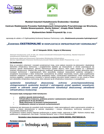 Wydział Inżynierii Kształtowania Środowiska i Geodezji wraz z Centrum Modelowania Procesów Hydrologicznych Uniwersytetu Przyrodniczego we Wrocławiu, Polskie Stowarzyszenie „Dachy Zielone”, Urzędy Miast Polskich oraz Wydawnictwo Seidel-Przywecki Sp. z o.o. zapraszają do udziału w II Ogólnopolskiej Konferencji Naukowo-Technicznej z cyklu „Modelowanie procesów hydrologicznych” „ZJAWISKA EKSTREMALNE W EKSPLOATACJI INFRASTRUKTURY KOMUNALNEJ” 16-17 listopada 2010r, Zegrze k/Warszawy Patronat merytoryczny: prof. dr hab. inż. Janusz Łomotowski Uniwersytet Przyrodniczy, Wydział Inżynierii Kształtowania Środowiska i Geodezji Konferencja objęta pod Honorowym Patronatem Ministerstwa Infrastruktury Sprawy organizacyjno-finansowe Konferencji prowadzi Wydawnictwo Seidel–Przywecki Sp. z .o.o. Cel konferencji: Wraz ze wzrostem urbanizacji i rozwojem przestrzennym kraju, coraz większe znaczenie ma planowanie i eksploatacja elementów infrastruktury technicznej z uwzględnieniem aspektów jej niezawodności w okresie pojawiających się okresowo zjawisk ekstremalnych, głównie intensywnych opadów deszczu, które często wiązane są z globalnymi zmianami klimatycznymi. Ostatnie lata zwiększyły wrażliwość społeczeństwa i zrozumienie celowości stosowania takich rozwiązań technicznych i organizacyjnych, które pozwoliłyby zwiększyć niezawodność systemów ostrzegania i zarządzania kryzysowego a także konieczność wprowadzenia do praktyki inżynierskiej nowych zasad projektowania systemów związanych z szeroko rozumianą gospodarką wodną i konstrukcjami budowlanymi. Celem konferencji jest wymiana poglądów i wypracowanie wniosków w zakresie podjęcia kierunków działań mających na celu rozwój w Polsce tych elementów infrastruktury technicznej, które zaliczane są do infrastruktury krytycznej a w szczególności: systemów kanalizacji deszczowej, ochrony przeciwpowodziowej, zintegrowanych systemów kontroli i ostrzegania przed opadami nawalnymi, zmian w zakresie zasad projektowania kanalizacji deszczowej, określanie infrastruktury krytycznej. Poruszane będą następujące bloki tematyczne: • • • • problem zjawisk ekstremalnych Infrastruktura krytyczna, podstawy prawne i zastosowanie współczesnych metod geodezyjnych do jej określenia. Wody deszczowe na terenach zurbanizowanych Zwiększanie retencji na terenach zurbanizowanych Konferencja jest skierowana do wszystkich służb komunalnych i władz samorządowych celem wypracowania wniosków w oparciu o własne doświadczenia w zakresie eksploatacji i rozwoju infrastruktury technicznej narażanych na niszczycielskie działania sił natury. Po konferencji wydane zostaną materiały konferencyjne w postaci książki, opatrzonej nr ISBN. Wybrane artykuły będą publikowane w czasopismach „Gaz Woda i Technika Sanitarna” oraz w „Forum Eksploatatora”. SZCZEGÓŁY ORAZ PROGRAM KONFERENCJI NA STRONIE WWW.SEIDEL-PRZYWECKI.PL PATRONAT MEDIALNY KONTAKT W SPRAWACH ORGANIZACYJNYCH: Krystyna Sudoł – Wydawnictwo Seidel-Przywecki Sp. z o.o., Józefosław, ul. Ogrodowa 21m, 05-500 Piaseczno, tel./faks: (22) 877 31 88, tel. kom. 0660 790 907, e-mail: [email protected] KONTAKT W SPRAWACH REFERATÓW: dr inż. Ewa Burszta-Adamiak, Uniwersytet Przyrodniczy Wrocław, Wydział Inżynierii Kształtowania Środowiska i Geodezji, Plac Grunwaldzki 24a, 50-363 Wrocław, tel. (71) 320 55 55; 0602 283 440, e-mail: [email protected] TERMIN KONFERENCJI: 16-17 LISTOPADA 2010 r. Konferencja rozpocznie się 16 listopada o godz. 10.00 a zakończy się 17 listopada ok. godz. 16.00. MIEJSCE KONFERENCJI: Hotel 500 Zegrze Południowe, ul. Warszawska 31, 05-091 Zegrze Południowe WARUNKI UCZESTNICTWA: Warunkiem uczestnictwa w konferencji jest nadesłanie wypełnionej karty zgłoszenia oraz wniesienie opłaty uczestnictwa. TERMIN NADSYŁANIA ZGŁOSZEŃ: do dnia 8.11.2010 r. KOSZT KONFERENCJI: Całkowity koszt uczestnictwa w konferencji wynosi 790,00 zł + 22% VAT = 963,80 zł Zniżki dla uczestników innych konferencji Wydawnictwa Seidel-Przywecki w 2010 roku: • • • Uczestnictwo w 1 konferencji – RABAT 5% Uczestnictwo w 2 konferencjach – RABAT 7% Uczestnictwo w 3 konferencjach – RABAT 10% Zniżka dla Członków Stowarzyszenia „Dachy Zielone”: RABAT 10% W ramach opłaty zapewniamy m.in. udział w konferencji, wyżywienie podczas trwania konferencji, materiały konferencyjne, oraz udział w uroczystej kolacji. UWAGA!!! OPŁATA ZA KONFERENCJĘ NIE OBEJMUJE KOSZTÓW NOCLEGU. W Hotelu 500 zarezerwowane są dla uczestników konferencji miejsca hotelowe w pokojach 1 i 2 osobowych. Ilość pokoi 1 osobowych jest ograniczona. Koszt noclegu w pokoju 2 osobowym wynosi 230 zł brutto (115 zł od osoby). Hotel 500 kontakt: tel. (22) 774 66 66, faks (22) 774 22 44, e-mail: [email protected] Organizatorzy zastrzegają sobie prawo do zmiany programu konferencji. W przypadku rezygnacji z udziału w konferencji Wydawnictwo nie zwraca poniesionych kosztów. ---------------------------------------------------------------------------------------------------------------------------------KARTA ZGŁOSZENIA UDZIAŁU W SEMINARIUM „Zjawiska ekstremalne w eksploatacji infrastruktury komunalnej” 16-17 listopada 2010 Uczestnik 1 Uczestnik 2 Uczestnik 3 Nazwisko i imię Tytuł, stopień Stanowisko Adres e-mail uczestnika Nazwa instytucji (do faktury) Adres do korespondencji ulica kod miejscowość nr tel nr faksu Należność z tytułu uczestnictwa prosimy wpłacić przelewem na konto Wydawnictwa Seidel-Przywecki w WBK Bank Zachodni S.A. 80 1090 1056 0000 0000 0601 8037 z dopiskiem „Seminarium Warszawa listopad 2010”. Wydawnictwo wystawi fakturę VAT po uregulowaniu opłaty za seminarium. Nasz numer NIP: ........................................................................................ Oświadczenie: Upoważniamy Wydawnictwo „Seidel-Przywecki” do wystawienia faktury VAT bez naszego podpisu. ...........................