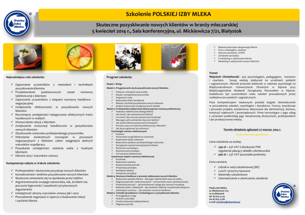 Szkolenie POLSKIEJ IZBY MLEKA Skuteczne pozyskiwanie nowych klientów w branży mleczarskiej 5 kwiecień 2014 r., Sala konferencyjna, ul. Mickiewicza 7/21, Białystok Najważniejsze cele szkolenia: Zapoznanie uczestników z metodami i technikami pozyskiwania klientów Przedstawienie podstawowych zasad rozmowy telefonicznej z klientem Zapoznanie uczestników z etapami rozmowy handlowo negocjacyjnej Zwiększenie efektywności w pozyskiwaniu nowych klientów Rozwinięcie umiejętności redagowania efektywnych treści handlowych w mailach Wzmocnienie relacji z klientem Zwiększenie motywacji handlowców w pozyskiwaniu nowych klientów Zbudowanie wizerunku profesjonalnego pracownika Wdrożenie konkretnych rozwiązań w procesach negocjacyjnych z klientem celem osiągnięcia dobrych warunków współpracy Pozyskanie umiejętności radzenia sobie z trudnymi klientami Obrona ceny i warunków umowy Kompetencje nabyte w trakcie szkolenia: Profesjonalnie i skutecznie pozyskuje nowych klientów Konsekwentne i ambitne pozyskiwanie nowych klientów Skuteczne umawianie się na spotkania przez telefon Argumentowanie swojego stanowiska, tak, że klient ma poczucie logiczności i zasadności przytaczanych argumentów Umiejętność obrony warunków umowy jak i ceny Prowadzenie negocjacji w oparciu o budowanie relacji i zaufanie klienta Program szkolenia: Moduł 1. Wstęp Moduł 2. Przygotowanie się do pozyskiwania nowych klientów Postawa i entuzjazm pracownika Zasoby i kompetencje pracownika Znajomość rynku Budowanie oferty handlowej Metody i techniki pozyskiwania nowych klientów Analiza skuteczności podejmowanych działań Moduł 3. Profesjonalne zdobywanie klienta poprzez rozmowę telefoniczną Podstawy telefonicznej obsługi klienta Jak mówić, aby zainteresować klienta? Co mówić, aby zawrzeć pozytywną transakcję? Dlaczego warto uśmiechać się przez telefon? Jak zarazić klienta pozytywnymi emocjami? Ile masz czasu na rozmowę telefoniczną z klientem? Jak się przygotować do rozmowy? Psychologia rozmów telefonicznych Postawa Utrzymanie uwagi klienta na rozmowie Budowanie relacji z klientem Budowanie zaufania i profesjonalnego wizerunku Zarządzanie stanami emocjonalnymi klienta Rozmowa wychodząca Rozmowa przychodząca Cel rozmowy telefonicznej Scenariusze etapów rozmowy telefonicznej Powitanie Budowanie zaufania Rozpoznawanie potrzeb Prezentacja produktu Rozbijanie obiekcji Zamykanie sprzedaży Moduł 4. Rozmowa handlowa w procesie zdobywania nowych klientów Budowanie zaufania Klienta – dlaczego właśnie klient kupi od ciebie… Diagnoza potrzeb i zadawanie pytań – wzmacnianie stanu zainteresowania Prezentacja korzyści – jak prezentować usługę aby zawrzeć transakcję Radzenie sobie z obiekcjami – jak zamieniać obiekcje na potencjał zakupowy Zamknięcie rozmowy – jak zamykać rozmowy handlowe Moduł 5. Techniki sprzedażowe i marketingowe w pozyskiwaniu klientów Przyciągnięcie uwagi Pytanie o potrzebę Przeformułowanie obiekcji klienta Diagnoza potrzeb Badanie potencjału zakupowego klienta Praca z katalogiem, ulotkami Aktywne słuchanie, LWWW Zamykanie sprzedaży E-marketing w zdobywaniu klienta Marketing a zdobywanie nowych klientów Trener Wojciech Chmielewski - jest psychologiem, pedagogiem, trenerem i coachem. Swoją wiedzę zdobywał na uczelniach polskich i zagranicznych. Obronił przewód doktorski w zakresie psychologii na Międzynarodowym Uniwersytecie Otwartym w Kijowie przy Międzyregionalnej Akademii Zarządzania Personelem w Kijowie. Dodatkowo był uczestnikiem wielu szkoleń prowadzonych przez wykładowców polskich i zagranicznych. Poza kompetencjami naukowymi posiada bogate doświadczenie w prowadzeniu szkoleń, coachingów i doradztwa. Tworzy, koordynuje i prowadzi projekty szkoleniowe skierowane dla administracji, biznesu, instytucji rządowych i pozarządowych. Firmy korzystające z jego usług z uznaniem podkreślają jego niesamowitą skuteczność, profesjonalizm i dar przekazywanej wiedzy. Termin składania zgłoszeń 27 marzec 2014 r. Liczba miejsc jest ograniczona Cena szkolenia za osobę: 250 zł + 23% VAT Członkowie PIM regularnie płacący składki członkowskie 500 zł + 23% VAT pozostałe podmioty Cena zawiera: Udział w sesji szkoleniowej (8h) Lunch i przerwy kawowe Materiały szkoleniowe Zaświadczenie o ukończeniu szkolenia Polska Izba Mleka ul. Mickiewicza 7/23 15-213 Białystok tel. 85 674 73 29 fax 85 874 73 88 e-mail: [email protected] Formularz zgłoszeniowy Skuteczne pozyskiwanie nowych klientów w branży mleczarskiej DANE FIRMY Nazwa firmy (dane do faktury) Adres NIP Telefon i Fax Osoba do kontaktu e-mail do osoby kontaktowej Imię i nazwisko E - mail 1. Lista zgłaszanych Pracowników 2. 3. Cena szkolenia Członkowie PIM – 250 zł + 23% VAT Pozostali uczestnicy – 500 zł + 23% VAT Płatne przelewem na rachunek PIM w terminie 7 dni od wysłania karty zgłoszenia nr konta: PKO BP 43 1020 1042 0000 8502 0185 9636 Rezygnacja ze szkolenia – wymaga pisemnej formy w terminie nie później niż 14 dni przed terminem szkolenia, w innym razie uczestnik zostanie obciążony pełną kwotą szkolenia. Całkowity koszt udziału w szkoleniu wynosi ……………………….. + 23% VAT Niniejsze zgłoszenie upoważnia Polską Izbę Mleka do wystawienia faktury VAT bez podpisu odbiorcy Podpis Pieczęć firmowa Wyrażamy zgodę na przetwarzanie i wykorzystywanie przez Polską Izbę Mleka powyższych informacji zgodnie z zachowaniem postanowień Ustawy o ochronie danych osobowych oraz Ustawy o świadczeniu usług drogą elektroniczną.