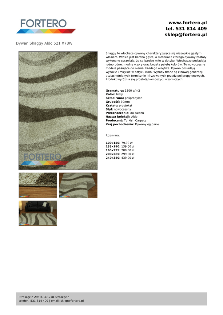 www.fortero.pl tel. 531 814 409 [email protected] Dywan Shaggy Aldo 521 X78W Shaggy to włochate dywany charakteryzujące się niezwykle gęstym włosiem. Włosie jest bardzo gęste, a materiał z którego dywany zostały wykonane sprawiają, że są bardzo miłe w dotyku. Włochacze posiadają różnorodne, modne wzory oraz bogatą paletę kolorów. To nowoczesne modele pasujące do niemal każdego wnętrza. Dywan posiadają wysokie i miękkie w dotyku runo. Wyroby tkane są z nowej generacji. uszlachetnionych termicznie i fryzowanych przędz polipropylenowych. Produkt wyróżnia się prostotą kompozycji wzorniczych. Gramatura: 1800 g/m2 Kolor: biały Skład runa: polipropylen Grubość: 30mm Kształt: prostokąt Styl: nowoczesny Przeznaczenie: do salonu Nazwa kolekcji: Aldo Producent: Turkish Carpets Kraj pochodzenia: Dywany egipskie Rozmiary: 100x150: 133x190: 165x225: 200x285: 240x340: Straszęcin 295 K, 39-218 Straszęcin telefon: 531 814 409 | email: [email protected] 79,00 zł 139,00 zł 209,00 zł 299,00 zł 439,00 zł