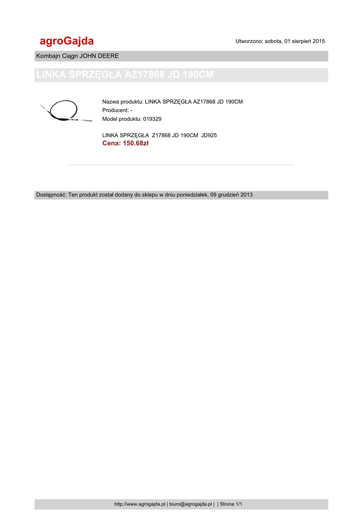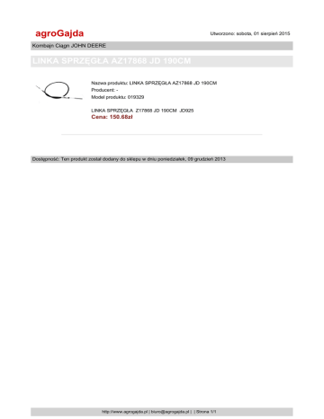 agroGajda Utworzono: sobota, 01 sierpień 2015 Kombajn Ciągn JOHN DEERE LINKA SPRZĘGŁA AZ17868 JD 190CM Nazwa produktu: LINKA SPRZĘGŁA AZ17868 JD 190CM Producent: Model produktu: 019329 LINKA SPRZĘGŁA Z17868 JD 190CM JD925 Cena: 150.68zł Dostępność: Ten produkt został dodany do sklepu w dniu poniedziałek, 09 grudzień 2013 http://www.agrogajda.pl | [email protected] | | Strona 1/1