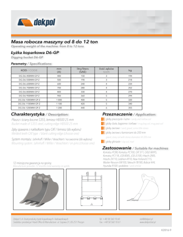 Masa robocza maszyny od 8 do 12 ton Operating weight of the machine: from 8 to 12 tons Łyżka koparkowa D6-GP Digging bucket D6-GP Parametry / Specifications: KOD / CODE mm (A) litry/liters (SAE) ilość zębów teeth kg DG-D6-400MM-GP-Z 400 150 3 194 DG-D6-500MM-GP-Z 500 190 3 218 DG-D6-600MM-GP-Z 600 240 4 234 DG-D6-700MM-GP-Z 700 280 4 252 DG-D6-800MM-GP-Z 800 330 4 270 DG-D6-900MM-GP-Z 900 360 5 294 DG-D6-1000MM-GP-Z 1 000 400 5 320 DG-D6-1100MM-GP-Z 1 100 420 5 340 DG-D6-1200MM-GP-Z 1 200 440 6 355 Charakterystyka / Description: Przeznaczenie / Application: Płaszcz i ściany boczne S355, lemiesz HB500 25 mm Bucket made of S355 steel, cutting edge HB500 25 mm 1 gleby piaszczyste i luźne / sandy and mellow soil Zęby spawane z nakładkami typu CAT / lemiesz (do wyboru) Welded teeth CAT type / blank cutting edge (choose one) System montażu: Lehnhoff / Miller / Verachtert / na sworznie (do wyboru) Mounting system: Lehnhoff / Miller / Verachtert / on pins (choose one) 2 gleby ilaste, bagienne i torfowe / mug bog soil, mug peat soil 3 gleby żwirowe / sand, gravel, some little stones 4 gleby żwirowe z kamieniami do 200 mm gravel, stony soil with stones diameters till 200 mm 5 gleby gliniaste / clay soil, marl Zastosowanie / Suitable for machines 12-miesięczna gwarancja na spoiny. Manufacturer provides 12 months total warranty on welds. Dekpol S.A. Dział produkcji łyżek koparkowych i ładowarkowych Siedziba i produkcja/ Head Office & Manufacture: ul. Gajowa 31, 83-251 Pinczyn Komatsu PC88, Komatsu PC100, CAT 311, CASE WX95, Komatsu PC118, JCB 8085, JCB JS100, Hitachi ZX85, Hitachi ZX110, Liebherr A910, New Holland E115, Wacker Neuson EW100, Takeuchi TB180, Bobcat 444, Hyundai R100 i podobne / and similar Tel. +48 58 560 10 60 Fax. +48 58 560 10 61 [email protected] www.dekpolstal.pl K2016-9