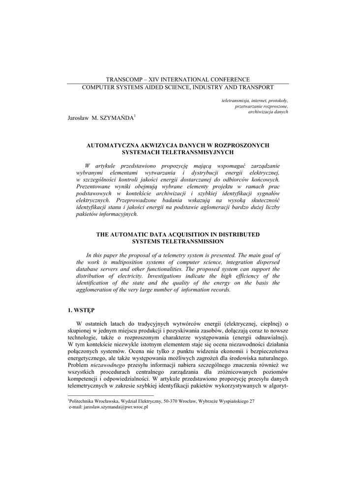 TRANSCOMP – XIV INTERNATIONAL CONFERENCE COMPUTER SYSTEMS AIDED SCIENCE, INDUSTRY AND TRANSPORT teletransmisja, internet, protokoły, przetwarzanie rozproszone, archiwizacja danych Jarosław M. SZYMAŃDA1 AUTOMATYCZNA AKWIZYCJA DANYCH W ROZPROSZONYCH SYSTEMACH TELETRANSMISYJNYCH W artykule przedstawiono propozycję mającą wspomagać zarządzanie wybranymi elementami wytwarzania i dystrybucji energii elektrycznej, w szczególności kontroli jakości energii dostarczanej do odbiorców końcowych. Prezentowane wyniki obejmują wybrane elementy projektu w ramach prac podstawowych w kontekście archiwizacji i szybkiej identyfikacji sygnałów elektrycznych. Przeprowadzone badania wskazują na wysoką skuteczność identyfikacji stanu i jakości energii na podstawie aglomeracji bardzo dużej liczby pakietów informacyjnych. THE AUTOMATIC DATA ACQUISITION IN DISTRIBUTED SYSTEMS TELETRANSMISSION In this paper the proposal of a telemetry system is presented. The main goal of the work is multiposition systems of computer science, integration dispersed database servers and other functionalities. The proposed system can support the distribution of electricity. Investigations indicate the high efficiency of the identification of the state and the quality of the energy on the basis the agglomeration of the very large number of information records. 1. WSTĘP W ostatnich latach do tradycyjnych wytwórców energii (elektrycznej, cieplnej) o skupionej w jednym miejscu produkcji i pozyskiwania zasobów, dołączają coraz to nowsze technologie, także o rozproszonym charakterze występowania (energii odnawialnej). W tym kontekście niezwykle istotnym elementem staje się ocena niezawodności działania połączonych systemów. Ocena nie tylko z punktu widzenia ekonomii i bezpieczeństwa energetycznego, ale także występowania możliwych zagrożeń dla środowiska naturalnego. Problem niezawodnego przesyłu informacji nabiera szczególnego znaczenia również we wszystkich procedurach centralnego zarządzania dla zróżnicowanych poziomów kompetencji i odpowiedzialności. W artykule przedstawiono propozycję przesyłu danych telemetrycznych w zakresie szybkiej identyfikacji pakietów wykorzystywanych w algoryt1 Politechnika Wrocławska, Wydział Elektryczny, 50-370 Wrocław, Wybrzeże Wyspiańskiego 27 e-mail: [email protected] 2 Jarosław M. SZYMAŃDA mach kontroli jakości energii elektrycznej (m.in. według PN-EN 50160). Telemetria to dziedzina telekomunikacji zajmująca się technikami przesyłu wartości pomiarowych i diagnostycznych na odległość. Polega zazwyczaj na umieszczaniu w terenie urządzeń, które dokonują pomiaru wybranej wielkości oraz automatycznym przesyle danych (drogą radiową, za pośrednictwem telefonii komórkowej i satelitarnej, poprzez Internet itd.) do systemu centralnego (Rys.1) [1,2,3]. Telemetria to także zarządzanie i nadzorowanie elementów odpowiedzialnych za bezpieczną eksploatację całych systemów od wytwórców i dystrybutorów energii do odbiorców końcowych. Rys.1. Wybrane komponenty systemu transmisji danych (telemetrii) 2. ZAŁOŻENIA PROJEKTOWE 2.1 Strukturalny przepływ informacji Podczas realizacji pierwszego etapu projektu przyjęto następujące założenia ogólne: • dostosowanie projektu do ogólnodostępnych systemów dystrybucji informacji przy uwzględnieniu niskich nakładów budżetowych na poziomie lokalnych dostawców (elektrownie wodne, wiatrowe) i odbiorców gminnych oraz powiatowych (urzędy, podstacje ZE, itp.); • promocja i rozbudowa istniejącej w danej lokalizacji, strukturalnej sieci teleinformatycznej z możliwością dostępu do publicznej sieci Internet (docelowo IPv6); AUTOMATYCZNA AKWIZYCJA DANYCH... • 3 komunikacja pomiędzy stacjami (komputerowymi) odbywać się będzie z wykorzystaniem protokołów TCP/IP; • podstawowymi jednostkami funkcjonalnymi systemu będą procesy (programy, procedury systemu operacyjnego) uruchamiane w dowolnej liczbie kopii, na każdej stacji komputerowej (terminalu); każdy proces jest integralnym węzłem całej struktury przetwarzania rozproszonego; • centralną jednostką systemu będą stacje komputerowe (serwery aplikacyjne) z zainstalowanym na nich współdzielonym obszarem pamięci operacyjnej, do którego mają dostęp wszystkie procesy; posiadająca system zarządzania tym obszarem pamięci i wymianą informacji pomiędzy procesami (struktura klastrowa); • integralnymi elementami jednostki centralnej będą procedury szybkiej archiwizacji i identyfikacji pakietów, z zastosowaniem najistotniejszych elementów systemu zarządzania bazami danych (SZBD); w pierwszej fazie z wykorzystaniem modelu relacyjnego (docelowo relacyjno-obiektowego)[4]; W szczególności dla procesów określono m.in., że: • każdy proces będzie realizować ustalony zakres zleceń zależnych od możliwości stacji komputerowej oraz interfejsów wykonawczych (przetworniki A/C, mierniki jakości energii), na której jest uruchomiony; procesy realizujące ten sam zakres zleceń utworzą Typ identyfikowany w nazwie procesu (katalogowanie procesów); • procesy lokalizowane będą w systemie monitorowania i akwizycji pakietów na podstawie unikalnego formatu identyfikacyjnego zawierającego m. in. adres sieciowy IP, współrzędne lokalizacyjne GPS, typ procesu oraz kolejny numer wywołania (dla algorytmu zstępującego [9]); • wymiana informacji pomiędzy procesami odbywać się będzie poprzez współdzielony obszar pamięci jednostki centralnej, pełniącej rolę nadrzędną w stosunku do pozostałych; • każdy proces po uruchomieniu będzie „rejestrował się automatycznie”, wprowadzając swój identyfikator do współdzielonego obszaru pamięci; identyfikator stanowi jednoznaczne określenie węzła przetwarzania rozproszonego; • na każdej stacji komputerowej pierwszy proces będzie mógł być uruchamiany lokalnie (konsola), zdalnie (RPC) i/lub w trybie przerwań systemu operacyjnego wa