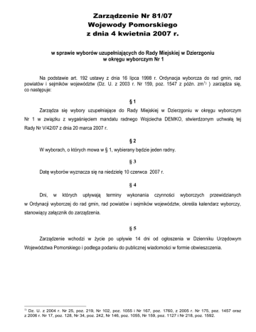 Zarządzenie Nr 81/07 Wojewody Pomorskiego z dnia 4 kwietnia 2007 r. w sprawie wyborów uzupełniających do Rady Miejskiej w Dzierzgoniu w okręgu wyborczym Nr 1 Na podstawie art. 192 ustawy z dnia 16 lipca 1998 r. Ordynacja wyborcza do rad gmin, rad powiatów i sejmików województw (Dz. U. z 2003 r. Nr 159, poz. 1547 z późn. zm 1) ) zarządza się, co następuje: §1 Zarządza się wybory uzupełniające do Rady Miejskiej w Dzierzgoniu w okręgu wyborczym Nr 1 w związku z wygaśnięciem mandatu radnego Wojciecha DEMKO, stwierdzonym uchwałą tej Rady Nr V/42/07 z dnia 20 marca 2007 r. §2 W wyborach, o których mowa w § 1, wybierany będzie jeden radny. §3 Datę wyborów wyznacza się na niedzielę 10 czerwca 2007 r. §4 Dni, w których upływają terminy wykonania czynności wyborczych przewidzianych w Ordynacji wyborczej do rad gmin, rad powiatów i sejmików województw, określa kalendarz wyborczy, stanowiący załącznik do zarządzenia. §5 Zarządzenie wchodzi w życie po upływie 14 dni od ogłoszenia w Dzienniku Urzędowym Województwa Pomorskiego i podlega podaniu do publicznej wiadomości w formie obwieszczenia. 1) Dz. U. z 2004 r. Nr 25, poz. 219, Nr 102, poz. 1055 i Nr 167, poz. 1760, z 2005 r. Nr 175, poz. 1457 oraz z 2006 r. Nr 17, poz. 128, Nr 34, poz. 242, Nr 146, poz. 1055, Nr 159, poz. 1127 i Nr 218, poz. 1592. Załącznik do zarządzenia Nr 81/07 Wojewody Pomorskiego z dnia 04.04. 2007 r. KALENDARZ WYBORCZY Termin wykonania czynności wyborczej do 21 kwietnia 2007 r. Treść czynności podanie do publicznej wiadomości w formie obwieszczenia Burmistrza Dzierzgonia informacji o granicach okręgu wyborczego i liczbie radnych wybieranych w okręgu Nr 1 oraz o siedzibie Miejskiej Komisji Wyborczej, zawiadomienie Komisarza Wyborczego o utworzeniu komitetu wyborczego oraz o zamiarze zgłaszania kandydatów na radnego do 26 kwietnia 2007 r. powołanie przez Komisarza Wyborczego Miejskiej Komisji Wyborczej dla przeprowadzenia wyborów uzupełniających w okręgu wyborczym Nr 1. do 11 maja 2007 r. do godz. 24.00 do 20 maja 2007 r. zgłaszanie Miejskiej Komisji Wyborczej list kandydatów na radnego wybieranego w okręgu wyborczym. powołanie przez Miejską Komisję Wyborczą Obwodowej Komisji Wyborczej na czas przeprowadzenia wyborów uzupełniających, podanie do publicznej wiadomości w formie obwieszczenia Burmistrza Miasta informacji o granicy i numerze obwodu głosowania oraz o siedzibie Obwodowej Komisji Wyborczej powołanej dla przeprowadzenia głosowania w wyborach uzupełniających. do 26 maja 2007 r. rozplakatowanie obwieszczenia Miejskiej Komisji Wyborczej o zarejestrowanych listach kandydatów na radnego wybieranego w wyborach uzupełniających do 27 maja 2007 r. sporządzenie spisu wyborców. 8 czerwca 2007 r. o godz. 24.00 9 czerwca 2007 r. zakończenie kampanii wyborczej. przekazanie Przewodniczącemu Obwodowej Komisji Wyborczej spisu wyborców. 10 czerwca 2007 r. godz. 6.oo-20.oo głosowanie.