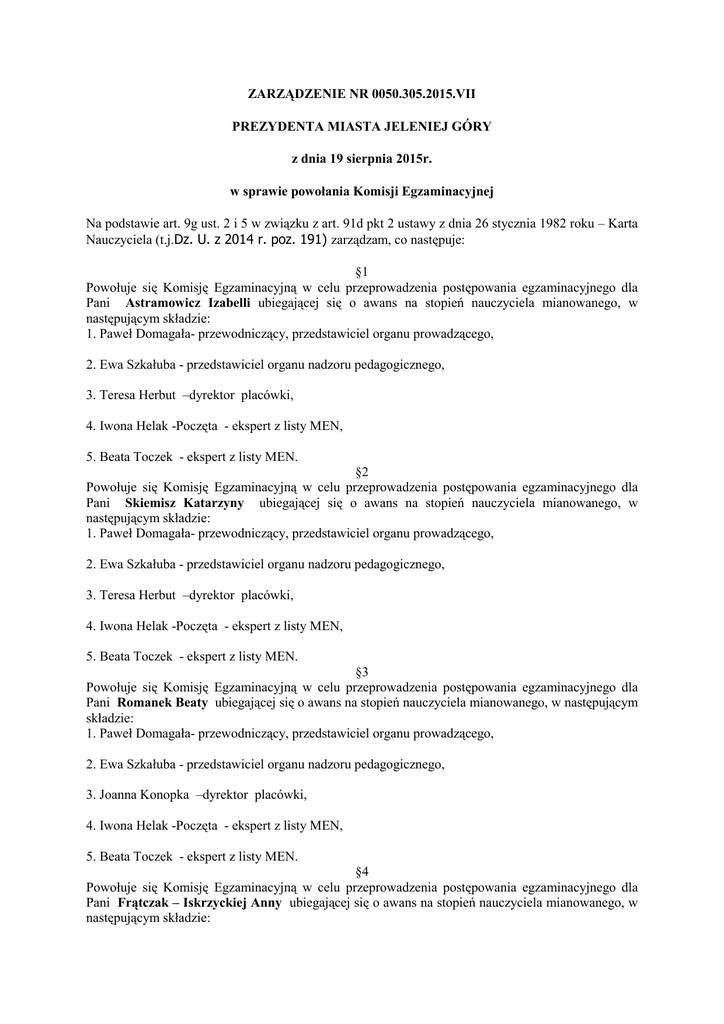 ZARZĄDZENIE NR 0050.305.2015.VII PREZYDENTA MIASTA JELENIEJ GÓRY z dnia 19 sierpnia 2015r. w sprawie powołania Komisji Egzaminacyjnej Na podstawie art. 9g ust. 2 i 5 w związku z art. 91d pkt 2 ustawy z dnia 26 stycznia 1982 roku – Karta Nauczyciela (t.j.Dz. U. z 2014 r. poz. 191) zarządzam, co następuje: §1 Powołuje się Komisję Egzaminacyjną w celu przeprowadzenia postępowania egzaminacyjnego dla Pani Astramowicz Izabelli ubiegającej się o awans na stopień nauczyciela mianowanego, w następującym składzie: 1. Paweł Domagała- przewodniczący, przedstawiciel organu prowadzącego, 2. Ewa Szkałuba - przedstawiciel organu nadzoru pedagogicznego, 3. Teresa Herbut –dyrektor placówki, 4. Iwona Helak -Poczęta - ekspert z listy MEN, 5. Beata Toczek - ekspert z listy MEN. §2 Powołuje się Komisję Egzaminacyjną w celu przeprowadzenia postępowania egzaminacyjnego dla Pani Skiemisz Katarzyny ubiegającej się o awans na stopień nauczyciela mianowanego, w następującym składzie: 1. Paweł Domagała- przewodniczący, przedstawiciel organu prowadzącego, 2. Ewa Szkałuba - przedstawiciel organu nadzoru pedagogicznego, 3. Teresa Herbut –dyrektor placówki, 4. Iwona Helak -Poczęta - ekspert z listy MEN, 5. Beata Toczek - ekspert z listy MEN. §3 Powołuje się Komisję Egzaminacyjną w celu przeprowadzenia postępowania egzaminacyjnego dla Pani Romanek Beaty ubiegającej się o awans na stopień nauczyciela mianowanego, w następującym składzie: 1. Paweł Domagała- przewodniczący, przedstawiciel organu prowadzącego, 2. Ewa Szkałuba - przedstawiciel organu nadzoru pedagogicznego, 3. Joanna Konopka –dyrektor placówki, 4. Iwona Helak -Poczęta - ekspert z listy MEN, 5. Beata Toczek - ekspert z listy MEN. §4 Powołuje się Komisję Egzaminacyjną w celu przeprowadzenia postępowania egzaminacyjnego dla Pani Frątczak – Iskrzyckiej Anny ubiegającej się o awans na stopień nauczyciela mianowanego, w następującym składzie: 1. Paweł Domagała- przewodniczący, przedstawiciel organu prowadzącego, 2. Ewa Szkałuba - przedstawiciel organu nadzoru pedagogicznego, 3. Joanna Konopka –dyrektor placówki, 4. Iwona Helak -Poczęta - ekspert z listy MEN, 5. Beata Toczek - ekspert z listy MEN. §5 Powołuje się Komisję Egzaminacyjną w celu przeprowadzenia postępowania egzaminacyjnego dla Pani Stolarskiej Agnieszki ubiegającej się o awans na stopień nauczyciela mianowanego, w następującym składzie: 1. Paweł Domagała- przewodniczący, przedstawiciel organu prowadzącego, 2. Ewa Szkałuba - przedstawiciel organu nadzoru pedagogicznego, 3. Violetta Pyrzanowska –dyrektor placówki, 4. Iwona Helak -Poczęta - ekspert z listy MEN, 5. Beata Toczek - ekspert z listy MEN. §6 Powołuje się Komisję Egzaminacyjną w celu przeprowadzenia postępowania egzaminacyjnego dla Pani Jarosz Angeliki ubiegającej się o awans na stopień nauczyciela mianowanego, w następującym składzie: 1. Paweł Domagała- przewodniczący, przedstawiciel organu prowadzącego, 2. Ewa Szkałuba - przedstawiciel organu nadzoru pedagogicznego, 3. Joanna Skoczek –dyrektor placówki, 4. Iwona Helak -Poczęta - ekspert z listy MEN, 5. Beata Toczek - ekspert z listy MEN. §7 Powołuję Panią Katarzynę Jabłońską – Elert –Inspektora w Wydziale Edukacji i Sportu jako sekretarza komisji egzaminacyjnych. §8 Wykonanie zarządzenia powierza się przewodniczącemu Komisji. Prezydent Miasta Jeleniej Góry