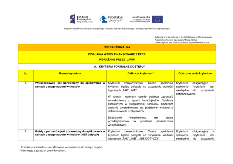Załącznik nr 3 do Uchwały nr 91/2016 Komitetu Monitorującego Regionalny Program Operacyjny Województwa Lubelskiego na lata 2014-2020 z dnia 17 października 2016 r. OCENA FORMALNA DZIAŁANIA WSPÓŁFINANSOWANE Z EFRR WDRAŻANE PRZEZ LAWP A. KRYTERIA FORMALNE DOSTĘPU1 Lp. Nazwa kryterium Definicja kryterium2 Opis znaczenia kryterium 1. Wnioskodawca jest uprawniony do aplikowania w ramach danego naboru wniosków Kryterium zerojedynkowe. Ocena spełnienia kryterium będzie polegała na przyznaniu wartości logicznych „TAK”, „NIE”. Kryterium obligatoryjne – spełnienie kryterium jest niezbędne do przyznania dofinansowania. W ramach kryterium ocenie podlega zgodność wnioskodawcy z typami beneficjentów Działania określonymi w Regulaminie konkursu. Kryterium zostanie zweryfikowane na podstawie wniosku o dofinansowanie i załączników. Dodatkowo weryfikowany jest status przedsiębiorstwa na podstawie oświadczenia wnioskodawcy. 2. 1 2 Każdy z partnerów jest uprawniony do aplikowania w ramach danego naboru wniosków (jeśli dotyczy) Kryteria indywidualne – weryfikowane w odniesieniu do danego projektu. Informacja o zasadach oceny kryterium. Kryterium zerojedynkowe. Ocena spełnienia kryterium będzie polegała na przyznaniu wartości logicznych „TAK”, „NIE”, ,,NIE DOTYCZY”. Kryterium spełnienie niezbędne obligatoryjne – kryterium jest do przyznania Załącznik nr 3 do Uchwały nr 91/2016 Komitetu Monitorującego Regionalny Program Operacyjny Województwa Lubelskiego na lata 2014-2020 z dnia 17 października 2016 r. W ramach kryterium ocenie podlega zgodność partnerów wnioskodawcy z typami beneficjentów Działania określonymi w Regulaminie konkursu. Kryterium zostanie zweryfikowane na podstawie wniosku o dofinansowanie i załączników. dofinansowania (jeśli dotyczy). Dodatkowo weryfikowany jest status przedsiębiorstwa na podstawie oświadczenia. 3. Wnioskodawca nie został wykluczony z możliwości ubiegania się o wsparcie z funduszy strukturalnych w trybie określonym w przepisach o finansach publicznych i/lub wobec wnioskodawcy nie orzeczono zakazu dostępu do środków funduszy europejskich na podstawie ustawy o skutkach powierzenia wykonywania pracy cudzoziemcom przebywającym wbrew przepisom na terytorium Rzeczpospolitej Polskiej i/lub ustawy o odpowiedzialności podmiotów zbiorowych za czyny zabronione pod groźbą kary Kryterium zerojedynkowe. Ocena spełnienia kryterium będzie polegała na przyznaniu wartości logicznych „TAK”, „NIE”. Kryterium obligatoryjne – spełnienie kryterium jest niezbędne do przyznania dofinansowania. W tym kryterium mowa jest o wykluczeniu, na podstawie art. 207 ust. 4 ustawy o finansach publicznych, art. 12 ust. 1 pkt. 1 ustawy o skutkach powierzenia wykonywania pracy cudzoziemcom przebywającym wbrew przepisom na terenie RP, art. 9 ust. 1 pkt. 2a ustawy o odpowiedzialności podmiotów zbiorowych za czyny zabronione pod groźbą kary. Członkowie KOP dokonują weryfikacji kryterium na podstawie odpowiedzi przesłanej z Ministerstwa Finansów oraz na podstawie oświadczenia wnioskodawcy. 4. Żaden z partnerów wnioskodawcy nie został wykluczony z możliwości ubiegania się o wsparcie z funduszy strukturalnych w trybie określonym w przepisach o finansach publicznych i/lub żadnego z partnerów nie orzeczono zakazu dostępu do środków funduszy europejskich na podstawie ustawy o skutkach powierzenia wykonywania pracy cudzoziemcom przebywającym wbrew przepisom na terytorium Rzeczpospolitej Polskiej i/lub ustawy o odpowiedzialności podmiotów zbiorowych za czyny Kryterium zerojedynkowe. Ocena spełnienia kryterium będzie polegała na przyznaniu wartości logicznych „TAK”, „NIE”, ,,NIE DOTYCZY”. Kryterium obligatoryjne – spełnienie kryterium jest niezbędne do przyznania dofinansowania (jeśli dotyczy). W tym kryterium mowa jest o wykluczeniu, na podstawie art. 207 ust. 4 ustawy o finansach publicznych, art. 12 ust. 1 pkt. 1 ustawy o skutkach powierzenia wykonywania pracy cudzoziemcom przebywającym wbrew przepisom na terenie RP, art. 9 ust. 1 pkt. 2a ustawy o odpowiedzialności 2 Załącznik nr 3 do Uchwały nr 91/2016 Komitetu Monitorującego Regionalny Program Operacyjny Województwa Lubelskiego na lata 2014-2020 z dnia 17 października 2016 r. zabronione pod groźbą kary (jeśli dotyczy) podmiotów zbiorowych za czyny zabronione pod groźbą kary. Członkowie KOP dokonują weryfikacji kryterium na podstawie odpowiedzi przesłanej z Ministerstwa Finansów oraz na podstawie oświadczenia wnioskodawcy. 5. 6. 7. Całkowita wartość projektu oraz wartość wydatków kwalifikowalnych mieszczą się w przedziałach minimalnej i maksymalnej wartości projektu oraz wartości wydatków kwalifikowalnych dla danego Działania/typu projektów (jeśli dotyczy) Kryterium zerojedynkowe. Ocena spełnienia kryterium będzie polegała na przyznaniu wartości logicznych „TAK”, „NIE”, „NIE DOTYCZY”. Kwota dofinansowania jest zgodna z przedziałem kwotowym minimalnej (jeśli dotyczy) i maksymalnej kwoty dofinansowania, przewidzianym dla danego Działania/typu projektu. Kryterium zerojedynkowe. Ocena spełnienia kryterium będzie polegała na przyznaniu wartości logicznych „TAK”, „NIE”. Wniosek jest pierwszym złożonym przez Wnioskodawcę w ramach danego naboru (jeśli dotyczy zgodnie z Regulaminem konkursu) Kryterium zerojedynkowe. Ocena spełnienia kryterium będzie polegała na przyznaniu wartości logicznych „TAK”, „NIE”, „NIE DOTYCZY”. W ramach kryterium ocenie podlega zgodność całkowitej wartości projektu oraz wartości wydatków kwalifikowalnych z wartościami przewidzianymi dla danego Działania/typu projektu (jeśli dotyczy) określonymi w "Szczegółowym opisie osi priorytetowych RPO WL 2014-2020" lub w Regulaminie konkursu. W ramach kryterium ocenie podlega zgodność kwoty dofinansowania z przedziałem kwotowym minimalnej (jeśli dotyczy) i maksymalnej kw