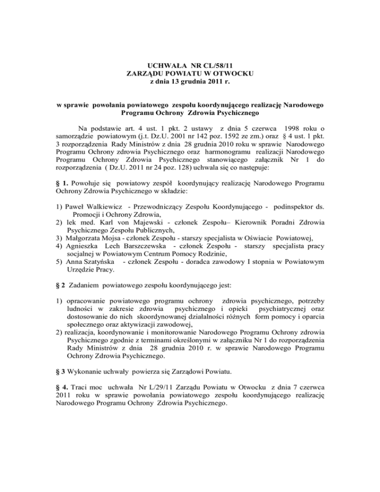 UCHWAŁA NR CL/58/11 ZARZĄDU POWIATU W OTWOCKU z dnia 13 grudnia 2011 r. w sprawie powołania powiatowego zespołu koordynującego realizację Narodowego Programu Ochrony Zdrowia Psychicznego Na podstawie art. 4 ust. 1 pkt. 2 ustawy z dnia 5 czerwca 1998 roku o samorządzie powiatowym (j.t. Dz.U. 2001 nr 142 poz. 1592 ze zm.) oraz § 4 ust. 1 pkt. 3 rozporządzenia Rady Ministrów z dnia 28 grudnia 2010 roku w sprawie Narodowego Programu Ochrony zdrowia Psychicznego oraz harmonogramu realizacji Narodowego Programu Ochrony Zdrowia Psychicznego stanowiącego załącznik Nr 1 do rozporządzenia ( Dz.U. 2011 nr 24 poz. 128) uchwala się co następuje: § 1. Powołuje się powiatowy zespół koordynujący realizację Narodowego Programu Ochrony Zdrowia Psychicznego w składzie: 1) Paweł Walkiewicz - Przewodniczący Zespołu Koordynującego - podinspektor ds. Promocji i Ochrony Zdrowia, 2) lek med. Karl von Majewski - członek Zespołu– Kierownik Poradni Zdrowia Psychicznego Zespołu Publicznych, 3) Małgorzata Mojsa - członek Zespołu - starszy specjalista w Oświacie Powiatowej, 4) Agnieszka Lech Barszczewska - członek Zespołu - starszy specjalista pracy socjalnej w Powiatowym Centrum Pomocy Rodzinie, 5) Anna Szatyńska - członek Zespołu - doradca zawodowy I stopnia w Powiatowym Urzędzie Pracy. § 2 Zadaniem powiatowego zespołu koordynującego jest: 1) opracowanie powiatowego programu ochrony zdrowia psychicznego, potrzeby ludności w zakresie zdrowia psychicznego i opieki psychiatrycznej oraz dostosowanie do nich skoordynowanej działalności róŜnych form pomocy i oparcia społecznego oraz aktywizacji zawodowej, 2) realizacja, koordynowanie i monitorowanie Narodowego Programu Ochrony zdrowia Psychicznego zgodnie z terminami określonymi w załączniku Nr 1 do rozporządzenia Rady Ministrów z dnia 28 grudnia 2010 r. w sprawie Narodowego Programu Ochrony Zdrowia Psychicznego. § 3 Wykonanie uchwały powierza się Zarządowi Powiatu. § 4. Traci moc uchwała Nr L/29/11 Zarządu Powiatu w Otwocku z dnia 7 czerwca 2011 roku w sprawie powołania powiatowego zespołu koordynującego realizację Narodowego Programu Ochrony Zdrowia Psychicznego. § 5. Uchwała wchodzi w Ŝycie z dniem podjęcia. Podpisy członków Zarządu Powiatu: Przewodnicząca Zarządu Bogumiła Więckowska 1. ................................................ Wicestarosta Mirosław Pszonka 2. ............................................... Członek Zarządu Janusz Budny 3. ............................................... Członek Zarządu Grzegorz Michalczyk 4. ........................................ Członek Zarządu Krzysztof Szczegielniak 5. ............................................. Uzasadnienie Z dniem 20 lipca 2011 roku pani Eliza Widłak złoŜyła wypowiedzenie umowy o pracę , tym samym uległ rozwiązaniu stosunek pracy z wyŜej wymienioną. W trybie naboru kandydatów, na istniejący wakat na stanowisku ds. Promocji i Ochrony Zdrowia, wyłoniono ofertę pana Pawła Walkiewicza. W dniu 21 października 2011 roku pan Franciszek von Majewski złoŜył rezygnację z pracy z Powiatowym Zespole Koordynującym Realizację Narodowego Programu Ochrony Zdrowia Psychicznego. Dodatkowo naleŜy określić funkcje w składzie osobowym powołanego Zespołu. Przewodnicząca Zarządu Bogumiła Więckowska
