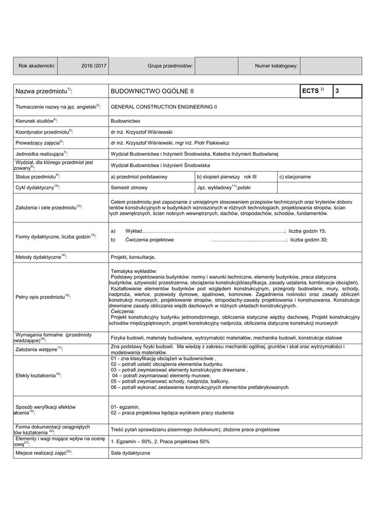 Rok akademicki: Grupa przedmiotów: 2016 /2017 Numer katalogowy: Nazwa przedmiotu1): BUDOWNICTWO OGÓLNE II Tłumaczenie nazwy na jęz. angielski3): GENERAL CONSTRUCTION ENGINEERING II Kierunek studiów4): Budownictwo 5) ECTS 2) dr inż. Krzysztof Wiśniewski Koordynator przedmiotu : 6) Prowadzący zajęcia : dr inż. Krzysztof Wiśniewski, mgr inż. Piotr Flakiewicz Jednostka realizująca7): Wydział Budownictwa i Inżynierii Środowiska, Katedra Inżynierii Budowlanej Wydział, dla którego przedmiot jest realizowany8): Wydział Budownictwa i Inżynierii Środowiska Status przedmiotu9): a) przedmiot podstawowy 10) Cykl dydaktyczny : Semestr zimowy Założenia i cele przedmiotu12): 3 b) stopień pierwszy rok III c) stacjonarne 11) Jęz. wykładowy :polski Celem przedmiotu jest zapoznanie z umiejętnym stosowaniem przepisów technicznych oraz kryteriów doboru elementów konstrukcyjnych w budynkach wznoszonych w różnych technologiach, projektowania stropów, ścian nośnych zewnętrznych, ścian nośnych wewnętrznych, dachów, stropodachów, schodów, fundamentów. Formy dydaktyczne, liczba godzin13): Metody dydaktyczne14): Pełny opis przedmiotu15): Wymagania formalne (przedmioty wprowadzające)16): a) Wykład.…………….……………………………………………………………; liczba godzin 15; b) Ćwiczenia projektowe ………………………………………; liczba godzin 30; Projekt, konsultacje, Tematyka wykładów: Podstawy projektowania budynków: normy i warunki techniczne, elementy budynków, praca statyczna budynków, sztywność przestrzenna, obciążenia konstrukcji(klasyfikacja, zasady ustalania, kombinacje obciążeń). Kształtowanie elementów budynków pod względem konstrukcyjnym, przegrody budowlane, mury, schody, nadproża, wieńce, przewody dymowe, spalinowe, kominowe. Zagadnienia nośności oraz zasady obliczeń konstrukcji murowych, projektowanie stropów, stropodachy-zasady projektowania i konstruowania. Konstrukcje drewniane zasady obliczania więźb dachowych w różnych układach konstrukcyjnych. Ćwiczenia: Projekt konstrukcyjny budynku jednorodzinnego, obliczenia statyczne więźby dachowej, Projekt konstrukcyjny schodów międzypiętrowych, projekt konstrukcyjny nadproża, obliczenia statyczne konstrukcji murowych Fizyka budowli, materiały budowlane, wytrzymałość materiałów, mechanika budowli, konstrukcje stalowe Zna podstawy fizyki budowli. Ma wiedzę z zakresu mechaniki ogólnej, gruntów i skał oraz wytrzymałości i modelowania materiałów. 01 - zna klasyfikację obciążeń w budownictwie , 02 – potrafi ustalić obciążenia elementów budynku 03 – potrafi zwymiarować elementy konstrukcyjne drewniane , 04 – potrafi zwymiarować elementy murowe, 05 – potrafi zwymiarować schody, nadproża, balkony, 06 – potrafi wykonać zestawienie konstrukcyjnych elementów prefabrykowanych Założenia wstępne17): Efekty kształcenia18): Sposób weryfikacji efektów kształcenia19): Forma dokumentacji osiągniętych efektów kształcenia 20): Elementy i wagi mające wpływ na ocenę końcową21): 22) Miejsce realizacji zajęć : 01- egzamin, 02 – praca projektowa będąca wynikiem pracy studenta Treść pytań sprawdzianu pisemnego (kolokwium), złożone prace projektowe 1. Egzamin – 50%, 2. Praca projektowa 50% Sala dydaktyczna Literatura podstawowa i uzupełniająca23): 1. Neufert E.: .Podręcznik projektowania architektoniczno-budowlanego, Arkady, Warszawa, 2007. 2 Piliszek E. :Vademecum budowlane. Arkady Warszawa, 2002. 3. Budownictwo ogólne, Praca zbiorowa-Tom1 i Tom 2, Arkady, Warszawa 2007 4. Starosolski Wł. Konstrukcje żelbetowe. Tom 1. : Według PN-B-03264:2002 i Eurokodu 2. Wydawnictwo Naukowe PWN,: 2006 5. Kotwica J.: Konstrukcje drewniane w budownictwie tradycyjnym, Arkady, Warszawa 2004 6. Pyrak St. Konstrukcje z betonu WSiP Warszawa 2001 UWAGI24): Wskaźniki ilościowe charakteryzujące moduł/przedmiot 25) : Szacunkowa sumaryczna liczba godzin pracy studenta (kontaktowych i pracy własnej) niezbędna dla osiągnięcia zakładanych efektów kształcenia18) - na tej podstawie należy wypełnić pole ECTS2: 100 h Łączna liczba punktów ECTS, którą student uzyskuje na zajęciach wymagających bezpośredniego udziału nauczycieli akademickich: 2 ECTS Łączna liczba punktów ECTS, którą student uzyskuje w ramach zajęć o charakterze praktycznym, takich jak zajęcia laboratoryjne, projektowe, itp.: 1 ECTS Tabela zgodności kierunkowych efektów kształcenia efektami przedmiotu 26) Nr /symbol efektu 01 Wymienione w wierszu efekty kształcenia: zna klasyfikację obciążeń w budownictwie Odniesienie do efektów dla programu kształcenia na kierunku K_W05 02 potrafi ustalić obciążenia elementów budynku K_W05, K_W06 03 potrafi zwymiarować elementy konstrukcyjne drewniane , K_W07, K_W08, K_W10, K_U08, K_U12 04 potrafi zwymiarować elementy murowe, K_W02, K_W10, K_W12, K_U02,K_U12, 05 potrafi zwymiarować schody, nadproża, balkony K_W02, K_W10, K_W12, K_U02,K_U12, 06 potrafi wykonać zestawienie konstrukcyjnych elementów prefabrykowanych K_W02, K_W10, K_W12, K_U02,K_U12,
