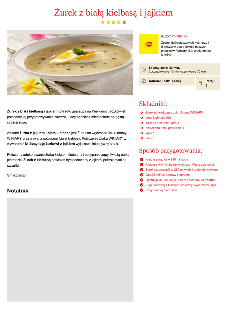 Żurek z białą kiełbasą i jajkiem Autor: WINIARY Zespół doświadczonych kucharzy i dietetyków dba o jakość naszych przepisów. Winiary.pl to znak smaku i jakości. Łączny czas: 40 min. ( przygotowanie 10 min. oczekiwanie 30 min. ) Kalorie: kcal/1 porcję Porcji: 2 Składniki: Żurek z białą kiełbasą i jajkiem to tradycyjna zupa na Wielkanoc, aczkolwiek Żurek na wędzonce Jak u Mamy WINIARY 1 polecamy jej przygotowywanie zawsze, kiedy będziesz mieć ochotę na gęstą i sycącą zupę. biała kiełbasa 100 kwaśna śmietana 18% 1 posiekana natki pietruszki 1 Atutami żurku z jajkiem i białą kiełbasą jest Żurek na wędzonce Jak u mamy jajko 1 WINIARY oraz wywar z gotowanej białej kiełbasy. Połączenie Żurku WINIARY z pieprz wywarem z kiełbasy daje żurkowi z jajkiem wyjątkowo intensywny smak. Polecamy udekorowanie żurku kleksem śmietany i posypanie zupy świeżą natką pietruszki. Żurek z kiełbasą powinien być podawany z jajkami pokrojonymi na ćwiartki. Sposób przygotowania: Kiełbasę ugotuj w 250 ml wody. Kiełbasę wyjmij i pokrój w plastry. Wodę zachowaj. Żurek rozprowadź w 250 ml wody i dodaj do wywaru. Smacznego! Gotuj 5 minut, dopraw pieprzem. Ugotuj jajko, ostudź je, obierz i przekrój na ćwiartki. Zupę podawaj z kleksem śmietany, ćwiartkami jajek. Notatnik Posyp natką pietruszki.