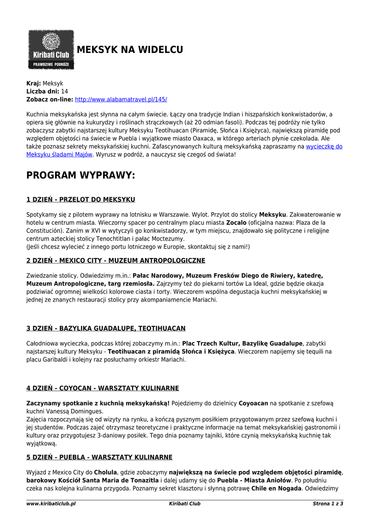 MEKSYK NA WIDELCU Kraj: Meksyk Liczba dni: 14 Zobacz on-line: http://www.alabamatravel.pl/145/ Kuchnia meksykańska jest słynna na całym świecie. Łączy ona tradycje Indian i hiszpańskich konkwistadorów, a opiera się głównie na kukurydzy i roślinach strączkowych (aż 20 odmian fasoli). Podczas tej podróży nie tylko zobaczysz zabytki najstarszej kultury Meksyku Teotihuacan (Piramidę, Słońca i Księżyca), największą piramidę pod względem objętości na świecie w Puebla i wyjątkowe miasto Oaxaca, w którego arteriach płynie czekolada. Ale także poznasz sekrety meksykańskiej kuchni. Zafascynowanych kulturą meksykańską zapraszamy na wycieczkę do Meksyku śladami Majów. Wyrusz w podróż, a nauczysz się czegoś od świata! PROGRAM WYPRAWY: 1 DZIEŃ - PRZELOT DO MEKSYKU Spotykamy się z pilotem wyprawy na lotnisku w Warszawie. Wylot. Przylot do stolicy Meksyku. Zakwaterowanie w hotelu w centrum miasta. Wieczorny spacer po centralnym placu miasta Zocalo (oficjalna nazwa: Plaza de la Constitución). Zanim w XVI w wytyczyli go konkwistadorzy, w tym miejscu, znajdowało się polityczne i religijne centrum azteckiej stolicy Tenochtitlan i pałac Moctezumy. (Jeśli chcesz wylecieć z innego portu lotniczego w Europie, skontaktuj się z nami!) 2 DZIEŃ - MEXICO CITY - MUZEUM ANTROPOLOGICZNE Zwiedzanie stolicy. Odwiedzimy m.in.: Pałac Narodowy, Muzeum Fresków Diego de Riwiery, katedrę, Muzeum Antropologiczne, targ rzemiosła. Zajrzymy też do piekarni tortów La Ideal, gdzie będzie okazja podziwiać ogromnej wielkości kolorowe ciasta i torty. Wieczorem wspólna degustacja kuchni meksykańskiej w jednej ze znanych restauracji stolicy przy akompaniamencie Mariachi. 3 DZIEŃ - BAZYLIKA GUADALUPE, TEOTIHUACAN Całodniowa wycieczka, podczas której zobaczymy m.in.: Plac Trzech Kultur, Bazylikę Guadalupe, zabytki najstarszej kultury Meksyku - Teotihuacan z piramidą Słońca i Księżyca. Wieczorem napijemy się tequili na placu Garibaldi i kolejny raz posłuchamy orkiestr Mariachi. 4 DZIEŃ - COYOCAN - WARSZTATY KULINARNE Zaczynamy spotkanie z kuchnią meksykańską! Pojedziemy do dzielnicy Coyoacan na spotkanie z szefową kuchni Vanessą Domingues. Zajęcia rozpoczynają się od wizyty na rynku, a kończą pysznym posiłkiem przygotowanym przez szefową kuchni i jej studentów. Podczas zajeć otrzymasz teoretyczne i praktyczne informacje na temat meksykańskiej gastronomii i kultury oraz przygotujesz 3-daniowy posiłek. Tego dnia poznamy tajniki, które czynią meksykańską kuchnię tak wyjątkową. 5 DZIEŃ - PUEBLA - WARSZTATY KULINARNE Wyjazd z Mexico City do Cholula, gdzie zobaczymy największą na świecie pod względem objętości piramidę, barokowy Kościół Santa Maria de Tonazitla i dalej udamy się do Puebla - Miasta Aniołów. Po południu czeka nas kolejna kulinarna przygoda. Poznamy sekret klasztoru i słynną potrawę Chile en Nogada. Odwiedzimy www.kiribaticlub.pl Kiribati Club Strona 1 z 3 także wystawę prezentującą tradycyjne składniki potrzebne do przygotowania Mole Poblano lub Chile en Nogada. Zobaczymy, jak przygotowuje je szef kuchni, który również przybliży nam legendę symbolicznego dania Chile en Nogada. Usłyszymy nie tylko ciekawe historie, ale poznamy też smak tej potrawy podczas degustacji. Czas trwania prezentacji ok. godziny. Następnie przejazd do Oaxaca i zakwaterowanie. 6 DZIEŃ - OAXACA - WARSZTATY KULINARNE Warsztaty kulinarne w restauracji Casa de los Sabores rozpoczynają się od porannej wizyty na lokalnym targu i zakupu składników oraz przypraw. Będzie też okazja do skosztowania chapulines (koników polnych). Jeszcze tylko kawa i najlepsze churros w mieście i zabieramy się do pracy. Podczas zajęć przygotujemy 5 dań (Jakich? To zależeć będzie od wyobraźni szefa kuchni). Zakończenie warsztatów (po południu) smakowitym, własnoręcznie przygotowanym lunchem. Następnie czas na zwiedzanie miasta i wizytę w fabryce czekolady - La Soledad. 7 DZIEŃ - HIERVE EL AGUA, MONTE ALBAN, FABRYKA MEZCALA Rano odwiedzimy Monte Alban ruiny starożytnego miasta Misteków i Zapoteków. Następnie udamy się do fabryki Mezcalu. Chętni mogą skosztować gusano - gąsieniczkę, która zawsze znajduje się w butelce mezcalu. Przed degustacją dowiemy się, jak powstaje ten wyborny meksykański trunek, z którego wywodzi się tequila. Przejazd nad Skamieniały Wodospad (Hierve el Agua). Magiczny krajobraz skamieniałego wodospadu wśród kaktusów, agawy i gór zapiera dech w piersiach. Czeka nas krótki trekking wokół strzelistego klifu i możliwość kąpieli w źródełkach na szczycie. Powrót do Oaxaca. 8 DZIEŃ - PRZELOT NA JUKATAN Przelot do Cancun i transfer do hotelu w Playa de Carmen, zakwaterowanie w hotelu. 9 DZIEŃ - PLAYA DE CARMEN - WARSZTATY KULINARNE Warsztaty kulinarne w La Fraggatta Bistroit. Zajęcia pozwolą odkryć sekrety tradycyjnej meksykańskiej kuchni pod czujnym okiem szefa kuchni, który nauczy nas jak przyrządzić posiłek, poprzedzony przystawką, sosami, a zakończony smakowitym deserem, a wszystko zgodnie z zasadami meksykańskiej kuchni. Ten kurs przybliży zrozumienie użycia składników takich jak kukurydza, chilli, przyprawy regionu, a także nauczy przyrządzać owoce morza (prosto z Morza Karaibskiego!). Podczas zajęć wizyta na lokalnym rynku, a z zakupionych na nim składników zostaną przygotowane potrawy. (Menu do wyboru przed warsztatami). 10 DZIEŃ - RELAKS LUB WARSZTATY KULINARNE Czas na relaks na pięknych plażach i kąpiele. Chętni mogą wziąć udział w kolejnym dniu warsztatów kulinarnych. 11 DZIEŃ - CHICHEN ITZA Wyjazd do Chitchen Itza do restauracji Mayland, aby wziąć udział w specjalnym doświadczeniu “Zostań Majem”. Tylko ci, którzy będą modlić się, liczyć, obserwować wszechświat i poznają zwyczaje Majów, będą mogli zostać Majami. W programie: ● ● ● ● ● ● ● prawdziwa majańska ceremonia - włącznie z ofiarami składanymi prze