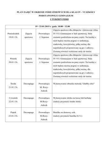 PLAN ZAJĘĆ W OKRESIE FERII ZIMOWYCH DLA KLAS IV - VI SZKOŁY PODSTAWOWEJ I GIMNAZJUM I TYDZIEŃ FERII 19 - 23.01.2015 r. godz. 10.00 - 12.00 Zajęcia sportowe dla chłopców i dziewcząt z klas Poniedziałek Zajęcia Prowadząca 19.01.15r. sportowe J. Szpoton IV-VI i Gimnazjum w hali sportowej. Hala zostanie podzielona na parę części. Na każdej z nich będzie można pograć w unihokeja, siatkówkę, koszykówkę, piłkę nożną, dla najmłodszych proponowane są gry i zabawy. Zostaną również rozłożone stoły do tenisa. Zajęcia sportowe dla chłopców i dziewcząt z klas Wtorek Zajęcia Prowadząca 20.01.15r. sportowe J. Szpoton IV-VI i Gimnazjum w hali sportowej. Hala zostanie podzielona na parę części. Na każdej z nich będzie można pograć w unihokeja, siatkówkę, koszykówkę, piłkę nożną, dla najmłodszych proponowane są gry i zabawy. Zostaną również rozłożone stoły do tenisa. Środa Decoupage 21.01.15r. Prowadząca Wykonywanie obrazka metodą "chabby chic" M. RozyAderek Czwartek Decoupage 22.01.15r. Prowadząca M.Rozy- Wykonywanie słoika na kawę lub herbatę (należy przynieść średni słoik) Aderek Piątek 23.01.15r. Decoupage Prowadząca M.RozyAderek Butelka na domowy sok. (należy przynieść butelkę 0,5 l.) II TYDZIEŃ FERII 26 - 29.01.2015 r. godz. 10.00 - 12.00 Zajęcia sportowe dla chłopców i dziewcząt z klas Zajęcia sportowe Prowadzący IV-VI i Gimnazjum w hali sportowej. Hala Ł. Zieliński zostanie podzielona na parę części. Na każdej z nich będzie można pograć w unihokeja, siatkówkę, koszykówkę, piłkę nożną, dla najmłodszych proponowane są gry i zabawy. Zostaną również rozłożone stoły do tenisa. Proponowane tematy zajęć mogą ulec modyfikacji lub zmianie z uwagi na liczbę oraz wiek dzieci uczestniczących w zajęciach. W trakcie ferii czynne będzie lodowisko, zapraszamy do zabaw na lodowej tafli.
