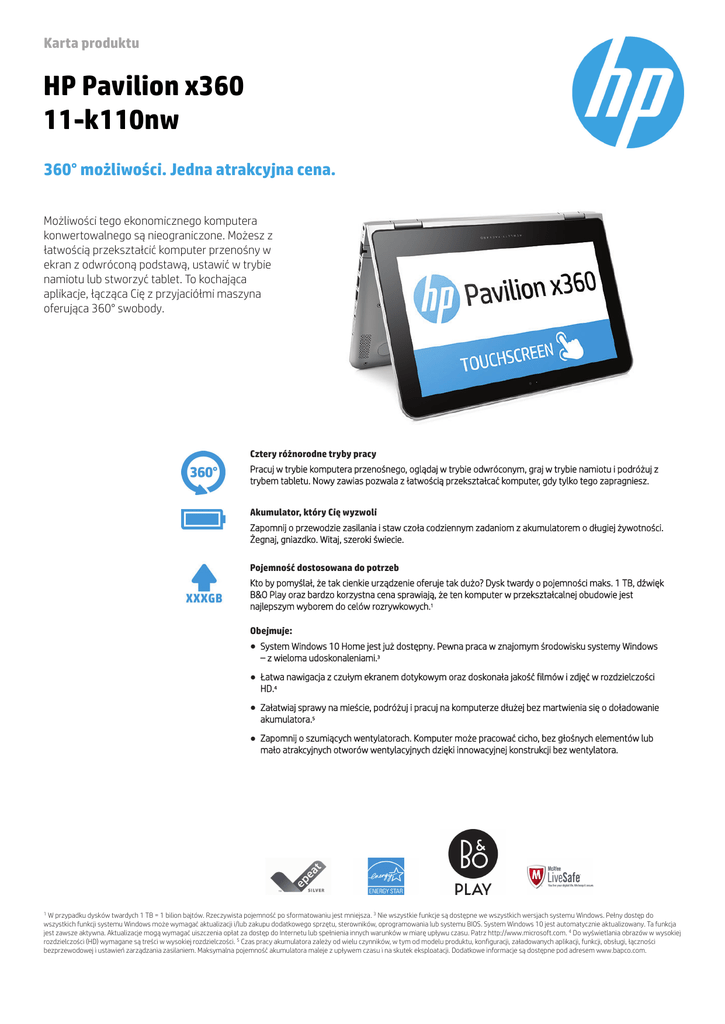 Karta produktu HP Pavilion x360 11-k110nw 360° możliwości. Jedna atrakcyjna cena. Możliwości tego ekonomicznego komputera konwertowalnego są nieograniczone. Możesz z łatwością przekształcić komputer przenośny w ekran z odwróconą podstawą, ustawić w trybie namiotu lub stworzyć tablet. To kochająca aplikacje, łącząca Cię z przyjaciółmi maszyna oferująca 360° swobody. Cztery różnorodne tryby pracy Pracuj w trybie komputera przenośnego, oglądaj w trybie odwróconym, graj w trybie namiotu i podróżuj z trybem tabletu. Nowy zawias pozwala z łatwością przekształcać komputer, gdy tylko tego zapragniesz. Akumulator, który Cię wyzwoli Zapomnij o przewodzie zasilania i staw czoła codziennym zadaniom z akumulatorem o długiej żywotności. Żegnaj, gniazdko. Witaj, szeroki świecie. Pojemność dostosowana do potrzeb Kto by pomyślał, że tak cienkie urządzenie oferuje tak dużo? Dysk twardy o pojemności maks. 1 TB, dźwięk B&O Play oraz bardzo korzystna cena sprawiają, że ten komputer w przekształcalnej obudowie jest najlepszym wyborem do celów rozrywkowych.1 Obejmuje: ● System Windows 10 Home jest już dostępny. Pewna praca w znajomym środowisku systemy Windows – z wieloma udoskonaleniami.3 ● Łatwa nawigacja z czułym ekranem dotykowym oraz doskonała jakość filmów i zdjęć w rozdzielczości HD.4 ● Załatwiaj sprawy na mieście, podróżuj i pracuj na komputerze dłużej bez martwienia się o doładowanie akumulatora.5 ● Zapomnij o szumiących wentylatorach. Komputer może pracować cicho, bez głośnych elementów lub mało atrakcyjnych otworów wentylacyjnych dzięki innowacyjnej konstrukcji bez wentylatora. W przypadku dysków twardych 1 TB = 1 bilion bajtów. Rzeczywista pojemność po sformatowaniu jest mniejsza. 3 Nie wszystkie funkcje są dostępne we wszystkich wersjach systemu Windows. Pełny dostęp do wszystkich funkcji systemu Windows może wymagać aktualizacji i/lub zakupu dodatkowego sprzętu, sterowników, oprogramowania lub systemu BIOS. System Windows 10 jest automatycznie aktualizowany. Ta funkcja jest zawsze aktywna. Aktualizacje mogą wymagać uiszczenia opłat za dostęp do Internetu lub spełnienia innych warunków w miarę upływu czasu. Patrz http://www.microsoft.com. 4 Do wyświetlania obrazów w wysokiej rozdzielczości (HD) wymagane są treści w wysokiej rozdzielczości. 5 Czas pracy akumulatora zależy od wielu czynników, w tym od modelu produktu, konfiguracji, załadowanych aplikacji, funkcji, obsługi, łączności bezprzewodowej i ustawień zarządzania zasilaniem. Maksymalna pojemność akumulatora maleje z upływem czasu i na skutek eksploatacji. Dodatkowe informacje są dostępne pod adresem www.bapco.com. 1 Karta produktu HP Pavilion x360 11-k110nw System operacyjny Windows 10 Home 64 Procesor Intel® Pentium® N3700 z kartą graficzną Intel® HD Graphics (1,6 GHz, do 2,4 GHz, 2 MB pamięci podręcznej, 4 rdzenie) Rodzaj procesora: Procesor Intel® Pentium® Pamięć 4 GB pamięci DDR3L SDRAM (1 x 4 GB) Archiwizacja danych Dysk SATA 500 GB 5400 obr./min SSHD; Flash cache: 8 GB; Pamięć podręczna flash ma na celu przyspieszenie reakcji systemu i nie jest wykorzystywana jako dodatkowa pamięć do przechowywania danych. Jest niedostępna i niemożliwa do wyjęcia przez użytkownika. Dropbox1 Kamera internetowa Kamera internetowa HP TrueVision HD (z przodu) ze zintegrowanym układem dwóch mikrofonów cyfrowych Czujniki Akcelerometr; Żyroskop; Kompas elektroniczny; Komunikacja Wbudowana karta sieciowa Ethernet 10/100 BASE-T; Karta sieciowa 802.11b/g/n (1 x 1) i moduł Bluetooth™ 4.0 Combo Łatwa obsługa Gniazdo blokady Kensington MicroSaver; Hasło do uruchomienia komputera; Obsługa urządzeń zabezpieczających innych producentów; Obsługa modułu Trusted Platform Module (TPM) Wyświetlacz Ekran dotykowy HD IPS o przekątnej 29,5 cm (11,6") z podświetleniem WLED (1366 x 768) Video Układ graficzny Intel HD Graphics Dźwięk B&O PLAY z 2 głośnikami Klawiatura Pełnowymiarowa klawiatura wyspowa; HP Imagepad z obsługą gestów wielopunktowych Porty 1 port HDMI; 1 gniazdo słuchawkowe/mikrofonowe combo; 1 port USB 2.0; 2 porty USB 3.0; 1 port RJ-45 1 wieloformatowy czytnik kart pamięci SD Cechy Konwertowalne Typ baterii 2-ogniwowy, 32 Wh, pryzmatyczny litowo-jonowy Zasilanie Zasilacz 45 W pr. zm. Kolor produktu Popielato-srebrny, pokrywa w kolorze naturalnego srebra; Konstrukcja z poziomo szczotkowanym wzorem Aplikacje HP HP 3D DriveGuard Oprogramowanie Evernote; Skype Serwis i wsparcie McAfee LiveSafe™2 Informacje dodatkowe P/N: P1S18EA #AKD Kod UPC/EAN: 889899055083 Waga 1.46 kg; Zapakowane: 2,19 kg; Waga zależy od konfiguracji Wymiary 30,6 x 20,8 x 2,25 cm; Zapakowane: 46 x 29,4 x 7,6 cm; Wymiary zależą od konfiguracji Spełniane normy w zakresie sprawności energetycznej Certyfikat ENERGY STAR®; certyfikat EPEAT® Silver Gwarancja 2-letnia gwarancja ograniczona na części i robociznę z usługą odbioru i dostawy do klienta Istnieje możliwość rozszerzenia zakresu gwarancji na okres do 3 lat; więcej informacji można uzyskać u dilera HP. 25 GB bezpłatnej pamięci masowej online przez 6 miesięcy od rejestracji. Szczegółowe informacje i warunki użytkowania, w tym zasady anulowania, są dostępne pod adresem www.dropbox.com. Wymaga połączenia z Internetem (brak w zestawie). 2 Wersja próbna oprogramowania McAfee LiveSafe z licencją na 30 dni (wymagane połączenie z Internetem. Aktualizacje przez pierwszych 30 dni w zestawie. Po tym okresie automatyczne aktualizacje wymagają subskrypcji.) 1 Kompatybilne akcesoria i usługi* * Nie wchodzi w skład zestawu. Głośnik bezprzewodow y HP Roar Mini, biały G1K47AA Futerał HP Spectrum 11,6 cala, turkusowy K0B44AA Mysz bezprzewodow a HP X3000, czerwona N4G65AA 3 lata z odbiorem i zwrotem UM945E © Copyright 2015. Hewlett-Packard Development Company, L.P. Informacje zawarte w niniejszym dokumencie mogą ulec zmianie bez powiad