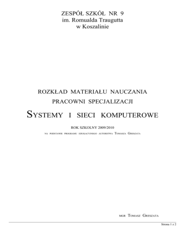 ZESPÓŁ SZKÓŁ NR 9 im. Romualda Traugutta w Koszalinie ROZKŁAD MATERIAŁU NAUCZANIA PRACOWNI SPECJALIZACJI SYSTEMY I SIECI KOMPUTEROWE ROK SZKOLNY 2009/2010 NA PODSTAWIE PROGRAMU EDUKACYJNEGO AUTORSTWA TOMASZA GRESZATA MGR TOMASZ GRESZATA Strona 1 z 2 Jednostka tematyczna składa się z 4 godzin lekcyjnych (45 minutowych). Dział Wprowadzenie I seria ćwiczeń Lp. 1. 2. 3. 4. 5. 6. 7. 8. II seria ćwiczeń 9. 10. 11. 12. 13. 14. 15. 16. III seria ćwiczeń 17. 18. 19. 20. 21. IV seria ćwiczeń Podsumowanie 22. 23. 24. 25. 26. 27. 28. 29. Liczba godzin Temat zajęć BHP pracowni specjalizacji. Przedmiotowy system oceniania. Konfiguracja komputera za pomocą programu Setup BIOS. Wymiana programu BIOS. Instalacja i konfiguracja procesora. Test parametrów pracy. Instalacja i konfiguracja pamięci operacyjnej. Test parametrów pracy. Instalacja dysków IDE, EIDE i SCSI. Test szybkości pracy. Korekcja błędów struktury logicznej i fizycznej dysku twardego. Montaż i konfiguracja stacji dysków elastycznych: 3,5”. Montaż i konfiguracja czytników CD-ROM. Test szybkości odczytu danych.. Instalacja i konfiguracja kart graficznych różnych magistral. Test parametrów pracy. Dwie karty graficzne w jednym komputerze. Podsumowanie I serii ćwiczeń. Test wiadomości. Wprowadzenie do II serii ćwiczeń. Instalacja i konfiguracja kart dźwiękowych. Testy parametrów pracy. Instalacja i konfiguracja kart wideo. Testowanie parametrów pracy. Przesyłanie obrazu przechwyconego z kamery do serwera ftp. Instalacja i konfiguracja modemów wolnostojącego i kart fax-modem. Łączenie komputerów za pomocą modemów. Instalacja i konfiguracja skanerów stacjonarnych i ręcznego. Testy parametrów pracy. Instalacja i konfiguracja drukarek igłowej, atramentowej i laserowej. Testy parametrów pracy. Udostępnianie drukarek w sieci. Instalacja systemu Linux. Konfiguracja i kompilacja jądra systemu. Podsumowanie II serii ćwiczeń. Test wiadomości. Wprowadzenie do III serii ćwiczeń. Podstawy administracji systemu Linux. Instalacja i konfiguracja serwera Dial-Up w systemie Linux. Instalacja i konfiguracja sieci w systemach Windows. Łączenie komputerów za pomocą różnych mediów. Instalacja klientów usług internetowych: FTP, TELNET, HTTP, SSH, NEWS, CHAT, SKYPE, GADUGADU i innych. Instalacja i konfiguracja sieci w systemie Linux. Projektowanie sieci lokalnej LAN. Łączenie sieci lokalnych za pomocą serwera Linux. Instalacja i konfiguracja serwerów HTTP i FTP w systemach Windows oraz Linux. Podsumowanie III serii ćwiczeń. Test wiadomości. Wprowadzenie do IV serii ćwiczeń. Bezpieczeństwo serwera sieciowego w systemach Windows i Linux. Instalacja i konfiguracja serwera pocztowego w systemie Linux. Instalacja i konfiguracja serwera plików w systemach Windows i Linux. Instalacja i konfiguracja serwera nazw DNS w systemie Linux. Instalacja i konfiguracja serwera proxy w systemach Windows i Linux. Instalacja i konfiguracja serwera i klienta systemu Novell NetWare. Podsumowanie IV serii ćwiczeń. Test wiadomości. Do dyspozycji nauczyciela. Łącznie godzin 2 4 4 4 4 4 4 2 4 4 4 4 4 4 2 4 4 4 4 4 2 4 4 4 4 4 4 2 4 106 Strona 2 z 2