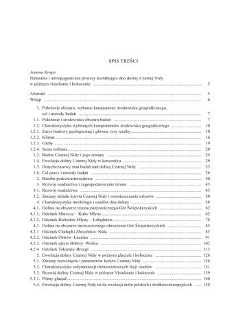 SPIS TREŚCI Joanna Krupa Naturalne i antropogeniczne procesy kształtujące dno doliny Czarnej Nidy w późnym vistulianie i hohocenie ................................................................................................. 5 Abstrakt ......................................................................................................................................... Wstęp ............................................................................................................................................ 5 6 1. Położenie obszaru, wybrane komponenty środowiska geograficznego, cel i metody badań ............................................................................................................. 1.1. Położenie i środowisko obszaru badań .............................................................................. 1.2. Charakterystyka wybranych komponentów środowiska geograficznego .......................... 1.2.1. Zarys budowy geologicznej i główne rysy rzeźby ............................................................... 1.2.2. Klimat .................................................................................................................................. 1.2.3. Gleby .................................................................................................................................... 1.2.4. Szata roślinna ....................................................................................................................... 1.3. Reżim Czarnej Nidy i jego zmiany .................................................................................... 1.4. Ewolucja doliny Czarnej Nidy w kenozoiku ..................................................................... 1.5. Dotychczasowy stan badań nad doliną Czarnej Nidy ........................................................ 1.6. Cel pracy i metody badań .................................................................................................. 2. Rzeźba podczwartorzędowa ............................................................................................... 3. Rozwój osadnictwa i zagospodarowanie terenu ................................................................ 3.1. Rozwój osadnictwa ............................................................................................................ 3.2. Zmiany układu koryta Czarnej Nidy i rozmieszczenie młynów ........................................ 4. Charakterystyka morfologii i osadów dna doliny .............................................................. 4.1. Dolina na obszarze trzonu paleozoicznego Gór Świętokrzyskich ..................................... 4.1.1. Odcinek Marzysz – Kuby Młyny ......................................................................................... 4.1.2. Odcinek Bieleckie Młyny – Łabędziów............................................................................... 4.2. Dolina na obszarze mezozoicznego obrzeżenia Gór Świętokrzyskich .............................. 4.2.1 Odcinek Chałupki Zbrzańskie–Nida .................................................................................. 4.2.2. Odcinek Ostrów–Łaziska ................................................................................................... 4.2.3. Odcinek ujście Bobrzy–Wolica .......................................................................................... 4.2.4 Odcinek Tokarnia–Brzegi .................................................................................................. 5. Ewolucja doliny Czarnej Nidy w późnym glacjale i holocenie ......................................... 5.1. Zmiany rozwinięcia i parametrów koryta Czarnej Nidy .................................................... 5.2. Charakterystyka sedymentacji różnowiekowych facji osadów ......................................... 5.3. Rozwój doliny Czarnej Nidy w późnym Vistulianie i holocenie ....................................... 5.3.1. Późny glacjał ........................................................................................................................ 5.4. Ewolucja doliny Czarnej Nidy na tle ewolucji dolin polskich i środkowoeuropejskich ...... 7 7 10 10 16 19 20 24 29 33 36 40 45 45 50 58 62 62 78 85 85 91 102 113 126 126 131 139 140 148 Wnioski ......................................................................................................................................... 153 Summary ....................................................................................................................................... 155 Literatura ....................................................................................................................................... 163 Natalia Nawrocka Analiza dendrogeomorfologiczna drzew różnych gatunków z obszaru osuwiska „L. Sawickiego” w Szymbarku, Beskid Niski, Karpaty Zewnętrzne ........................................... 175 Abstrakt ......................................................................................................................................... 175 Wprowadzenie .............................................................................................................................. 175 1. Charakterystyka obszaru badań ............................................................................................. 2. Materiał badawczy i metodyka ................................................................................................ 3. Wyniki badań ......................................................................................................................... 4. Dyskusja i podsumowanie ..................................................................................................... 176 177 179 182 Summary ....................................................................................................................................... 184 Literatur
