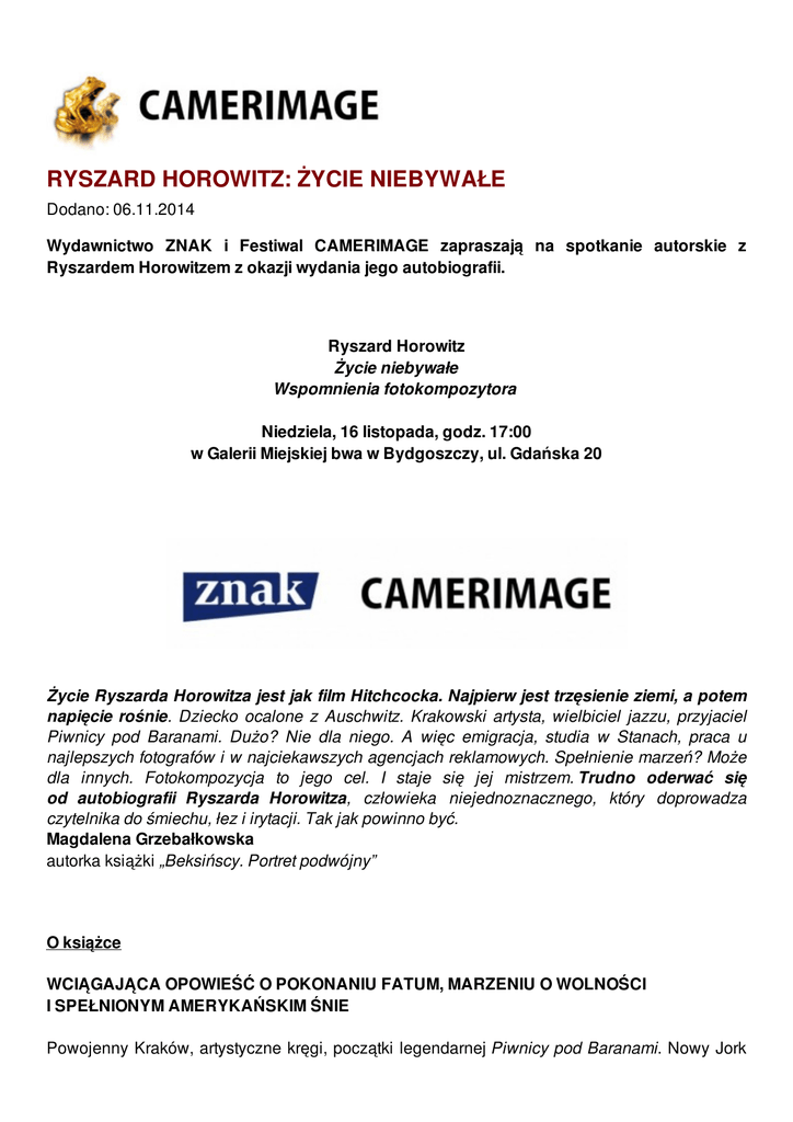 RYSZARD HOROWITZ: ŻYCIE NIEBYWAŁE Dodano: 06.11.2014 Wydawnictwo ZNAK i Festiwal CAMERIMAGE zapraszają na spotkanie autorskie z Ryszardem Horowitzem z okazji wydania jego autobiografii. Ryszard Horowitz Życie niebywałe Wspomnienia fotokompozytora Niedziela, 16 listopada, godz. 17:00 w Galerii Miejskiej bwa w Bydgoszczy, ul. Gdańska 20 Życie Ryszarda Horowitza jest jak film Hitchcocka. Najpierw jest trzęsienie ziemi, a potem napięcie rośnie. Dziecko ocalone z Auschwitz. Krakowski artysta, wielbiciel jazzu, przyjaciel Piwnicy pod Baranami. Dużo? Nie dla niego. A więc emigracja, studia w Stanach, praca u najlepszych fotografów i w najciekawszych agencjach reklamowych. Spełnienie marzeń? Może dla innych. Fotokompozycja to jego cel. I staje się jej mistrzem. Trudno oderwać się od autobiografii Ryszarda Horowitza, człowieka niejednoznacznego, który doprowadza czytelnika do śmiechu, łez i irytacji. Tak jak powinno być. Magdalena Grzebałkowska autorka książki „Beksińscy. Portret podwójny” O książce WCIĄGAJĄCA OPOWIEŚĆ O POKONANIU FATUM, MARZENIU O WOLNOŚCI I SPEŁNIONYM AMERYKAŃSKIM ŚNIE Powojenny Kraków, artystyczne kręgi, początki legendarnej Piwnicy pod Baranami. Nowy Jork niczym z serialu Mad Men – miasto jazzu, wielkich marzeń i nieograniczonych możliwości. Wszystko to poprzedzone przejściem przez piekło getta i obozów koncentracyjnych. W swojej autobiografii Ryszard Horowitz, najsłynniejszy polski fotograf i jeden z pionierów współczesnej reklamy, opowiada o przypadku i przeznaczeniu, o trudnej drodze do sukcesu i sile wielkiej miłości. Odkrywa przed nami kulisy bezwzględnego świata show-businessu, mówi o wieloletniej przyjaźni z Romanem Polańskim, o spotkaniach z Mickiem Jaggerem, Andym Warholem, Davidem Brubeckiem czy Richardem Avedonem. Nie tylko kreśli barwny portret epoki, odsłania też tajemnice swojego warsztatu fotograficznego. "ŻYCIE NIEBYWAŁE - Wspomnienia fotokompozytora" ZAWIERA ARCHIWUM RODZINNEGO I ZNAKOMITE PRACE AUTORA. FOTOGRAFIE Z O autorze Ryszard Horowitz urodził się w Krakowie w 1939 roku, podczas wojny trafił do getta i obozów, zawdzięcza ocalenie Oskarowi Schindlerowi i jest jednym z najmłodszych byłych więźniów nazistowskiego obozu zagłady w Oświęcimiu. Studiował na krakowskiej ASP. W 1959 roku wyjechał do USA, gdzie mieszka do dziś. Ukończył Pratt Institute. Uznawany jest za prekursora komputerowego przetwarzania fotografii. Od 1967 roku prowadzi własne studio fotograficzne. Jego prace wystawiane są na całym świecie.
