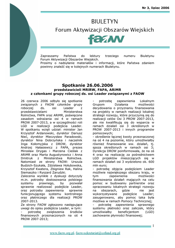 Nr 3, lipiec 2006 Zapraszamy Państwa do lektury trzeciego numeru Biuletynu Forum Aktywizacji Obszarów Wiejskich. Prosimy o nadsyłanie materiałów i informacji, które Państwa zdaniem powinny znaleźć się w kolejnych numerach Biuletynu. Spotkanie 26.06.2006 przedstawicieli MRiRW, FAPA, ARiMR z członkami grupy roboczej ds. osi Leader związanymi z FAOW 26 czerwca 2006 odbyło się spotkanie związanych z FAOW członków grupy roboczej ds. osi Leader z przedstawicielami Ministerstwa Rolnictwa, FAPA oraz ARiMR, poświęcone zasadom wdrażania osi 4 w ramach PROW 2007-2013, a w szczególności roli LGD w realizacji podejścia Leader. W spotkaniu wzięli udział: minister Jan Krzysztof Ardanowski, dyrektor Dariusz Nieć, dyrektor Mieczysław Paradowski, dyrektor Nina Dobrzyńska i naczelnik Inga Kołomyjska z DROW, dyrektor Andrzej Hałasiewicz z FAPA, prezes Mirosław Drygas i Marzena Cieślak z ARiMR oraz Marta Augustynowicz i Anna Dmitruk z Ministerstwa Rolnictwa. Natomiast ze strony FAOW: Urszula Budzich-Szukała, Zdzisława Hołubowska, Krzysztof Kwatera, Zbigniew Rak, Halina Siemaszko i Ryszard Zarudzki. Zalecenia wynikłe z dyskusji dotyczyły m.in. potrzeby dostosowania polskiego systemu prawnego, by pozwalał sprawnie realizować podejście Leader, oraz potrzeby zapewnienia sprawnie funkcjonującego systemu kontrolnego oraz płatniczego dla realizacji PROW 2007-2013. Ze strony FAOW zgłoszono następujące uwagi do opisu podejścia Leader, w tym: potrzebę zwiększenia środków finansowych przeznaczonych na oś 4 PROW 2007-2013; potrzebę zapewnienia Lokalnym Grupom Działania możliwości decydowania o przyznaniu finansowania na projekty w ramach realizacji lokalnej strategii rozwoju, które przyczynią się do realizacji celów Osi 3 PROW 2007-2013, ale nie kwalifikują się do wsparcia w ramach działań osi 3 określonych w PROW 2007-2013 i innych programów pomocowych; - określenie łącznej kwoty przeznaczonej na oś 4 na poziomie, który umożliwiałby również finansowanie ww. działań, tj. spoza określonych w ramach osi 3; Dyrekcja DROW poinformowała, że na oś 4 oraz na realizację za pośrednictwem LGD projektów mieszczących się w ramach działań osi 3 wydzielono ok. 600 mln euro; - potrzebę objęcia podejściem Leader możliwie największego obszaru kraju, w tym zapewnienia możliwości finansowania działań mających na celu pomoc w budowaniu partnerstw oraz opracowaniu lokalnych strategii rozwoju na obszarach, gdzie nie jest wykorzystywane podejście Leader; zasugerowano, aby pomoc taka była możliwa w ramach Pomocy Technicznej; - potrzebę zapewnienia sprawnego systemu płatności oraz zaliczek, który umożliwiałby beneficjentom (LGD) zachowanie płynności finansowej; 1 - umożliwienie LGD korzystania również z innych środków unijnych; zasugerowano, aby MRiRW podjęło kroki mające na celu wpisanie LGD jako beneficjentów w innych programach. Obecni na spotkaniu przedstawiciele FAOW zastali poproszeni o przesłanie propozycji zmian do opisu osi Leader do 28.06.2006 r., co uczynili, w piśmie przesłanym do Ministra Ardanowskiego z 27.06.2006. (na podstawie notatki ze spotkania przygotowanej przez Annę Dmitruk i Martę Augustynowicz z DROW, Ministerstwo Rolnictwa i Rozwoju Wsi) „Między nami PREPAREowcami” - relacja z warsztatów wędrownych i spotkania PREPARE 2006 w Velehradzie W dniach 18-23 czerwca 2006 roku odbyło się spotkanie PREPARE 2006, w którym udział wzięło 74 uczestników z 23 krajów, w tym pięcioosobowa grupa z Polski (przedstawiciele: FAOW, Ministerstwa Rolnictwa i Rozwoju Wsi, Lokalnych Grup Działania). Działania w różnych regionach kraju. Obecnie w Czechach funkcjonuje około 170 partnerstw, obejmujących swoim zasięgiem około 75% powierzchni tego kraju. Tak dużą liczbę LGD Czechy zawdzięczają realizacji kolejno 2 programów: Leader ČR (Leader Czech Republic) oraz Leader+. Od lewej: Marcin Skonieczka, Ula Budzich-Szukała, Inga Kawałek, Krzysztof Grzesiak, Ania Dmitruk. Gospodarzem spotkania było Czeskie Krajowe Obserwatorium dla Obszarów Wiejskich, Czeska Sieć Lokalnych Grup Działania i morawska LGD Buchlov. Tematem tegorocznego spotkania była “Ewolucja i wzmocnienie Lokalnych Grup Działania oraz ich rola w programach rozwoju obszarów wiejskich”. Imprezę rozpoczęło spotkanie w Senacie w przepięknej Pradze, z której uczestnicy, podzieleni na 5 grup, wyruszyli na dwudniowe warsztaty wędrowne. Były one świetną okazją poznania czeskich Lokalnych Grup Program warsztatów wędrownych, choć bardzo intensywny, zapewniał spotkania z partnerstwami na różnych etapach rozwoju – od początkujących do bardziej zaawansowanych. Każda z grup warsztatowych odwiedziła od 3 do 5 LGD, a więc łącznie w organizację warsztatów zaangażowanych było ich aż 18. Każdy grupa warsztatowa zobowiązana była do przygotowania raportu oraz do jego prezentacji podczas głównego spotkania w Velehradzie na Morawach. Dodatkowo, przy ustalaniu składu zespołów organizatorzy starali się zapewnić różnorodność narodową, dlatego też w mojej grupie były osoby z 2 Bośni i Hercegowiny (Slobodan Tadic), Bułgarii (Silviya Hadzhieva, Daniela Todorova), Chorwacji (Tatjana Ordanić), Estonii (Andrus Rekor), Finlandii (Hannu Vaahtoranta), Litwy (Valdis Kunin), Serbii (Igor Stajic), Słowacji (Jela Tvrdonova) oraz Słowenii (Petra Karo). Naszą grupą opiekował się Oldřich Čepelka z Czeskiego Narodowego Obserwatorium dla Obszarów Wiejskich. Podczas wędrówki odwiedziliśmy LGD „Serviso”, w którym najważniejszą rolę pełni samorząd lokalny oraz sektor biznesu. Do LGD należy blisko 30 jednostek samorządu terytorialnego najniższego szczebla, jednak należy zaznaczyć, iż w Czechach każda wieś stanowi odrębną jednostkę. Realizowane przez tę grupę przedsięwzięcia obejmują głównie inwestycje w rozwój działalności gospodarczej oraz w ochronę środowiska. Jednym z przykła