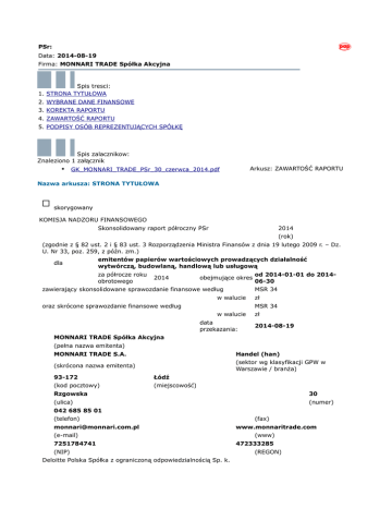 PSr: Data: 2014-08-19 Firma: MONNARI TRADE Spółka Akcyjna Spis tresci: 1. STRONA TYTUŁOWA 2. WYBRANE DANE FINANSOWE 3. KOREKTA RAPORTU 4. ZAWARTOŚĆ RAPORTU 5. PODPISY OSÓB REPREZENTUJĄCYCH SPÓŁKĘ Spis zalacznikow: Znaleziono 1 załącznik • Arkusz: ZAWARTOŚĆ RAPORTU GK_MONNARI_TRADE_PSr_30_czerwca_2014.pdf Nazwa arkusza: STRONA TYTUŁOWA skorygowany KOMISJA NADZORU FINANSOWEGO Skonsolidowany raport półroczny PSr 2014 (rok) (zgodnie z § 82 ust. 2 i § 83 ust. 3 Rozporządzenia Ministra Finansów z dnia 19 lutego 2009 r. – Dz. U. Nr 33, poz. 259, z późn. zm.) dla emitentów papierów wartościowych prowadzących działalność wytwórczą, budowlaną, handlową lub usługową za półrocze roku obrotowego 2014 obejmujące okres zawierający skonsolidowane sprawozdanie finansowe według od 2014-01-01 do 201406-30 MSR 34 w walucie oraz skrócone sprawozdanie finansowe według zł MSR 34 w walucie data przekazania: zł 2014-08-19 MONNARI TRADE Spółka Akcyjna (pełna nazwa emitenta) MONNARI TRADE S.A. Handel (han) (skrócona nazwa emitenta) (sektor wg klasyfikacji GPW w Warszawie / branża) 93-172 Łódź (kod pocztowy) (miejscowość) Rzgowska 30 (ulica) (numer) 042 685 85 01 (telefon) [email protected] (e-mail) 7251784741 (NIP) Deloitte Polska Spółka z ograniczoną odpowiedzialnością Sp. k. (fax) www.monnaritrade.com (www) 472333285 (REGON) (podmiot uprawniony do badania) Nazwa arkusza: WYBRANE DANE FINANSOWE w tys. WYBRANE DANE FINANSOWE półrocze / 2014 I. Przychody ze sprzedaży w tys. EUR półrocze /2013 półrocze / 2014 półrocze /2013 76 652 62 762 18 345 14 894 9 717 3 557 2 326 844 III. Zysk (strata) brutto 10 346 5 575 2 476 1 323 IV. Zysk (strata) netto 12 506 5 548 2 993 1 317 V. Przepływ środków pieniężnych netto z działalności operacyjnej -5 766 1 331 -1 380 316 -16 158 6 060 -3 867 1 438 0 -2 504 0 -594 II. Zysk (strata) z działalności operacyjnej VI. Przepływ środków pieniężnych netto z działalności inwestycyjnej VII. Przepływ środków pieniężnych netto z działalności finansowej VIII. Przepływy pieniężne netto -21 923 4 888 -5 247 1 160 IX. Zysk (strata) na jedną akcję (w zł/EUR) 0,41 0,18 0,10 0,04 X. Rozwodniony zysk (strata) na jedną akcję (w zł/EUR) 0,41 0,18 0,10 0,04 stan na 2014- stan na 2013- stan na 2014- stan na 201306-30 12-31 06-30 12-31 Aktywa razem 115 977 103 664 27 873 23 945 Zobowiązania długoterminowe 585 50 141 12 Zobowiązania krótkoterminowe 13 784 14 512 3 313 3 352 Kapitał własny 101 607 89 101 24 419 20 581 Liczba akcji 30 563 089 30 563 089 30 563 089 30 563 089 3,32 2,92 0,80 0,67 - - - - Zadeklarowana lub wypłacona dywidenda na jedną akcję (w zł/EUR) W przypadku prezentowania wybranych danych finansowych z półrocznego skróconego sprawozdania finansowego dane te należy odpowiednio opisać. Wybrane dane finansowe ze skonsolidowanego bilansu (skonsolidowanego sprawozdania z sytuacji finansowej) lub odpowiednio z bilansu (sprawozdania z sytuacji finansowej) prezentuje się na koniec półrocza bieżącego roku obrotowego i na koniec poprzedniego roku obrotowego, co należy odpowiednio opisać. Raport powinien zostać przekazany Komisji Nadzoru Finansowego, spółce prowadzącej rynek regulowany oraz do publicznej wiadomości za pośrednictwem agencji informacyjnej zgodnie z przepisami prawa. Nazwa arkusza: KOREKTA RAPORTU INFORMACJA O KOREKCIE RAPORTU Skorygowany raportem bieżącym nr z dnia Plik Nazwa arkusza: ZAWARTOŚĆ RAPORTU ZAWARTOŚĆ RAPORTU o treści: Opis "Rozszerzony" skonsolidowany raport półroczny powinien zawierać składniki i informacje zgodnie z przepisami Rozporządzenia Ministra Finansów z dnia 19 lutego 2009 r. – (Dz. U. Nr 33, poz. 259, z późn. zm.) lub odpowiednio zgodnie z art. 56 ust. 1 pkt 2 lit. b i art. 61 ustawy z dnia 29 lipca 2005 r. – (t. jedn. Dz. U. z 2009, Nr 185, poz. 1439, z późn. zm.) lub odpowiednio zgodnie z art. 56 ust. 1 pkt 2 i ust. 6 tej ustawy Plik Opis GK_MONNARI_TRADE_PSr_30_czerwca_2014. Raport GK MONNARI TRADE S.A. PSr na dzień 30 pdf czerwca 2014 Nazwa arkusza: PODPISY OSÓB REPREZENTUJĄCYCH SPÓŁKĘ PODPISY OSÓB REPREZENTUJĄCYCH SPÓŁKĘ Data Imię i Nazwisko Stanowisko/Funkcja Podpis 2014-08-19 Mirosław Misztal Prezes Zarządu Identyfikator raportu 9zxzrwg0x1 Nazwa raportu PSr Symbol raportu PSr Nazwa emitenta MONNARI TRADE Spółka Akcyjna Symbol Emitenta MONNARI TRADE S.A. Tytul Sektor Handel (han) Kod 93-172 Miasto Łódź Ulica Rzgowska Nr 30 Tel. 042 685 85 01 Fax e-mail [email protected] NIP 7251784741 REGON 472333285 Data sporzadzenia 2014-08-19 Rok biezacy Numer adres www www.monnaritrade.com