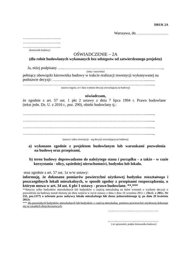 DRUK 2A Warszawa, dn. …………………… ……………….……….. ………………….…….. ………………………... (kierownik budowy) OŚWIADCZENIE – 2A (dla robót budowlanych wykonanych bez odstępstw od zatwierdzonego projektu) Ja, niżej podpisany …...………………………………………………………………….., (imię i nazwisko) pełniący obowiązki kierownika budowy w trakcie realizacji inwestycji wykonywanej na podstawie decyzji: ……………………………………………………………….......... ……………………………………………………………………………………........, (nazwa organu, nr i data wydania decyzji zezwalającej na budowę) oświadczam, że zgodnie z art. 57 ust. 1 pkt 2 ustawy z dnia 7 lipca 1994 r. Prawo budowlane (tekst jedn. Dz. U. z 2016 r., poz. 290), obiekt budowlany tj.: ……………………………………………………………………………………........, ……………………………………………………………………………………........, ……………………………………………………………………………………........, ……………………………………………………………………………………........, (nazwa i adres inwestycji - wg decyzji zezwalającej na budowę) a) wykonano zgodnie z projektem budowlanym lub warunkami pozwolenia na budowę oraz przepisami, b) teren budowy doprowadzono do należytego stanu i porządku - a także - w razie korzystania - ulicy, sąsiedniej nieruchomości, budynku lub lokalu. oraz zgodnie z art. 57 ust. 1a w/w ustawy: informuję, że dokonano pomiarów powierzchni użytkowej budynku mieszkalnego i poszczególnych lokali mieszkalnych, w sposób zgodny z przepisami rozporządzenia, o którym mowa w art. 34 ust. 6 pkt 1 ustawy - prawo budowlane. **,*** **dotyczy tylko budynków mieszkalnych lub budynków z częścią mieszkalną na które wniosek o wydanie decyzji o pozwoleniu na budowę został złożony po dniu wejścia w życie ustawy z dnia z dnia 16 września 2011 r. (Dz.U. z 201r., Nr 232, poz.1377) o ochronie praw nabywcy lokalu mieszkalnego lub domu jednorodzinnego tj. po dniu 29 kwietnia 2012r. *** dla pozostałych budynków mieszkalnych lub budynków z częścią mieszkalną pomiaru powierzchni użytkowej dokonuje się na zasadach dotychczasowych. …..…………...………………… ……..…………...……………… ( nr uprawnień, podpis kierownika budowy) DRUK 2B Warszawa, dn. …………………… …….………………….. ………….…………….. …………….………….. (kierownik budowy) OŚWIADCZENIE – 2B (dla robót budowlanych wykonanych z odstępstwami od zatwierdzonego projektu) Ja, niżej podpisany …...……………………………………………………………….......................….., (imię i nazwisko) pełniący obowiązki kierownika budowy w trakcie realizacji inwestycji wykonywanej na podstawie decyzji: ……………………………………………………………………………….... ……………………………………………………………………………………........, (nazwa organu, nr i data wydania decyzji zezwalającej na budowę) oświadczam, że zgodnie z art. 57 ust. 1 pkt. 2 ustawy z dnia 7 lipca 1994 r. Prawo budowlane (tekst jedn. Dz. U. z 2016 r., poz. 290), obiekt budowlany tj.: ……………………………………………………………………………………........, ……………………………………………………………………………………........, ……………………………………………………………………………………........, (nazwa i adres inwestycji - wg decyzji zezwalającej na budowę) a) wykonano zgodnie warunkami pozwolenia na budowę oraz przepisami, b) w czasie wykonywania robót budowlanych wprowadzono zmiany nie odstępujące w sposób istotny od zatwierdzonego projektu, warunków pozwolenia na budowę, polegające na: ……………………………………………………………………………………........, ……………………………………………………………………………………........, ……………………………………………………………………………………........, wg załączonej dokumentacji, c) teren budowy doprowadzono do należytego stanu i porządku - a także - w razie korzystania - ulicy, sąsiedniej nieruchomości, budynku lub lokalu. oraz zgodnie z art. 57 ust. 1a w/w ustawy: informuję, że dokonano pomiarów powierzchni użytkowej budynku mieszkalnego i poszczególnych lokali mieszkalnych, w sposób zgodny z przepisami rozporządzenia, o którym mowa w art. 34 ust. 6 pkt 1 ustawy - prawo budowlane. *,** *dotyczy tylko budynków mieszkalnych lub budynków z częścią mieszkalną na które wniosek o wydanie decyzji o pozwoleniu na budowę został złożony po dniu wejścia w życie ustawy z dnia z dnia 16 września 2011 r. (Dz.U. z 201r., Nr 232, poz.1377) o ochronie praw nabywcy lokalu mieszkalnego lub domu jednorodzinnego tj. po dniu 29 kwietnia 2012r. ** dla pozostałych budynków mieszkalnych lub budynków z częścią mieszkalną pomiaru powierzchni użytkowej dokonuje się na zasadach dotychczasowych. …............…………………………… (nr uprawnień, podpis kierownika budowy) ……………………………….................... (nr uprawnień, podpis projektanta) potwierdzam: ……………………………….................... (nr uprawnień, podpis inspektora nadzoru)