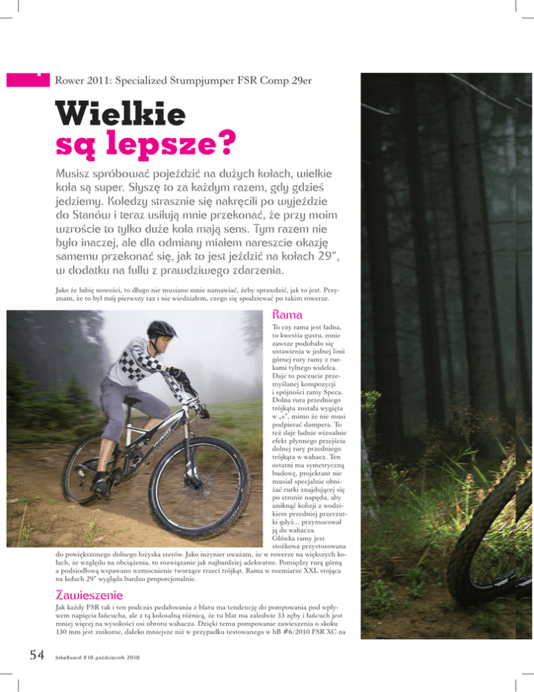 Rower 2011: Specialized Stumpjumper FSR Comp 29er Wielkie są lepsze? Musisz spróbować pojeździć na dużych kołach, wielkie koła są super. Słyszę to za każdym razem, gdy gdzieś jedziemy. Koledzy strasznie się nakręcili po wyjeździe do Stanów i teraz usiłują mnie przekonać, że przy moim wzroście to tylko duże koła mają sens. Tym razem nie było inaczej, ale dla odmiany miałem nareszcie okazję samemu przekonać się, jak to jest jeździć na kołach 29”, w dodatku na fullu z prawdziwego zdarzenia. Jako że lubię nowości, to długo nie musiano mnie namawiać, żeby sprawdzić, jak to jest. Przyznam, że to był mój pierwszy raz i nie wiedziałem, czego się spodziewać po takim rowerze. Rama To czy rama jest ładna, to kwestia gustu, mnie zawsze podobało się ustawienia w jednej linii górnej rury ramy z rurkami tylnego widelca. Daje to poczucie przemyślanej kompozycji i spójności ramy Speca. Dolna rura przedniego trójkąta została wygięta w „s”, mimo że nie musi podpierać dampera. To też daje ładnie wizualnie efekt płynnego przejścia dolnej rury przedniego trójkąta w wahacz. Ten ostatni ma symetryczną budowę, projektant nie musiał specjalnie obniżać rurki znajdującej się po stronie napędu, aby uniknąć kolizji z wodzikiem przedniej przerzutki gdyż... przymocował ją do wahacza. Główka ramy jest stożkowa przystosowana do powiększonego dolnego łożyska sterów. Jako inżynier uważam, że w rowerze na większych kołach, ze względu na obciążenia, to rozwiązanie jak najbardziej adekwatne. Pomiędzy rurą górną a podsiodłową wspawano wzmocnienie tworzące trzeci trójkąt. Rama w rozmiarze XXL stojąca na kołach 29” wygląda bardzo proporcjonalnie. Zawieszenie Jak każdy FSR tak i ten podczas pedałowania z blatu ma tendencję do pompowania pod wpływem napięcia łańcucha, ale z tą kolosalną różnicą, że tu blat ma zaledwie 33 zęby i łańcuch jest mniej więcej na wysokości osi obrotu wahacza. Dzięki temu pompowanie zawieszenia o skoku 130 mm jest znikome, daleko mniejsze niż w przypadku testowanego w bB #6/2010 FSR XC na 54 bi keB oar d #10 p aździer nik 2010 bi ke Boa r d #10 p a źd zi er n i k 2 010 55 Główna oś obrotu wahacza jest niemal na tej samej wysokości co łańcuch wrzucony na blat, dzięki temu zjawisko kompresji dampera przy mocnych depnięciach jest mniejsze niż w przypadku FSRa z trójrzędową korbą „małych” kółkach. Da się jednak odczuć pewną miękkość napędu podczas pedałowania na gładkim podjeździe. Po włączeniu blokady lub chociaż utwardzeniu platformy w damperze FOX Triad różnica w przekazywaniu napędu jest wyraźna, cała para idzie w koło, a nie w gwizdek. O zawieszeniu nie ma się co za bardzo rozpisywać, bo większe koła nie wpływają praktycznie na jego działanie. FSR w każdym swoim wydaniu przyzwyczaił nas do dużej czułości na małych nierównościach, a nawet jeśli w tym przypadku jest mniej czuły, niż np. FSR XC, to i tak nie da się tego poznać, bo duże koła łatwiej najeżdżają na przeszkody, a przez to amortyzatory mają mniej pracy. Z przodu zamontowano wyrośniętą Rebę również o skoku 130 mm, wyposażoną w blokadę skoku z regulowanym zaworem bezpieczeństwa Floodgate. Jego zadaniem jest odblokowanie skoku przy większym uderzeniu, a tę wielkość można regulować wspomnianym zaworem. Czułość pracy i płynność jest na wysokim poziomie. Mimo więk- szej wysokości, sztywność też jest dobra. Nic dziwnego, koło jest mocowane ośką Maxle 20 mm. Prowadzenie Ze względu na większe koło, tylny widelec jest dłuższy o 29 mm w stosunku do modelu 26”. Ta większa długość została skompensowana przez bardziej stromy kąt główki i inny offset widelca, dzięki czemu baza dłuższa jest już tylko o 12 mm. Natomiast długość górnej rury jest praktycznie taka sama w obu modelach (26 i 29”). Siedząc za kierownicą nie odczuwa się różnicy, tylko opona jakby bardziej do przodu wystaje. Dopiero podczas jazdy wychodzą pewne odmienności wynikające z różnicy w wielkości kół. Podjeżdżanie tym rowerem, ważącym 12,8 kg (rozmiar L), zdaje się być wygodniejsze. Nie ma konieczności specjalnego dociążania przedniego koła. Zapewne to zaleta dłuższego tylnego widelca, a co za tym idzie - środka ciężkości przesuniętego bardziej do przodu (kąt rury podsiodłowej jest taki sam, jak w modelu na kołach 26”). Również zjeżdżanie stromizn jest wygodniejsze, nie trzeba wypinać się do tyłu. Generalnie rower wymaga mniej gimnastyki. 617 mm 74,5° SPECIALIZED STUMPJUMPER FSR COMP 29ER Cena: 10 399 zł Współczynnik bB: 100 g za 81 zł* 69,5° 449 mm 338 mm 1156 mm Rama: aluminium M5 Rozmiary: M, L, XL, XXL Geometria: rozmiar testowany: L Masa kompletnego roweru: 12 800 g Masa przedniego koła: 1980 g Masa tylnego koła: 2620 g 56 bi keB oar d #10 p aździer nik 2010 Skok amortyzacji: przód - 130 mm tył - 130 mm Przedni widelec: Rock Shox Reba RLT 29 20 mm Maxle SL Damper: Fox Triad II Piasty: Specialized Hi Lo 20mm axle / Specialized Hi Lo Obręcze: DT Swiss 520 SL Opony: S-Works Purgatory 29x2.2 / Specialized The Captain 29.2.2 Korby: SRAM S-1250 33/22T (175 mm) Kaseta: Shimano CS-HG81 (11-36) 10-rz. Łańcuch: KMC X10 Przerzutka przód: Shimano SLX FD-M660-E Przerzutka tył: SRAM X.9 Manetki: SRAM X.7 Klamki: Avid Elixir R SL Hamulce: Avid Elixir R SL 203/185 mm Kierownica: Specialized XC Flat (680 mm) Wspornik kierownicy: Specialized XC Łożyska sterów: 1 i 1/8” - 1.5” Wspornik siodełka: aluminiowy 2014 (400 mm) Siodełko: Specialized BG Henge Comp Pedały: - Model na dużych kołach zmusza jednak do przyzwyczajenia się do innego sposobu skręcania, ale nie można mu zarzucić, że jest mułowaty. Stumpjumpera testowaliśmy w bikeparku w Lipnie (po trasach w górę i w dół), więc nie były to proste ścieżki, tylko ciągły slalom, progi, mostki i jazda po bandzie po nieco rozmo