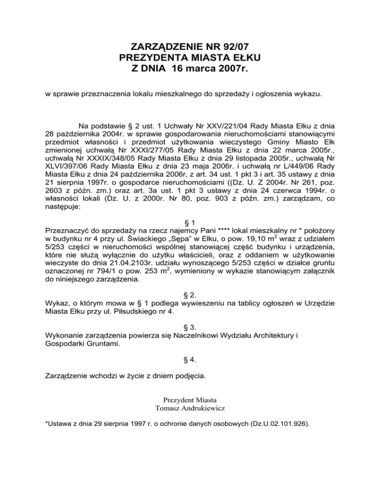 ZARZĄDZENIE NR 92/07 PREZYDENTA MIASTA EŁKU Z DNIA 16 marca 2007r. w sprawie przeznaczenia lokalu mieszkalnego do sprzedaży i ogłoszenia wykazu. Na podstawie § 2 ust. 1 Uchwały Nr XXV/221/04 Rady Miasta Ełku z dnia 28 października 2004r. w sprawie gospodarowania nieruchomościami stanowiącymi przedmiot własności i przedmiot użytkowania wieczystego Gminy Miasto Ełk zmienionej uchwałą Nr XXXI/277/05 Rady Miasta Ełku z dnia 22 marca 2005r., uchwałą Nr XXXIX/348/05 Rady Miasta Ełku z dnia 29 listopada 2005r., uchwałą Nr XLVI/397/06 Rady Miasta Ełku z dnia 23 maja 2006r. i uchwałą nr L/449/06 Rady Miasta Ełku z dnia 24 października 2006r, z art. 34 ust. 1 pkt 3 i art. 35 ustawy z dnia 21 sierpnia 1997r. o gospodarce nieruchomościami ((Dz. U. Z 2004r. Nr 261, poz. 2603 z późn. zm.) oraz art. 3a ust. 1 pkt 3 ustawy z dnia 24 czerwca 1994r. o własności lokali (Dz. U. z 2000r. Nr 80, poz. 903 z późn. zm.) zarządzam, co następuje: §1 Przeznaczyć do sprzedaży na rzecz najemcy Pani **** lokal mieszkalny nr * położony w budynku nr 4 przy ul. Świackiego „Sępa” w Ełku, o pow. 19,10 m2 wraz z udziałem 5/253 części w nieruchomości wspólnej stanowiącej część budynku i urządzenia, które nie służą wyłącznie do użytku właścicieli, oraz z oddaniem w użytkowanie wieczyste do dnia 21.04.2103r. udziału wynoszącego 5/253 części w działce gruntu oznaczonej nr 794/1 o pow. 253 m2, wymieniony w wykazie stanowiącym załącznik do niniejszego zarządzenia. § 2. Wykaz, o którym mowa w § 1 podlega wywieszeniu na tablicy ogłoszeń w Urzędzie Miasta Ełku przy ul. Piłsudskiego nr 4. § 3. Wykonanie zarządzenia powierza się Naczelnikowi Wydziału Architektury i Gospodarki Gruntami. § 4. Zarządzenie wchodzi w życie z dniem podjęcia. Prezydent Miasta Tomasz Andrukiewicz *Ustawa z dnia 29 sierpnia 1997 r. o ochronie danych osobowych (Dz.U.02.101.926).
