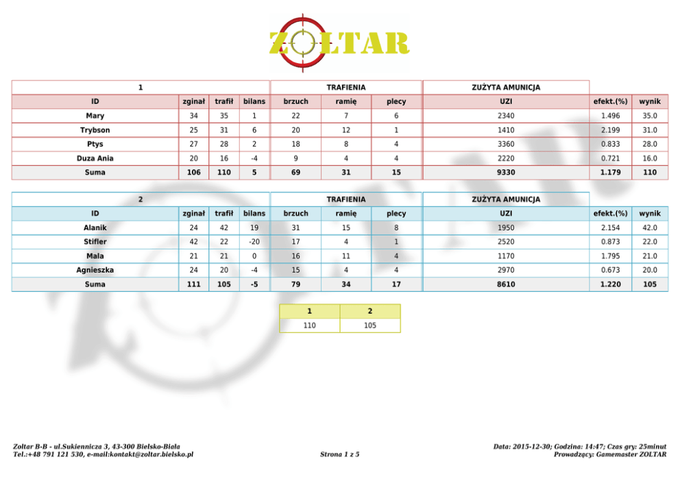 1 TRAFIENIA ZUŻYTA AMUNICJA ID zginał trafił bilans brzuch ramię plecy UZI efekt.(%) wynik Mary 34 35 1 22 7 6 2340 1.496 35.0 Trybson 25 31 6 20 12 1 1410 2.199 31.0 Ptys 27 28 2 18 8 4 3360 0.833 28.0 Duza Ania 20 16 -4 9 4 4 2220 0.721 16.0 Suma 106 110 5 69 31 15 9330 1.179 110 2 TRAFIENIA ZUŻYTA AMUNICJA ID zginał trafił bilans brzuch ramię plecy UZI efekt.(%) wynik Alanik 24 42 19 31 15 8 1950 2.154 42.0 Stifler 42 22 -20 17 4 1 2520 0.873 22.0 Mala 21 21 0 16 11 4 1170 1.795 21.0 Agnieszka 24 20 -4 15 4 4 2970 0.673 20.0 Suma 111 105 -5 79 34 17 8610 1.220 105 Zoltar B-B - ul.Sukiennicza 3, 43-300 Bielsko-Biała Tel.:+48 791 121 530, e-mail:[email protected] 1 2 110 105 Strona 1 z 5 Data: 2015-12-30; Godzina: 14:47; Czas gry: 25minut Prowadzący: Gamemaster ZOLTAR 1 TRAFIENIA ZUŻYTA AMUNICJA ID zginał trafił bilans brzuch ramię plecy UZI efekt.(%) wynik Mary 52 39 -13 26 8 6 3810 1.024 39.0 Ptys 40 36 -4 25 10 4 3630 0.992 36.0 Trybson 34 28 -6 20 4 4 1770 1.582 28.0 Duza Ania 39 22 -17 19 2 1 2640 0.833 22.0 Suma 165 125 -40 90 24 15 11850 1.055 125 2 TRAFIENIA ZUŻYTA AMUNICJA ID zginał trafił bilans brzuch ramię plecy UZI efekt.(%) wynik Alanik 36 66 30 47 27 18 2490 2.651 66.0 Mala 23 42 19 30 21 7 2100 2.000 42.0 Agnieszka 37 33 -4 24 5 5 3240 1.019 33.0 Stifler 29 24 -5 22 0 2 3660 0.656 24.0 Suma 125 165 40 123 53 32 11490 1.436 165 Zoltar B-B - ul.Sukiennicza 3, 43-300 Bielsko-Biała Tel.:+48 791 121 530, e-mail:[email protected] 2 1 165 125 Strona 2 z 5 Data: 2015-12-30; Godzina: 15:22; Czas gry: 25minut Prowadzący: Gamemaster ZOLTAR Drużyny Miejsce Nazwa Zoltar B-B - ul.Sukiennicza 3, 43-300 Bielsko-Biała Tel.:+48 791 121 530, e-mail:[email protected] Rozgrywki 1 2 Suma 2 105 165 270 1 110 125 235 Strona 3 z 5 Data: 2015-12-30 Prowadzący: Gamemaster ZOLTAR Zestawienie wg wyniku Miejsce TRAFIENIA ZUŻYTA AMUNICJA ID zginał trafił bilans brzuch ramię plecy UZI efekt.(%) wynik Alanik 72.00 129.60 57.60 93.60 50.40 31.20 5328.00 2.432 129.60 Mary 103.20 88.80 -14.40 57.60 18.00 14.40 7380.00 1.203 88.80 Ptys 80.40 76.80 -3.60 51.60 21.60 9.60 8388.00 0.916 76.80 4 Mala 52.80 75.60 22.80 55.20 38.40 13.20 3924.00 1.927 75.60 5 Trybson 70.80 70.80 0.00 48.00 19.20 6.00 3816.00 1.855 70.80 6 Agnieszka 73.20 63.60 -9.60 46.80 10.80 10.80 7452.00 0.853 63.60 7 Stifler 85.20 55.20 -30.00 46.80 4.80 3.60 7416.00 0.744 55.20 8 Duza Ania 70.80 45.60 -25.20 33.60 7.20 6.00 5832.00 0.782 45.60 Zestawienie wg bilansu Miejsce TRAFIENIA ZUŻYTA AMUNICJA ID zginał trafił bilans brzuch ramię plecy UZI efekt.(%) wynik Alanik 72.00 129.60 57.60 93.60 50.40 31.20 5328.00 2.432 129.60 Mala 52.80 75.60 22.80 55.20 38.40 13.20 3924.00 1.927 75.60 Trybson 70.80 70.80 0.00 48.00 19.20 6.00 3816.00 1.855 70.80 4 Ptys 80.40 76.80 -3.60 51.60 21.60 9.60 8388.00 0.916 76.80 5 Agnieszka 73.20 63.60 -9.60 46.80 10.80 10.80 7452.00 0.853 63.60 6 Mary 103.20 88.80 -14.40 57.60 18.00 14.40 7380.00 1.203 88.80 7 Duza Ania 70.80 45.60 -25.20 33.60 7.20 6.00 5832.00 0.782 45.60 8 Stifler 85.20 55.20 -30.00 46.80 4.80 3.60 7416.00 0.744 55.20 Zoltar B-B - ul.Sukiennicza 3, 43-300 Bielsko-Biała Tel.:+48 791 121 530, e-mail:[email protected] Strona 4 z 5 Data: 2015-12-30 Prowadzący: Gamemaster ZOLTAR Zestawienie wg efektywności Miejsce TRAFIENIA ZUŻYTA AMUNICJA ID zginał trafił bilans brzuch ramię plecy UZI efekt.(%) wynik Alanik 72.00 129.60 57.60 93.60 50.40 31.20 5328.00 2.432 129.60 Mala 52.80 75.60 22.80 55.20 38.40 13.20 3924.00 1.927 75.60 Trybson 70.80 70.80 0.00 48.00 19.20 6.00 3816.00 1.855 70.80 4 Mary 103.20 88.80 -14.40 57.60 18.00 14.40 7380.00 1.203 88.80 5 Ptys 80.40 76.80 -3.60 51.60 21.60 9.60 8388.00 0.916 76.80 6 Agnieszka 73.20 63.60 -9.60 46.80 10.80 10.80 7452.00 0.853 63.60 7 Duza Ania 70.80 45.60 -25.20 33.60 7.20 6.00 5832.00 0.782 45.60 8 Stifler 85.20 55.20 -30.00 46.80 4.80 3.60 7416.00 0.744 55.20 Zoltar B-B - ul.Sukiennicza 3, 43-300 Bielsko-Biała Tel.:+48 791 121 530, e-mail:[email protected] Strona 5 z 5 Data: 2015-12-30 Prowadzący: Gamemaster ZOLTAR