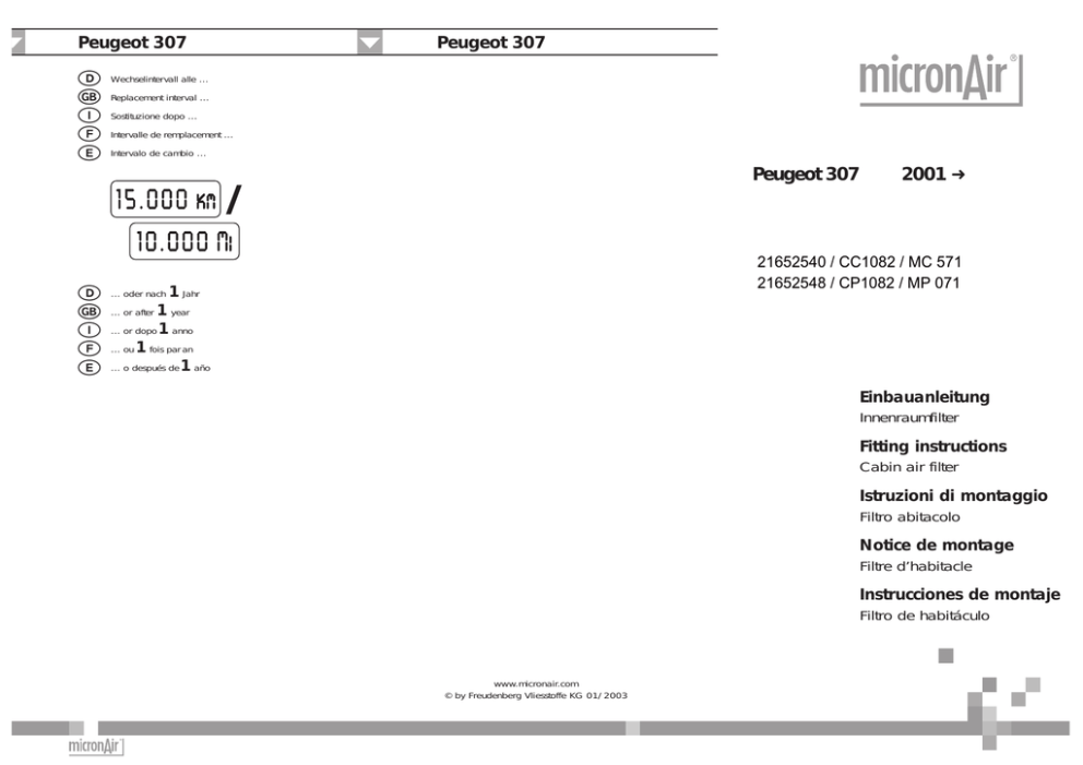 Peugeot 307 D G I F E D G I F E Peugeot 307 Wechselintervall alle … Replacement interval … Sostituzione dopo … Intervalle de remplacement … Intervalo de cambio … Peugeot 307 … oder nach … or after 2001 ➜ 21652540 / CC1082 / MC 571 21652548 / CP1082 / MP 071 1 Jahr 1 year 1 anno … or dopo MP 071 1 fois par an … o después de 1 año … ou MC 571 Einbauanleitung Innenraumfilter Fitting instructions Cabin air filter Istruzioni di montaggio Filtro abitacolo Notice de montage Filtre d’habitacle Instrucciones de montaje Filtro de habitáculo www.micronair.com © by Freudenberg Vliesstoffe KG 01/2003 Peugeot 307 Peugeot 307 Peugeot 307 AIR FLOW ➀ ➃ ➆ ➁ ➄ ➇ ➅ ➈ AIR FLOW ➂