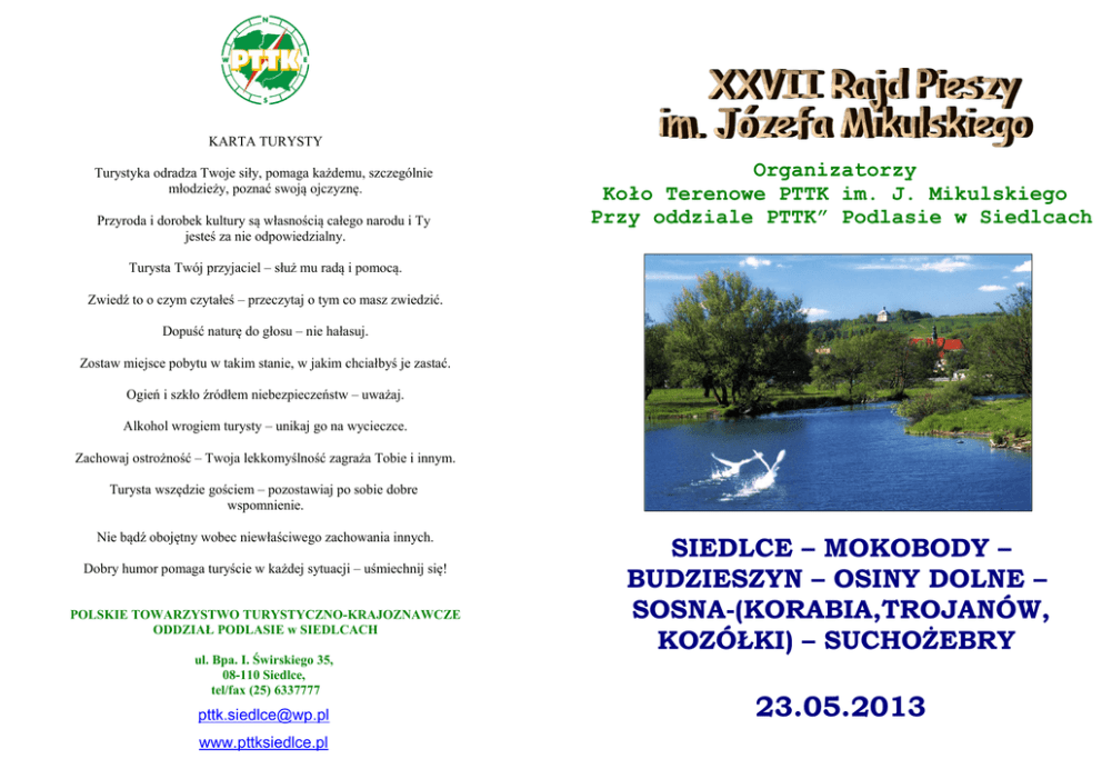 KARTA TURYSTY Turystyka odradza Twoje siły, pomaga każdemu, szczególnie młodzieży, poznać swoją ojczyznę. Przyroda i dorobek kultury są własnością całego narodu i Ty jesteś za nie odpowiedzialny. Organizatorzy Koło Terenowe PTTK im. J. Mikulskiego Przy oddziale PTTK” Podlasie w Siedlcach Turysta Twój przyjaciel – służ mu radą i pomocą. Zwiedź to o czym czytałeś – przeczytaj o tym co masz zwiedzić. Dopuść naturę do głosu – nie hałasuj. Zostaw miejsce pobytu w takim stanie, w jakim chciałbyś je zastać. Ogień i szkło źródłem niebezpieczeństw – uważaj. Alkohol wrogiem turysty – unikaj go na wycieczce. Zachowaj ostrożność – Twoja lekkomyślność zagraża Tobie i innym. Turysta wszędzie gościem – pozostawiaj po sobie dobre wspomnienie. Nie bądź obojętny wobec niewłaściwego zachowania innych. Dobry humor pomaga turyście w każdej sytuacji – uśmiechnij się! POLSKIE TOWARZYSTWO TURYSTYCZNO-KRAJOZNAWCZE ODDZIAŁ PODLASIE w SIEDLCACH ul. Bpa. I. Świrskiego 35, 08-110 Siedlce, tel/fax (25) 6337777 [email protected] www.pttksiedlce.pl SIEDLCE – MOKOBODY – BUDZIESZYN – OSINY DOLNE – SOSNA-(KORABIA,TROJANÓW, KOZÓŁKI) – SUCHOŻEBRY 23.05.2013 Przebieg Rajdu : Cel rajdu: popularyzacja turystyki pieszej poznawanie powiatów sąsiadującymi z Siedlcami popularyzacja miejsc związanych z życiem i działalnością Józefa Mikulskiego Termin i miejsce rajdu: Rajd odbędzie się 23 maja 2013 r. (czwartek) Siedlce – Mokobody – Budzieszyn – Osiny Dolne – Sosna-Korabia Sosna-Trojanów – Sosna Kozółki – Suchożebry Warunki uczestnictwa: - 8:45 - zbiórka uczestników o przed siedzibą biura PTTK - 9:00 – wyjazd na trasę Siedlce – Mokobody - krótkie zwiedzanie - przejście piesze z Mokobód do Budzieszyna - krótkie zwiedzanie - przejście z Budzieszyna do Osin Dolnych - zregenerowanie sił – posiłek - przejście do Sosna-Korabie - mała wzmianka o miejscowości – zwiedzanie - przejście do Sosna-Trojanów - podziwianie walorów turystycznych - przejście do Sosna-Kozółki - krótkie zwiedzanie - przejście do Suchożebr - powrót do Siedlec 1) W rajdzie biorą udział turyści indywidualni 2) wskazane jest posiadanie: Obowiązki uczestników: * książeczek turystyki pieszej oraz książeczek odznak krajoznawczych • przestrzeganie poleceń kierownictwa Rajdu * odpowiedniego stroju na trasę • przestrzeganie karty turysty * własnego posiłku * kieszonkowe na przejazd autobusem ... Postanowienia końcowe: - Rajd odbędzie się bez względu na pogodę - interpretacja Regulaminu należy do organizatora Komandor rajdu /-/ Krzysztof Kożuchowski