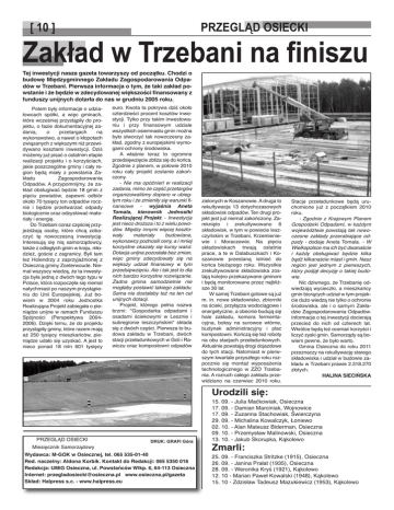 [ 10 ] PRZEGLĄD OSIECKI Zakład w Trzebani na finiszu Tej inwestycji nasza gazeta towarzyszy od początku. Chodzi o budowę Międzygminnego Zakładu Zagospodarowania Odpadów w Trzebani. Pierwsza informacja o tym, że taki zakład powstanie i że będzie w zdecydowanej większości finansowany z funduszy unijnych dotarła do nas w grudniu 2005 roku. Potem były informacje o udziałowcach spółki, a więc gminach, które wcześniej przystąpiły do projektu, o fazie dokumentacyjnej zadania, o przetargach na wykonawstwo, a nawet o kłopotach związanych z większymi niż przewidywano kosztami inwestycji. Dziś możemy już pisać o ostatnim etapie realizacji projektu i o korzyściach, jakie poszczególne gminy i cały region będą miały z powstania Zakładu Zagospodarowania Odpadów. A przypomnijmy, że zakład obsługiwać będzie 18 gmin z pięciu powiatów, zapewni odbiór około 70 tysięcy ton odpadów rocznie i będzie przetwarzać odpady biologicznie oraz odzyskiwać materiały i energię. Do Trzebani coraz częściej przyjeżdżają osoby, które chcą zobaczyć tę nowoczesną inwestycję. Interesują się nią samorządowcy, także z odległych gmin w kraju, młodzież, goście z zagranicy. Byli tam też Holendrzy z zaprzyjaźnionej z Osieczną gminy Zoeterwoude. Niemal wszyscy wiedzą, że ta inwestycja była jedną z dwóch tego typu w Polsce, która rozpoczęła się niemal natychmiast po naszym przystąpieniu do Unii Europejskiej. Już bowiem w 2004 roku Jednostka Realizująca Projekt zabiegała o pieniądze unijne w ramach Funduszu Spójności (Perspektywa 20042006). Dzięki temu, że do projektu przystąpiły gminy, które razem mają aż 250 tysięcy mieszkańców, pieniądze udało się uzyskać. A jest to nieco ponad 18 mln 601 tysięcy euro. Kwota ta pokrywa dziś około czterdzieści procent kosztów inwestycji. Tylko przy takim inwestowaniu i przy finansowym udziale wszystkich osiemnastu gmin można było stworzyć tak nowoczesny zakład, zgodny z europejskimi wymogami ochrony środowiska. A właśnie teraz to ogromne przedsięwzięcie zbliża się do końca. Zgodnie z planem, w połowie 2010 roku cały projekt zostanie zakończony. - Nie ma opóźnień w realizacji zadania, mimo że część przetargów organizowaliśmy dopiero w ubiegłym roku i że zmieniły się warunki finansowe - wyjaśnia Aneta Tomala, kierownik Jednostki Realizującej Projekt. - Inwestycja jest nieco droższa i to z wielu powodów. Między innymi więcej kosztowały materiały budowlane, wykonawcy podnosili ceny, a i mniej korzystne okazały się kursy walut. Dotacja unijna pozostała bez zmian, więc gminy zdecydowały się na większy udział finansowy w tym przedsięwzięciu. Ale i tak jest to dla nich bardzo korzystne rozwiązanie. Żadna gmina samodzielnie nie mogłaby postawić takiego zakładu. Sama nie dostałaby też na ten cel unijnych dotacji. Projekt, którego pełna nazwa brzmi: "Gospodarka odpadami i osadami ściekowymi w Lesznie i subregionie leszczyńskim" składa się z dwóch części. Pierwsza to budowa zakładu w Trzebani, dwóch stacji przeładunkowych w Goli i Rawiczu oraz kompostowni odpadów zielonych w Koszanowie. A druga to rekultywacja 13 dotychczasowych składowisk odpadów. Ten drugi projekt jest już niemal zakończony. Zamknięto i zrekultywowano 6 składowisk, w tym w powiecie leszczyńskim w Trzebani, Krzemieniewie i Moraczewie. Na pięciu składowiskach trwają ostatnie prace, a te w Dalabuszkach i Koszanowie przestaną istnieć do końca bieżącego roku. Wszystkie zrekultywowane składowiska zostają kolejno przekazywane gminom i będą monitorowane przez najbliższe 30 lat. W samej Trzebani gotowe są już m. in. nowe składowisko, zbiorniki na ścieki, przyłącza wodociągowe i energetyczne, a obecnie budują się hale zakładu, komora fermentacyjna, boksy na surowce wtórne, budynek administracyjny i plac kompostowni. Kończą się też roboty na obu stacjach przeładunkowych. Aktualnie powstają drogi dojazdowe do tych stacji. Natomiast w pierwszym kwartale przyszłego roku rozpocznie się montaż wyposażenia technologicznego w ZZO Trzebania. A rozruch całego zakładu przewidziano na czerwiec 2010 roku. Urodzili się: PRZEGLĄD OSIECKI Miesięcznik Samorządowy DRUK: GRAFI Góra Wydawca: M-GOK w Osiecznej, tel. 065 535-01-40 Red. naczelny: Aldona Korbik. Kontakt do Redakcji: 065 5350 016 Redakcja: UMiG Osieczna, ul. Powstańców Wlkp. 6, 64-113 Osieczna Internet: [email protected] www.osieczna.pl/gazeta Skład: Halpress s.c. - www.halpress.eu Stacje przeładunkowe będą uruchomione już z początkiem 2010 roku. - Zgodnie z Krajowym Planem Gospodarki Odpadami, w każdym województwie powstają tak nowoczesne zakłady przerabiające odpady - dodaje Aneta Tomala. - W Wielkopolsce ma ich być dwanaście i każdy obsługiwać będzie kilka bądź kilkanaście miast i gmin. Nasz region jest jednym z pierwszych, który podjął decyzję o takiej budowie. Nic dziwnego, że Trzebanię odwiedzają wycieczki, a mieszkańcy gmin biorących udział w tym projekcie dużo wiedzą nie tylko o ochronie środowiska, ale i o samym Zakładzie Zagospodarowania Odpadów. Informacje o tej inwestycji docierają przecież do nich od czterech lat. Wkrótce będą też oceniać korzyści i liczyć zyski gmin. Samorządy są bowiem pewne, że było warto. Gmina Osieczna do roku 2011 przeznaczy na rekultywację starego składowiska i udział w budowie zakładu w Trzebani prawie 2.318.270 złotych. HALINA SIECIŃSKA 15. 09. - Julia Maćkowiak, Osieczna 17. 09. - Damian Marciniak, Wojnowice 17. 09. - Zuzanna Stachowiak, Świerczyna 29. 09. - Michalina Kowalczyk, Łoniewo 02. 10. - Alan Mateusz Biderman, Osieczna 09. 10. - Przemysław Malinowski, Osieczna 13. 10. - Jakub Skorupka, Kąkolewo Zmarli: 25. 09. - Franciszka Stritzke (1915), Osieczna 26. 09. - Janina Prałat (1935), Osieczna 28. 09. - Weronika Kryś (1921), Kąkolewo 12. 10 - Marian Paweł Kowalski (1948), Kąkolewo 