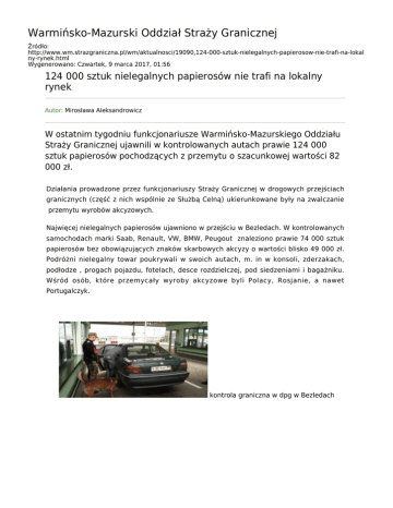 Warmińsko-Mazurski Oddział Straży Granicznej Źródło: http://www.wm.strazgraniczna.pl/wm/aktualnosci/19090,124-000-sztuk-nielegalnych-papierosow-nie-trafi-na-lokal ny-rynek.html Wygenerowano: Czwartek, 9 marca 2017, 01:56 124 000 sztuk nielegalnych papierosów nie trafi na lokalny rynek Autor: Mirosława Aleksandrowicz W ostatnim tygodniu funkcjonariusze Warmińsko-Mazurskiego Oddziału Straży Granicznej ujawnili w kontrolowanych autach prawie 124 000 sztuk papierosów pochodzących z przemytu o szacunkowej wartości 82 000 zł. Działania prowadzone przez funkcjonariuszy Straży Granicznej w drogowych przejściach granicznych (część z nich wspólnie ze Służbą Celną) ukierunkowane były na zwalczanie przemytu wyrobów akcyzowych. Najwięcej nielegalnych papierosów ujawniono w przejściu w Bezledach. W kontrolowanych samochodach marki Saab, Renault, VW, BMW, Peugout znaleziono prawie 74 000 sztuk papierosów bez obowiązujących znaków skarbowych akcyzy o wartości blisko 49 000 zł. Podróżni nielegalny towar poukrywali w swoich autach, m. in w konsoli, zderzakach, podłodze , progach pojazdu, fotelach, desce rozdzielczej, pod siedzeniami i bagażniku. Wśród osób, które przemycały wyroby akcyzowe byli Polacy, Rosjanie, a nawet Portugalczyk. kontrola graniczna w dpg w Bezledach
