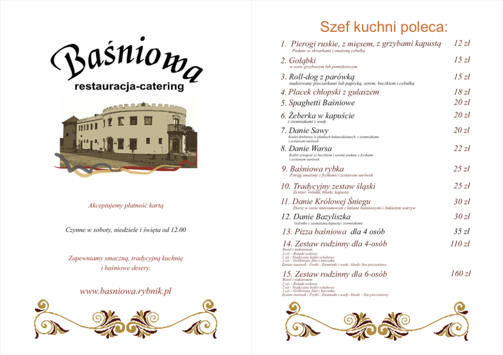 Szef kuchni poleca: 1. Pierogi ruskie, z mięsem, z grzybami kapustą 12 zł Podane ze skwarkami i smażoną cebulką 2. Gołąbki 15 zł w sosie grzybowym lub pomidorowym 3. Roll-dog z parówką 15 zł nadziewany pieczarkami lub papryką, serem, boczkiem i cebulką 4. Placek chłopski z gulaszem 5. Spaghetti Baśniowe 18 zł 20 zł 6. Żeberka w kapuście 20 zł 7. Danie Sawy 20 zł z ziemniakami z wody Kotlet drobiowy w płatkach kukurydzianych, z ziemniakami i zestawem surówek 8. Danie Warsa 22 zł Kotlet szwajcar (z boczkiem i serem) podany z frytkami i zestawem surówek 9. Baśniowa rybka 25 zł Pstrąg smażony z frytkami i zestawem surówek 10. Tradycyjny zestaw śląski 25 zł 11. Danie Królowej Śniegu 30 zł Zestaw: rolada, kluski, kapusta Akceptujemy płatność kartą Dorsz w sosie śmietanowym z kulami baśniowymi i bukietem warzyw 12. Danie Bazyliszka 30 zł Golonko z zasmażaną kapustą i ziemniakami Czynne w soboty, niedziele i święta od 12.00 Zapewniamy smaczną, tradycyjną kuchnię i baśniowe desery. www.basniowa.rybnik.pl 13. Pizza baśniowa dla 4 osób 14. Zestaw rodzinny dla 4-osób 35 zł 110 zł 15. Zestaw rodzinny dla 6-osób 160 zł Rosół z makaronem 2 szt. - Rolada wołowa 1 szt - Tradycyjny kotlet schabowy 1 szt. - Grillowany filet z kurczaka Zestaw surówek - Frytki - Ziemniaki z wody - kluski- Sos pieczeniowy Rosół z makaronem 2 szt. - Rolada wołowa 2 szt - Tradycyjny kotlet schabowy 2 szt. - Grillowany filet z kurczaka Zestaw surówek - Frytki - Ziemniaki z wody - kluski - Sos pieczeniowy , Zupy Przystawki 1. Talizmany z tatarem 8 zł Chrupiące grzanki podane ze świeżym tatarem, ogórkiem i cebulką 2. Przysmak rycerski Smażony Camember podany z soczystą żurawiną 8 zł 9 zł 4. Przysmak szlachecki 8 zł 5. Roladki z szynki 8 zł Tosty z sosem śmietanowo-kurkowym Faszerowane dipem serowo-chrzanowym z grzanką 5 zł 7 zł Podana z makaronem Ziemniaki w łupinkach z pieczarkami zapieczone serem 3. Serowy gaj 1. Barszcz czerwony 2. Zupa pomidorowa 3. Rosół z makaronem 4. Żurek 7 zł 9 zł Podany z kiełbasą i jajkiem w koszulce 5. Zupa gulaszowa 6. Flaczki 7. Barszcz z krokietem 9 zł 9 zł 10 zł Miesa 1. Kotlet drobiowy 2. Kotlet schabowy 3. Kotlet schabowy z pieczarkami 4. De volaille 5. Drobiowe łódeczki Dodatki 12 zł 12 zł 15 zł 15 zł 16 zł nadziewane brokułami i warzywami 6. Złociste udko z kaczki Sakiewka z indyka 7. nadziewana serem i pieczarkami 9. Szyszki z kurczaka pierś w płatkach kukurydzianych 16 zł 16 zł 16 zł 16 zł 10. Łopatka szpikowana boczkiem 11. Rolada wieprzowa 16 zł 12. Polędwiczki wieprzowe 18 zł w sosie grzybowym 13. Rolada wołowa z kaczki 14. wPierś boczku z jabłkiem i pomarańczą na kremie brokułowym 18 zł 20 zł 15. Peklowana pierś z kurczaka 20 zł 16. Sznycel po wiedeńsku 22 zł 17. Pieczeń z karczku 25 zł 18. Stek wołowy 40 zł w sosie majonezowym szynka wieprzowa z jajkiem sadzonym w sosie pieczeniowym 1. Ziemniaki opiekane 2. Ziemniaki z wody 3. Ziemniaki puree 4. Kule baśniowe 5. Frytki 6. Kluski śląskie 7. Buraki 8. Surówka baśniowa 9. Kapusta zasmażana 10. Kapusta czerwona 11. Bukiet warzyw 12. Sałata zielona na śmietanie 13. Surówka z marchwi i pomarańczy 14. Mizeria 15. Zielona surówka z ogórkiem i koperkiem 16. Warzywa zasmażane 17. Zestaw surówek 18. Ketchup 30g 19. Musztarda 30g 20. Pieczywo 100g 21. Masło 22. Sos czosnkowy 150g 4 zł 4 zł 4 zł 5 zł 5 zł 5 zł 5 zł 6 zł 6 zł 6 zł 6 zł 6 zł 6 zł 6 zł 6 zł 6 zł 7 zł 1 zł 1 zł 2 zł 2 zł 3 zł Dania dla dzieci: Sał£££latki 1. Zupa Bajkowa 1. Tortelini makaron tortellini, ogórek konserwowy, kukurydza, por, sos majonezowy 2. Sałatka grecka 14 zł sałata, pomidorki koktaliowe, ogórek, papryka, oliwki, ser feta, sos winegret 3. Sałatka Calineczki z kurczakiem 15 zł sałata, kurczak, pomidor, papryka, ogórek, kukurydza, sos do wyboru: winegret lub czosnkowy zupa jarzynowa z wkładką z kurczaka 2. Złota Rybka 15 zł 9 zł 12 zł fileciki rybne w złotej panierce z frytkami, surówką z marchwii i pomarańczy 3. Danie Rozbójników 12 zł pulpeciki w sosie koperkowym lub pomidorowym, z ziemniakami i buraczkami 4. Danie Krasnoludków panierowana pierś z kurczaka z frytkami, surówką z marchwii i pomarańczy 12 zł Dania bezglutenowe Desery 8 zł 1. Krem pieczarkowy 15 zł 2. Gnocchi w sosie pomidorowym 3. Pulpety drobiowe w bulionie warzywnym 18 zł 18 zł 4. Naleśnik z kurczakiem Dania dla diabetykóóow 1. Danie drwala 10 zł Owoce sezonowe 10 zł 12 zł Lody trzy smaki, bita śmietana i owoce 26 zł 8. Deser Pinokio 15 zł Banan w cieście smażony z bitą śmietaną, lodami i owocami 8 zł 15 zł w sosie koperkowym z ryżem z warzywami i roszponką 10 zł 10 zł Naleśnik z nutellą i bananami obsypany prażonymi orzechami 30 zł Dania Wegetariañnskie 3. Zapiekanka makaronowo-warzywna 4. Dorsz grillowany 3. Deser dnia z kawą 4. Elfowy naleśnik 6. Kawa mrożona 7.Lody jak z baśni Dorsz z grilla z duszonymi warzywami. 1. Krem z brokułów 2. Gołąbki warzywne 6 zł 9 zł Bezy z bitą śmietaną i owocami sezonowymi 5. Koktajl owocowy Gotowane paluchy z indyka w ziołach prowansalskich z serem Ziemniaki z wody, buraki na ciepło 3. Danie Atlantydy 2. Cesarska beza 30 zł Polędwiczki duszone z cebulką i francuską musztardą Ziemniaki puree, surówka dnia. 2. Danie Palucha 1. Rurki z bitą śmietaną 15 zł 30 zł 9. Deser owocowo-jogurtowy 10. Szarlotka na ciepło z lodami 11. Racuchy z jabłkami, 15 zł 15 zł 15 zł musem owocowym i bitą śmietaną 12. Deser bezglutenowy 15 zł 13.Deser Czerwonego Kapturka Mus owocowy z bitą śmietaną i lodami . 16 zł Placuszki kukurydziane z musem truskawkowym Alkohole Napoje zimne 1. Soki owocowe 0,2l 4 zł Sok pomarańczowy, sok jabłkowy, nektar z czarnej porzeczki, nektar grapefriutowy, sok pomidorowy 2. Woda niegazowana/gazowana 0,5l 3. Napoje firmy Pepsi Cola 0,2l 4 zł 4 zł Pepsi, Mirinda, 7UP, Lipton ICE 4. Napoje firmy Peps