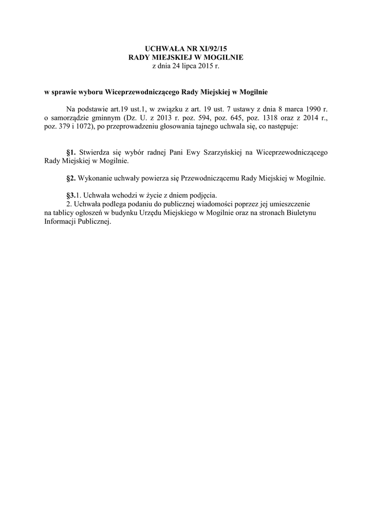 UCHWAŁA NR XI/92/15 RADY MIEJSKIEJ W MOGILNIE z dnia 24 lipca 2015 r. w sprawie wyboru Wiceprzewodniczącego Rady Miejskiej w Mogilnie Na podstawie art.19 ust.1, w związku z art. 19 ust. 7 ustawy z dnia 8 marca 1990 r. o samorządzie gminnym (Dz. U. z 2013 r. poz. 594, poz. 645, poz. 1318 oraz z 2014 r., poz. 379 i 1072), po przeprowadzeniu głosowania tajnego uchwala się, co następuje: §1. Stwierdza się wybór radnej Pani Ewy Szarzyńskiej na Wiceprzewodniczącego Rady Miejskiej w Mogilnie. §2. Wykonanie uchwały powierza się Przewodniczącemu Rady Miejskiej w Mogilnie. §3.1. Uchwała wchodzi w życie z dniem podjęcia. 2. Uchwała podlega podaniu do publicznej wiadomości poprzez jej umieszczenie na tablicy ogłoszeń w budynku Urzędu Miejskiego w Mogilnie oraz na stronach Biuletynu Informacji Publicznej. UZASADNIENIE DO UCHWAŁY NR XI/92/15 RADY MIEJSKIEJ W MOGILNIE z dnia 24 lipca 2015 r. w sprawie wyboru Wiceprzewodniczącego Rady Miejskiej w Mogilnie Ponieważ, na X sesji Rady Miejskiej w Mogilnie, która odbyła się 19 czerwca br., rada podjęła między innymi uchwałę, o odwołaniu radnego z funkcji wiceprzewodniczącego rady. Na sesji zwołanej przez wojewodę dnia 24 lipca br. radni poszerzyli porządek obrad wprowadzając punkt dotyczący przeprowadzenia wyboru wiceprzewodniczącego rady (art. 19 ust. 7 ustawy z dnia 8 marca 1990 r. o samorządzie gminnym). Stosownie do art.19 ust. 1 ustawy z dnia 8 marca 1990 r. o samorządzie gminnym radni wybierają ze swego grona wiceprzewodniczącego rady bezwzględną większością głosów w obecności co najmniej połowy ustawowego składu rady, w głosowaniu tajnym. W wyniku przeprowadzonej procedury głosowania podjęto niniejszą uchwałę dot. wyboru wiceprzewodniczącego rady.