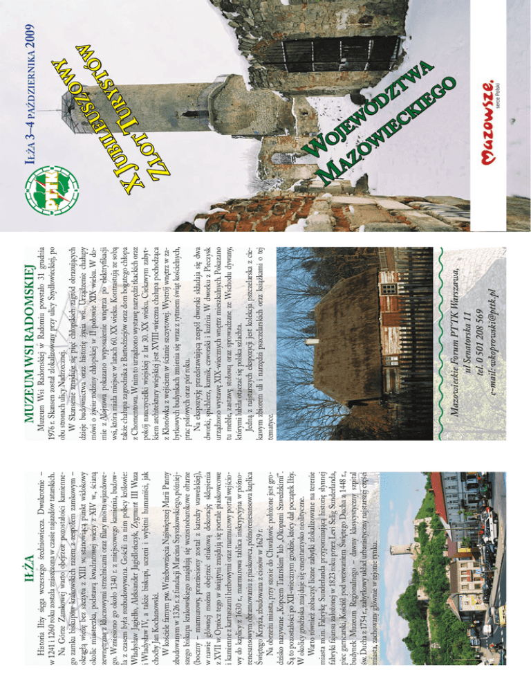 Mazowieckie Forum PTTK Warszawa, ul Senatorska 11 tel. 0 501 208 569 e-mail: [email protected] MUZEUM WSI RADOMSKIEJ Muzeum Wsi Radomskiej w Radomiu powstało 31 grudnia 1976 r. Skansen został zlokalizowany przy ulicy Szydłowieckiej, po obu stronach ulicy Nadrzecznej. W Skansenie znajduje się pięć chłopskich zagród obrazujących dzieje budownictwa oraz historię życia wsi. Urządzenie chałupy mówi o życiu rodziny chłopskiej w II połowie XIX wieku. W domie z Alojzowa pokazano wyposażenie wnętrza po elektryfikacji wsi, która miała miejsce w latach 60. XX wieku. Kontrastują ze sobą także chałupa zagrodnika z Bartodziejów oraz dom bogatego chłopa z Chomentowa. W nim to urządzono wystawę narzędzi tkackich oraz pokój nauczycielki wiejskiej z lat 30. XX wieku. Ciekawym zabytkiem architektury wiejskiej jest XVIII-wieczna chałupa pochodząca z Kłonówka z wejściem w ścianie szczytowej. Wystrój wnętrz w zabytkowych budynkach zmienia się wraz z rytmem świąt kościelnych, prac polowych oraz pór roku. Na ekspozycję przedstawiającą zespół dworski składaja się dwa dworki, spichlerz, kurnik, czworaki i kuźnia. W dworku z Pieczysk urządzono wystawę XIX-wiecznych wnętrz mieszkalnych. Pokazano tu meble, zastawę stołową oraz sprowadzane ze Wschodu dywany, którymi lubiła otaczać się polska szlachta. Jedną z najstarszych ekspozycji jest kolekcja pszczelarska z ciekawym zbiorem uli i narzędzi pszczelarskich oraz książkami o tej tematyce. IŁŻA Historia Iłży sięga wczesnego średniowiecza. Dwukrotnie – w 1241 i 1260 roku została zniszczona w czasie najazdów tatarskich. Na Górze Zamkowej warto obejrzeæ pozostałości kamiennego zamku biskupów krakowskich razem z zespołem zamkowym – okrągłą wieżę bez szczytu z XIII w. stanowiącą punkt widokowy okolic miasteczka, podstawą kwadratowej wieży z XIV w., ścianą zewnętrzną z kluczowymi strzelnicami oraz filary mostu wjazdowego. Wzniesiono go około 1340 r. z miejscowego kamienia, budowla z czasem była rozbudowywana. Gościli na nim polscy królowie: Władysław Jagiełło, Aleksander Jagiellończyk, Zygmunt III Waza i Władysław IV, a także biskupi, uczeni i wybitni humaniści, jak choćby Jan Kochanowski. W kościele farnym pw. Wniebowzięcia Najświętszej Marii Panny zbudowanym w 1326 r. z fundacji Marcina Szyszkowskiego, późniejszego biskupa krakowskiego znajdują się wczesnobarokowe ołtarze (boczny – marmurowy, przeniesiony został z katedry wawelskiej), w nawie głównej można obejrzeć stiukową dekorację sklepienia z XVII w. Oprócz tego w świątyni znajdują się portale piaskowcowe i kamienne z kartuszami herbowymi oraz marmurowy portal wejściowy do kaplicy z 1630 r., marmurowa tablica inskrypcyjna w późnorenesansowym obramowaniu z piaskowca, późnorenesansowa kaplica Świętego Krzyża, zbudowana z ciosów w 1629 r. Na obrzeżu miasta, przy szosie do Chwałowic położone jest grodzisko nazywane „Kopcem Tatarskim” lub „Okopami Szwedzkimi”. Są to pozostałości po XII-wiecznym grodzie, który dał początek Iłży. W okolicy grodziska znajduje się cmentarzysko neolityczne. Warto również zobaczyć liczne zabytki zlokalizowane na terenie miasta m.in. Fabrykę Sunderlanda przypominającą historię słynnej fabryki fajansu założonej w 1823 roku przez Levi Selig Sunderlanda, piec garncarski, Kościół pod wezwaniem Świętego Ducha z 1448 r., budynek Muzeum Regionalnego – dawny klasycystyczny szpital św. Ducha z 1754 r., zabytkowy układ urbanistyczny najstarszej części miasta, zachowany głównie w rejonie rynku. Z SZ W U Ó E T L S I Y R UB U J X TT LO Y W O IŁŻA 3–4 PAŹDZIERNIKA 2009 A W ZT EGO D I Ó K W EC E I J O W W AZO M 4 października 2009 (niedziela): • program krajoznawczy – zwiedzanie Muzeum Regionalnego w Iłży, wejście na zamek oraz na basztę widokową; • spacer po uliczkach Iłży; • zakończenie zlotu, wręczenie wyróżnień w konkursach; • program krajoznawczy na trasie powrotu do miejsca zmieszkania. 3 października 2009 (sobota): • zlot gwiaździsty (autokary, samochody osobowe) turystów z województwa mazowieckiego w Muzeum Wsi Radomskiej w Radomiu, ul. Szydłowiecka 30 (zwiedzanie od godz. 10.30–12.00), • uroczyste otwarcie Zlotu (godz. 12.30), wręczenie wyróżnień i listów gratulacyjnych Marszałka Województwa, wystąpienia organizatorów i zaproszonych gości; • piknik turystyczny „Stół Radomski” (godz. 13.00), prezentacja LOT-ów i PTTK, ognisko turystyczne; • konkursy dla uczestników Zlotu; • przejazd do Skaryszewa z przewodnikiem (15.15) na koncert Stuletniej Orkiestry Dętej OSP w Skaryszewie; • przejazd do Iłży z przewodnikiem (na 16.30); • przejazd pociągiem wąskotorowym z Iłży do Marcul; • gorący posiłek „Bie Siada Leśni Czego” (godz. 17.30); IV. Program zlotu: III. Współorganizatorzy: • Muzeum Wsi Radomskiej; • Urząd Miasta i Gminy w Skaryszewie; • Związek Gmin „Nad Iłżanką”. II. Organizatorzy: • Departament Kultury, Promocji i Turystyki Urzędu Marszałkowskiego Województwa Mazowieckiego; • Mazowieckie Forum Oddziałów PTTK; • Oddział Miejski PTTK im. ks. Jana Wiśniewskiego w Radomiu. I. Termin: 3–4 października 2009 r. REGULAMIN ZLOTU Impeza pod honorowym patronatem Marszałka Województwa Mazowieckiego 120 zł 60 zł 120 130 Ilość miejsc VIII. Kierownictwo zlotu: kierownik zlotu – Dariusz M. Zając; kierownik tras – Irena Wiernicka; sekretariat – Katarzyna Ludwińska; kwatermistrz – Marek Jezierski; etap InO – Bogusław Ciastek. VII. Konkursy i atrakcje: 1. Konkurs niespodzianka (indywidualny). 2. Konkurs krajoznawczo-historyczny o terenach zlotowych (indywidualny). 3. InO-etap po Iłży lub Skansenie (zespołowy). UWAGA!: Ilość miejsc ograniczona pojemnością bazy noclegowej (domki – warto wziąć dogrzewanie). O kolejności przyjmowania na Zlot decyduje termin wpłaty wpisowego. Wpisowe wpłacane po 